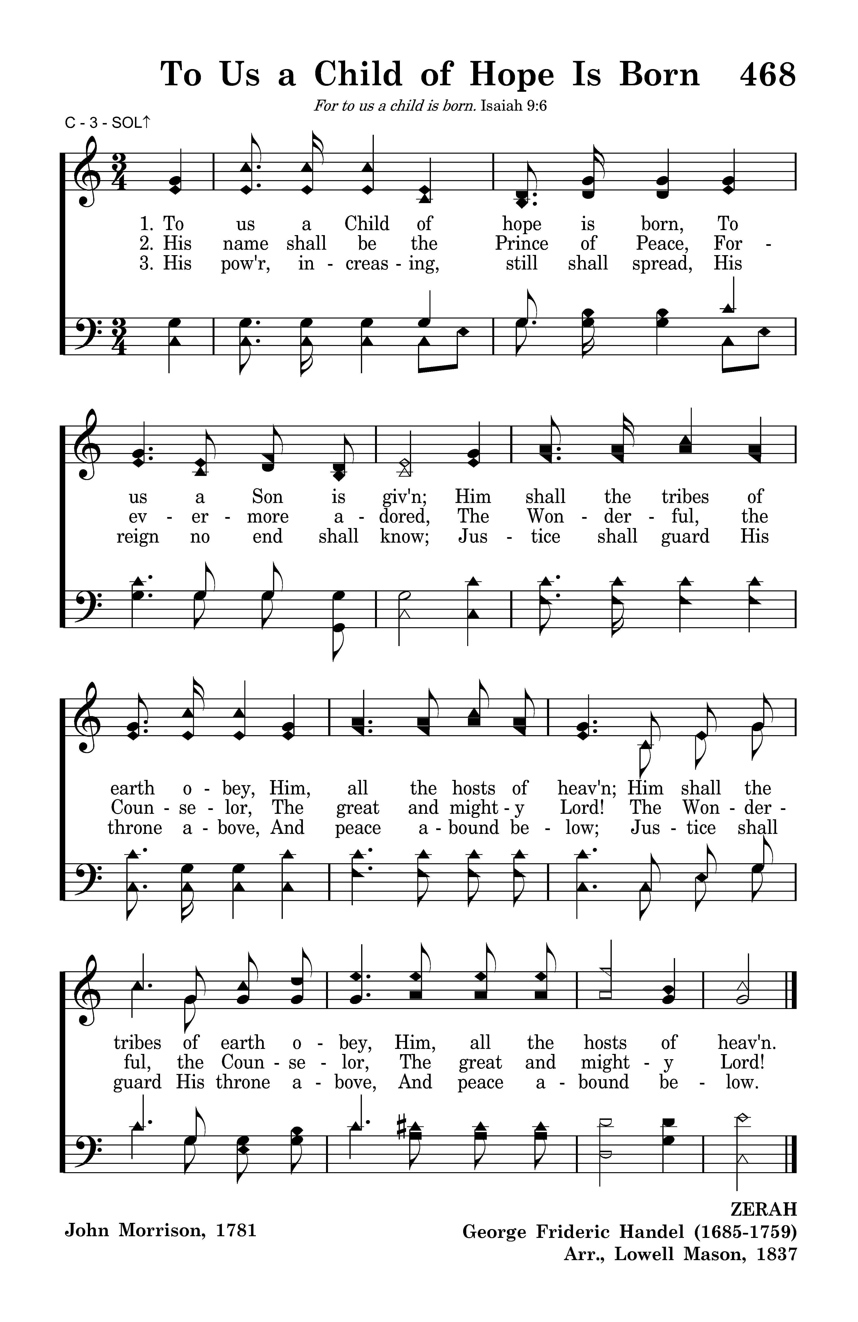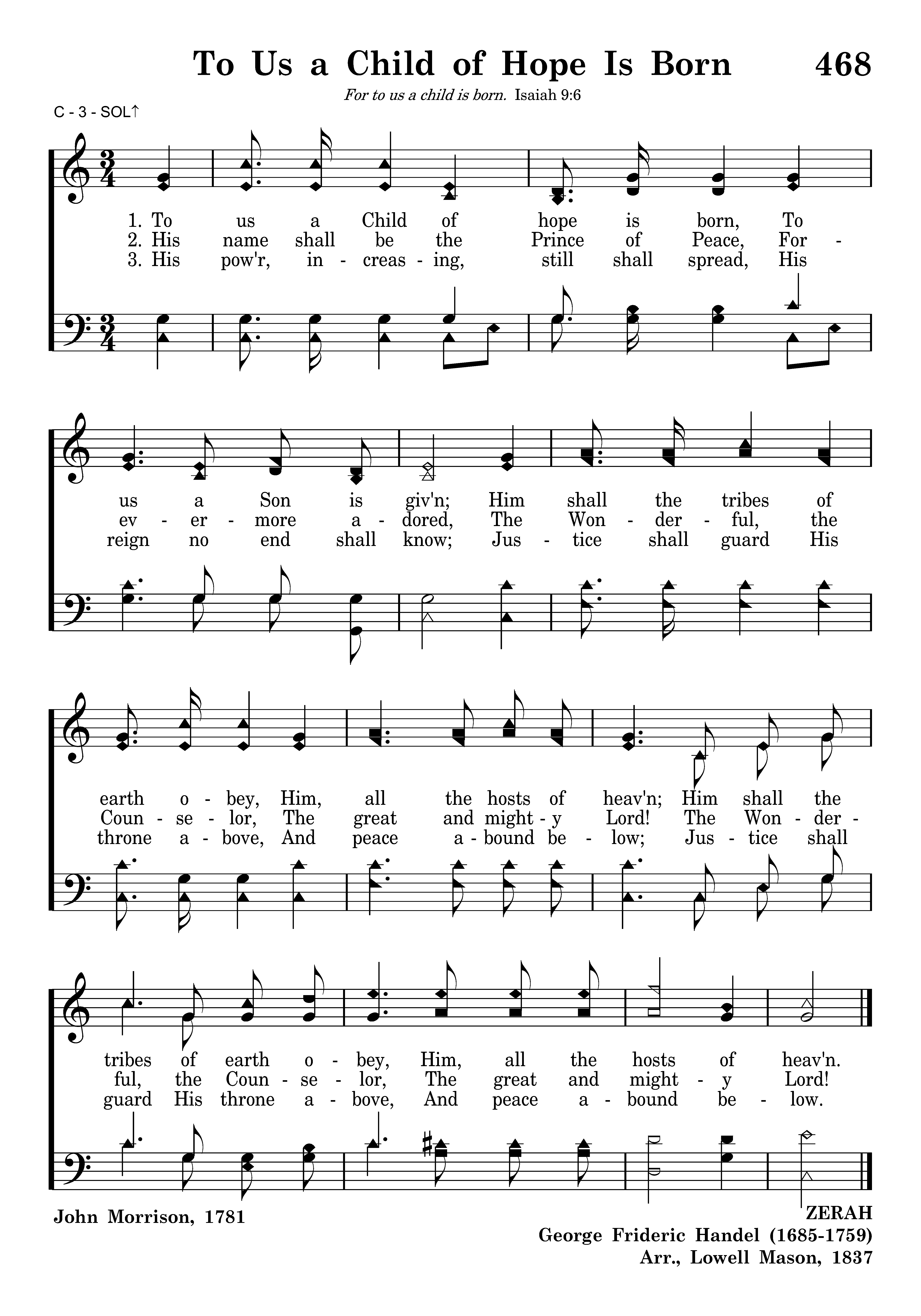 To us a Child of hope is born, To us a Son is giv'n; Him shall the tribes of earth obey, Him, all the hosts of heav'n; Him shall the tribes of earth obey, Him, all the hosts of heav'n.