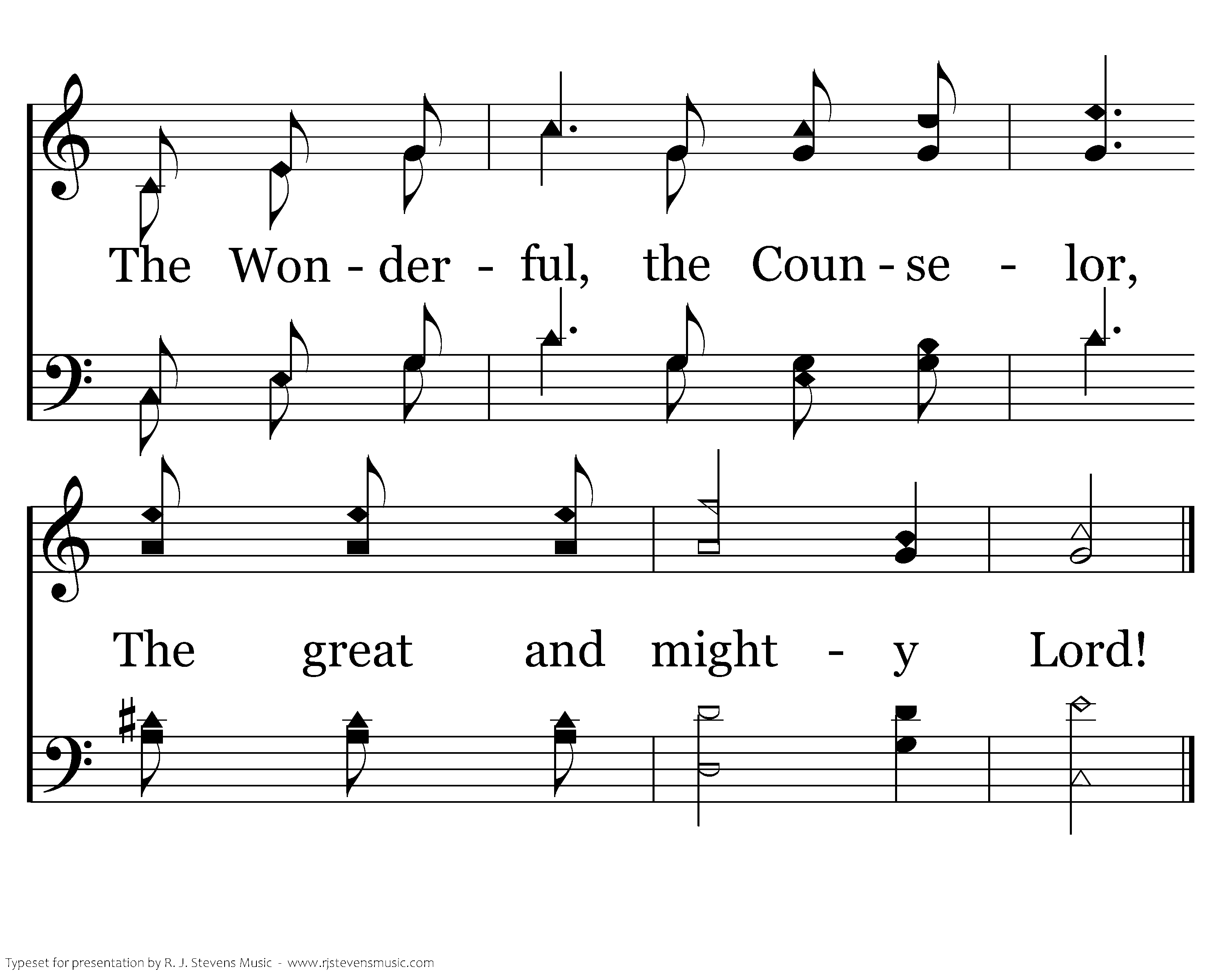 His name shall be the Prince of Peace, Forevermore adored, The Wonderful, the Counselor, The great and mighty Lord! The Wonderful, the Counselor, The great and mighty Lord!