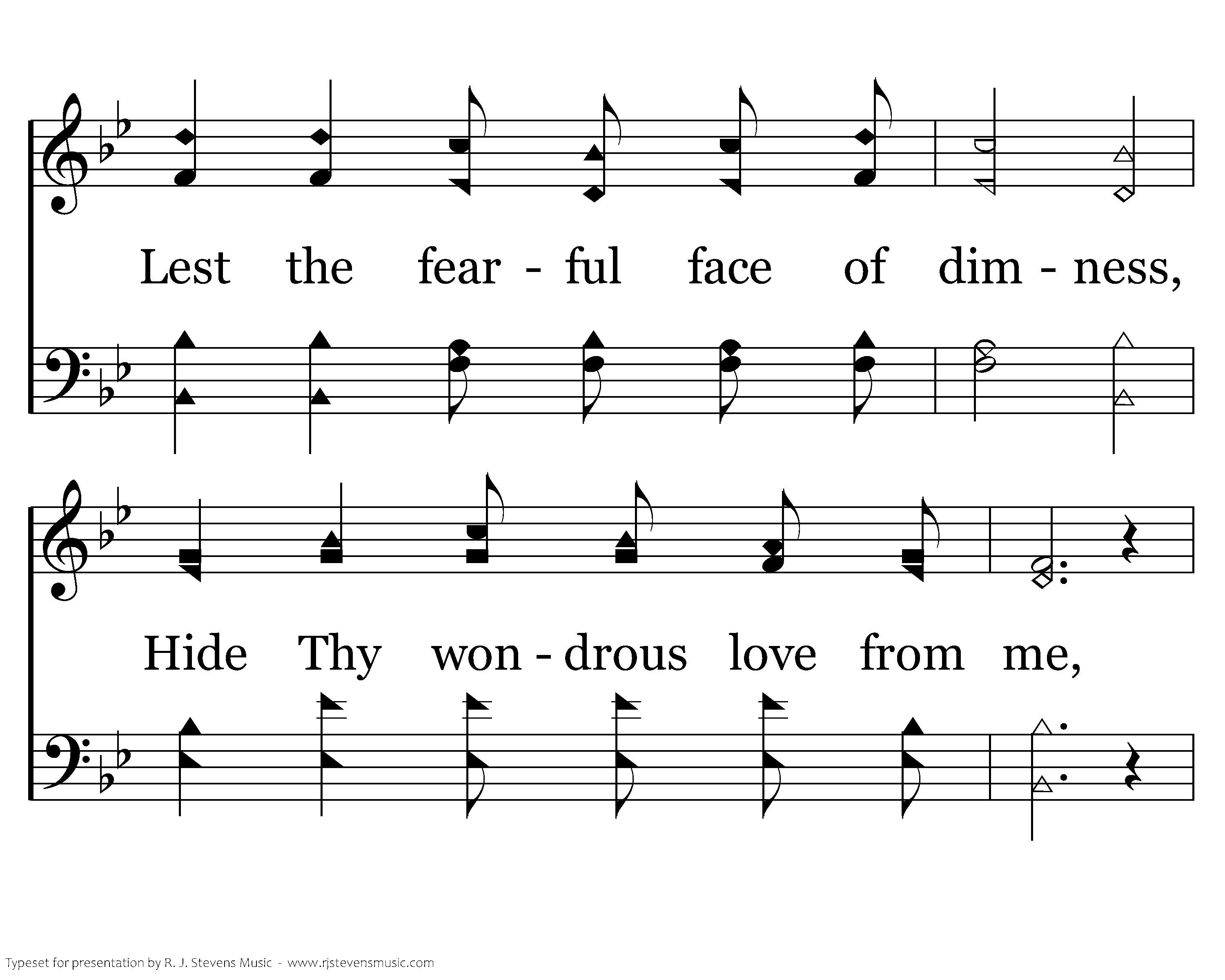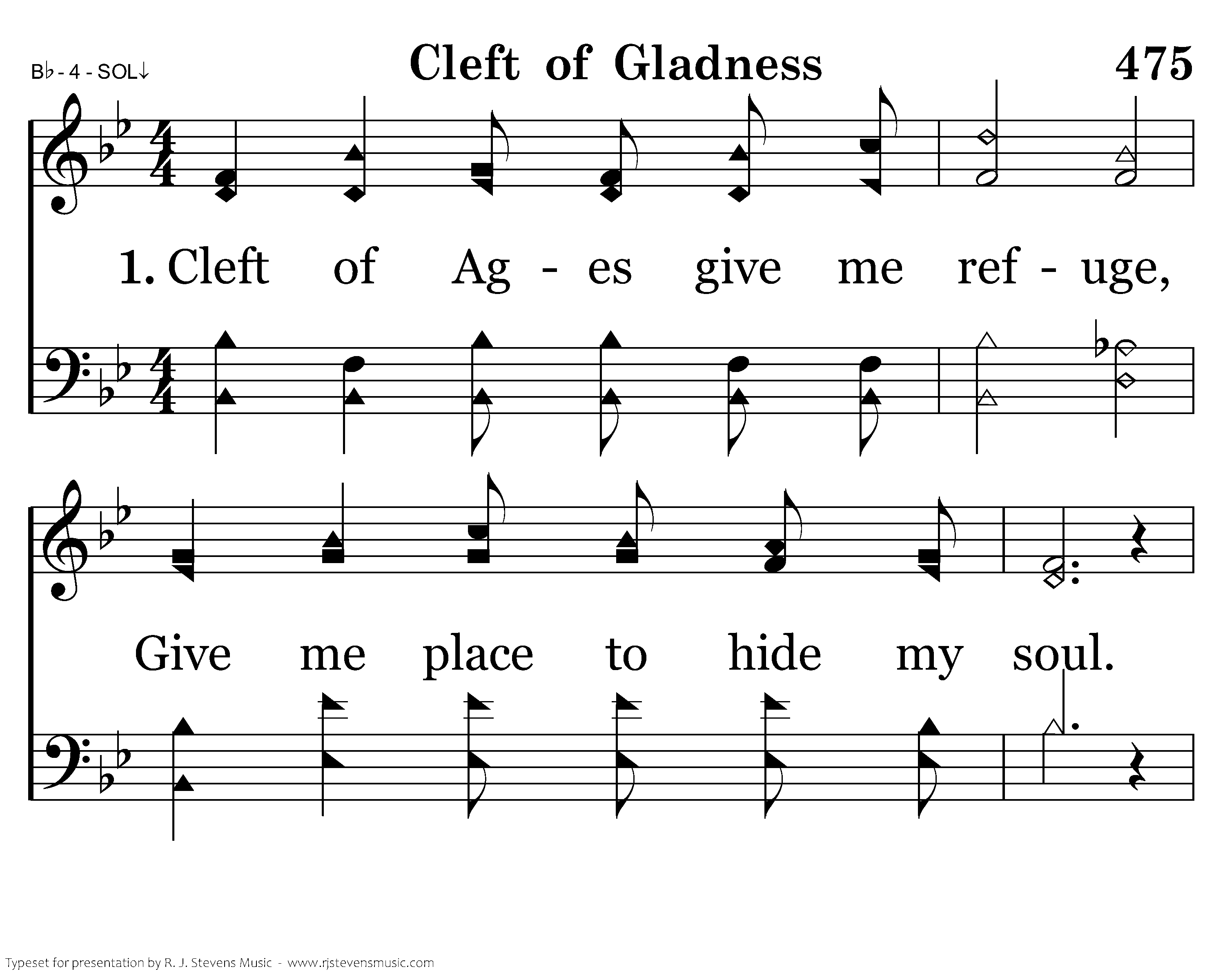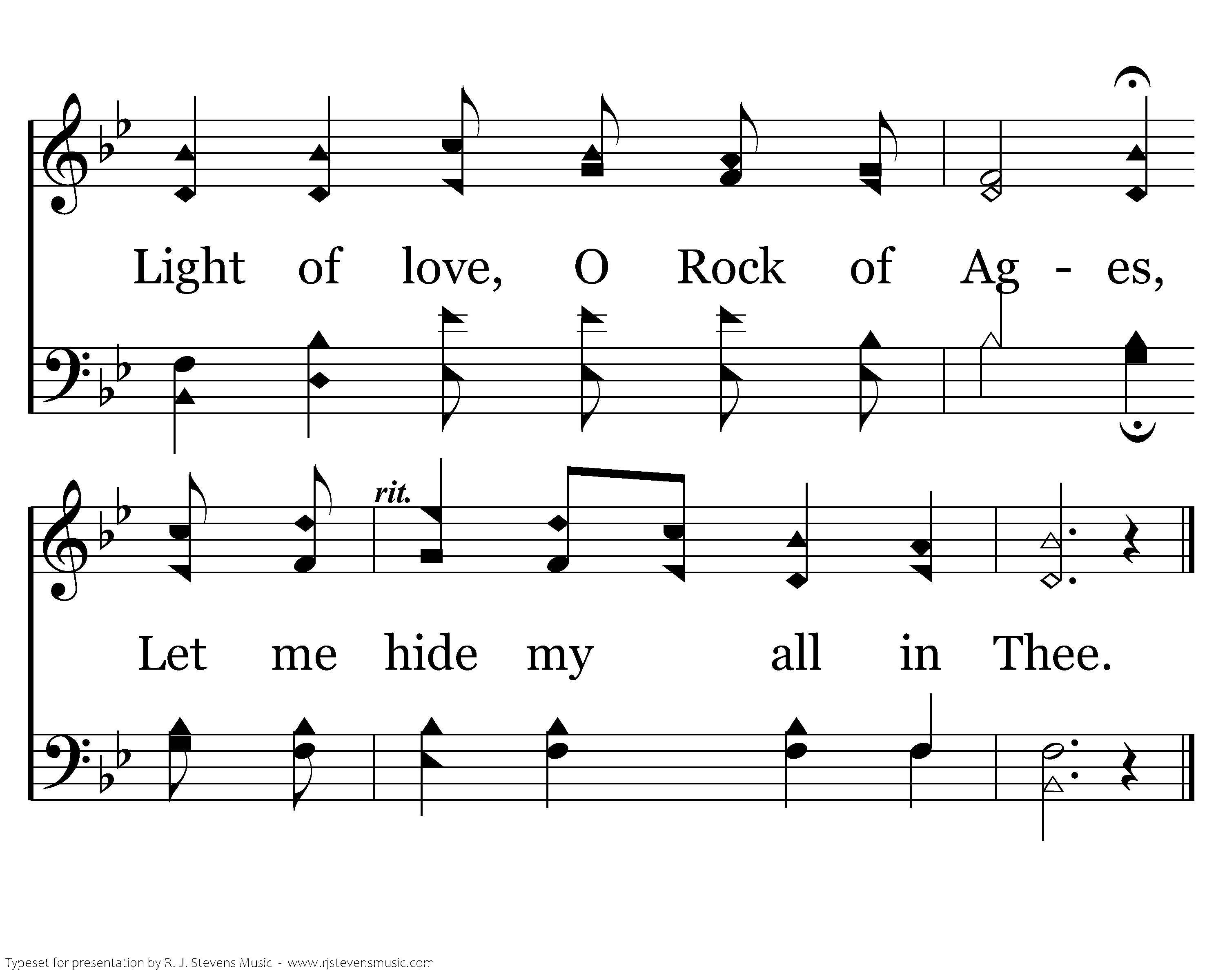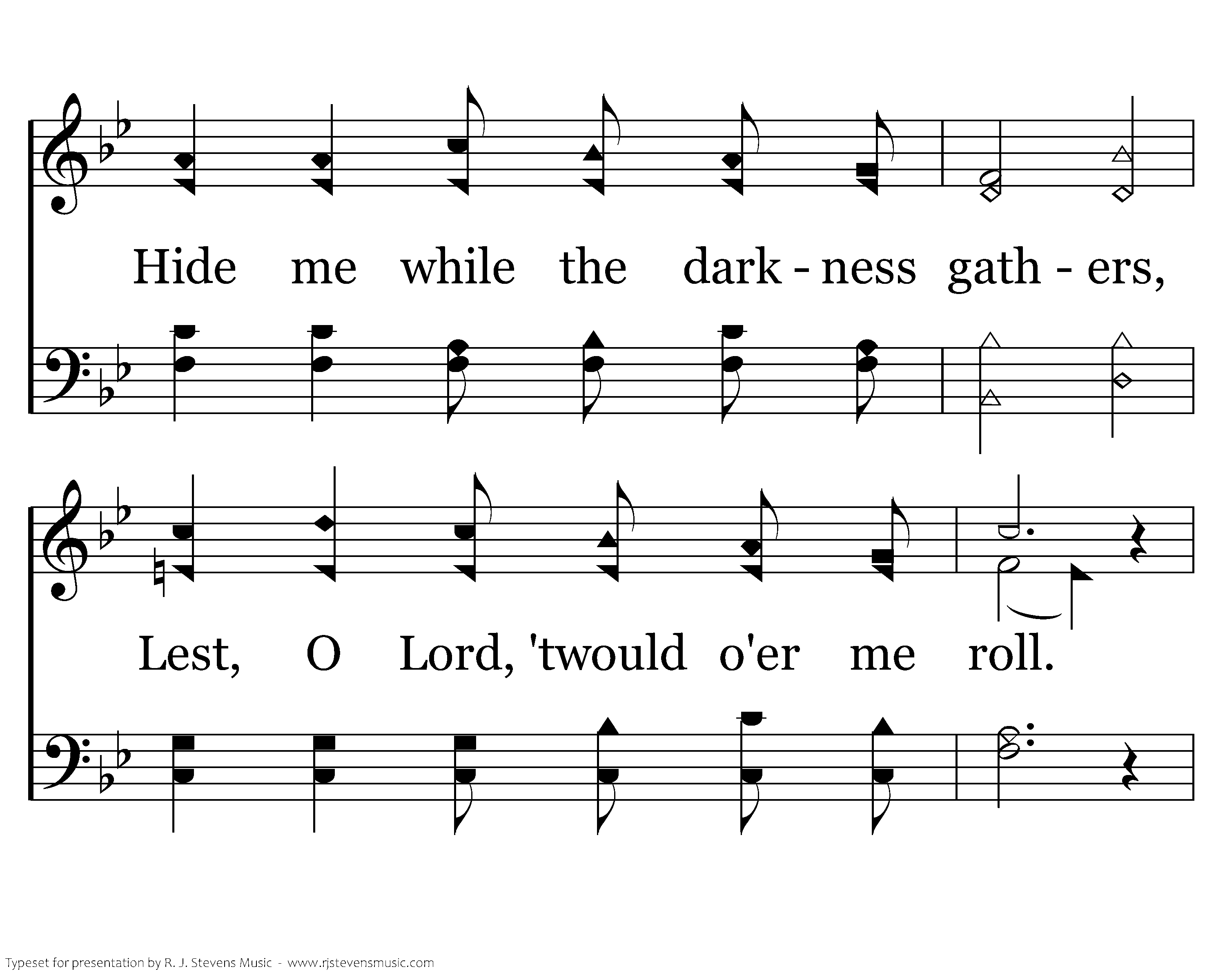 Cleft of ages give me refuge, Give me place to hide my soul. Hide me while the darkness gathers, Lest, O Lord, 'twould o'er me roll. Lest the fearful face of dimness, Hide Thy wondrous love from me, Light of love, O Rock of Ages, Let me hide my all in Thee.