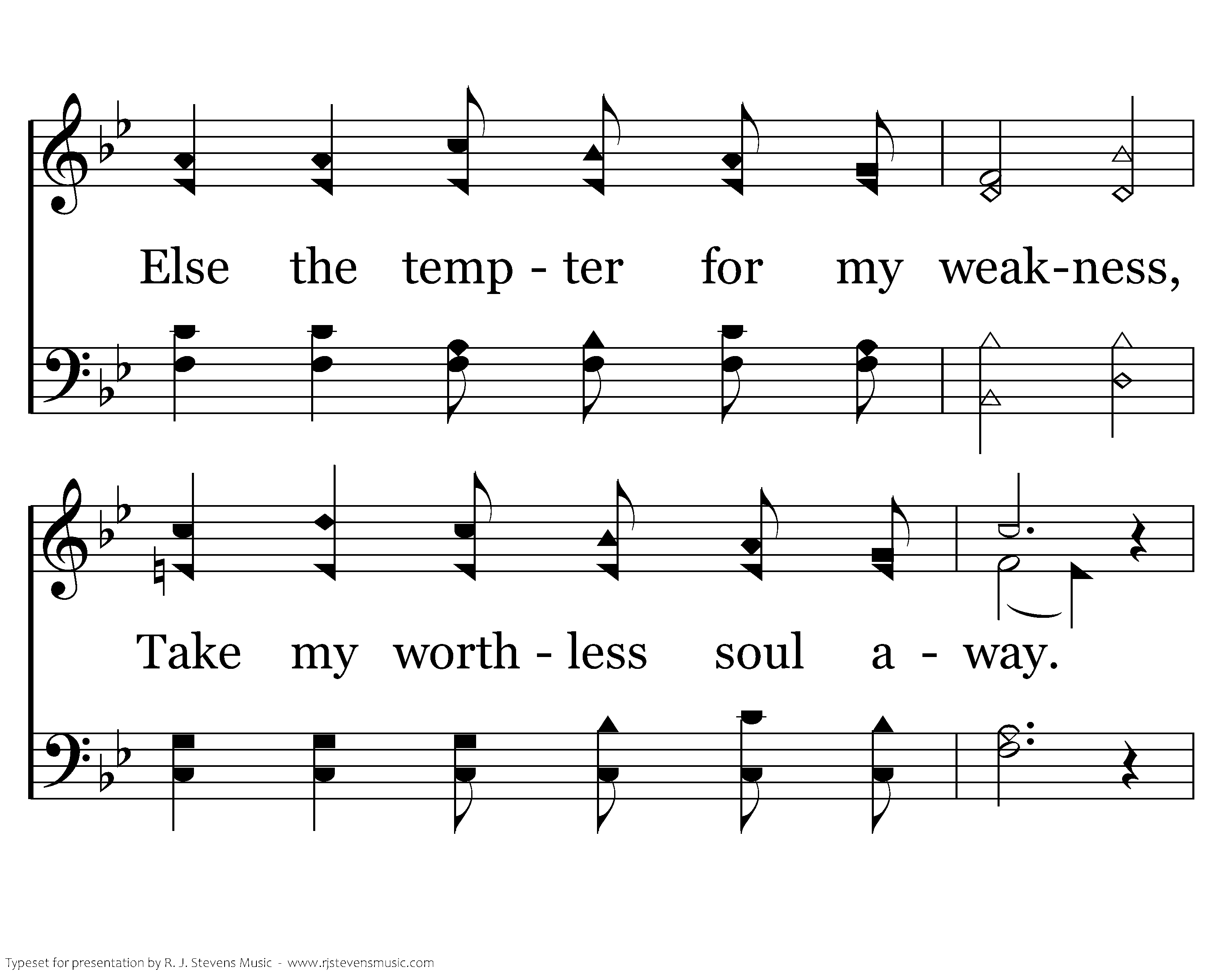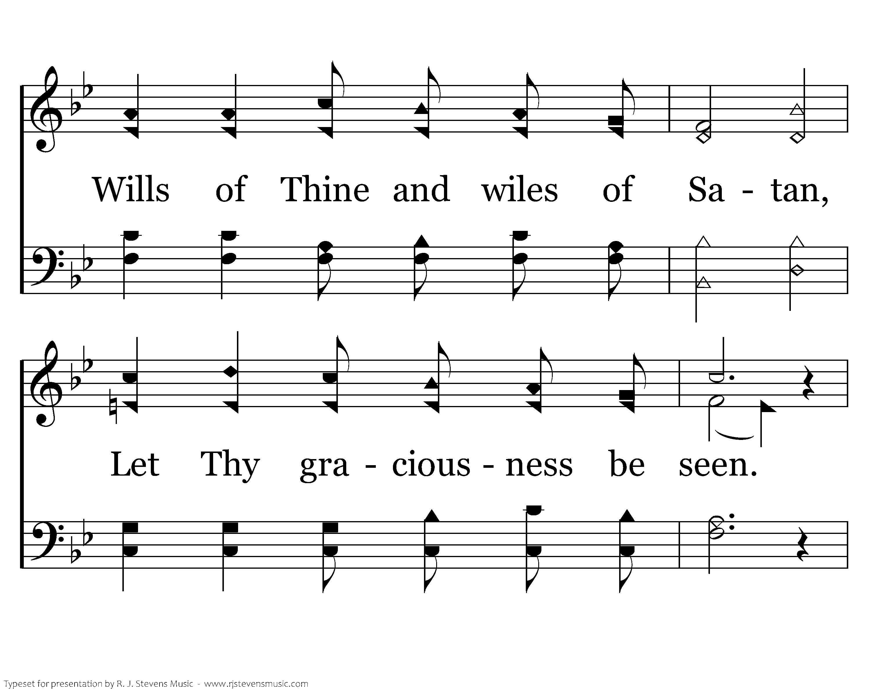 Rock of graciousness and power, Make Thy shadow stand between, Wills of Thine and wiles of Satan, Let Thy graciousness be seen. Rock of Ages, Rock of Ages, Holy cleft, O let me in. Let me bring my ev'ry sorrow, Hear my pleading once again.