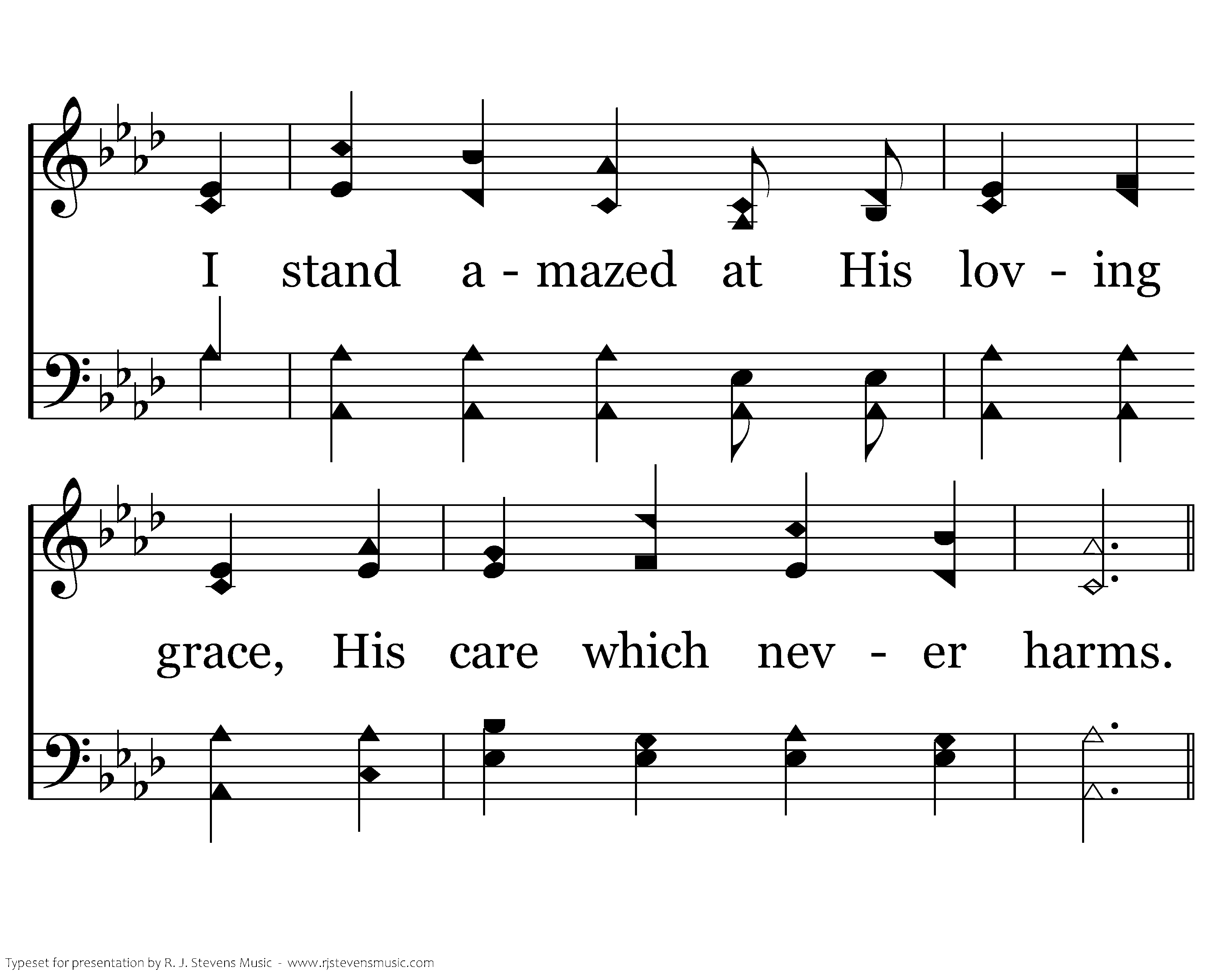 I stand before the cross of Christ, Beneath His outstretched arms. I stand amazed at His loving grace, His care which never harms.