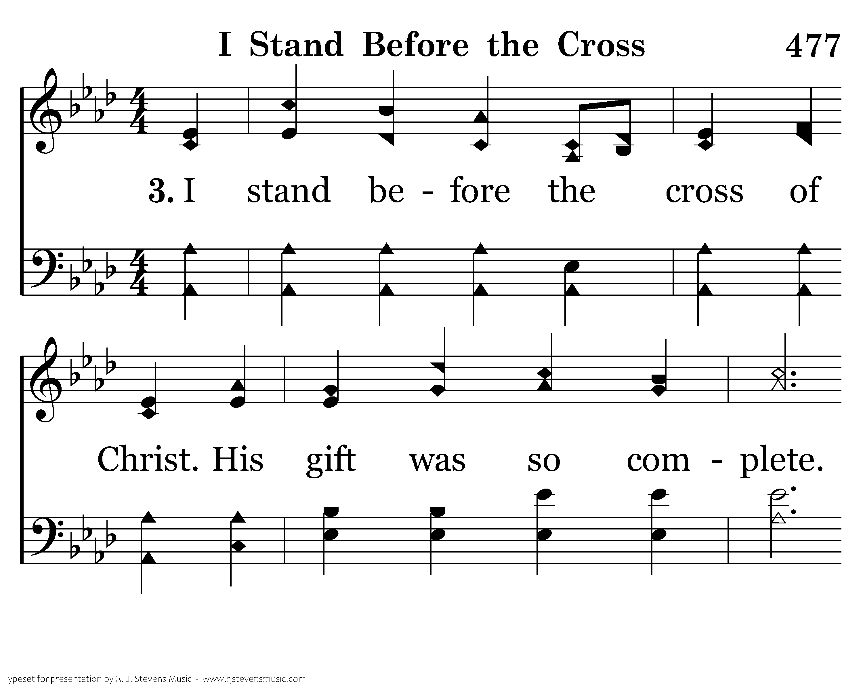 I stand before the cross of Christ. His gift was so complete. I stand for Him as he stood for me. His will I gladly meet.