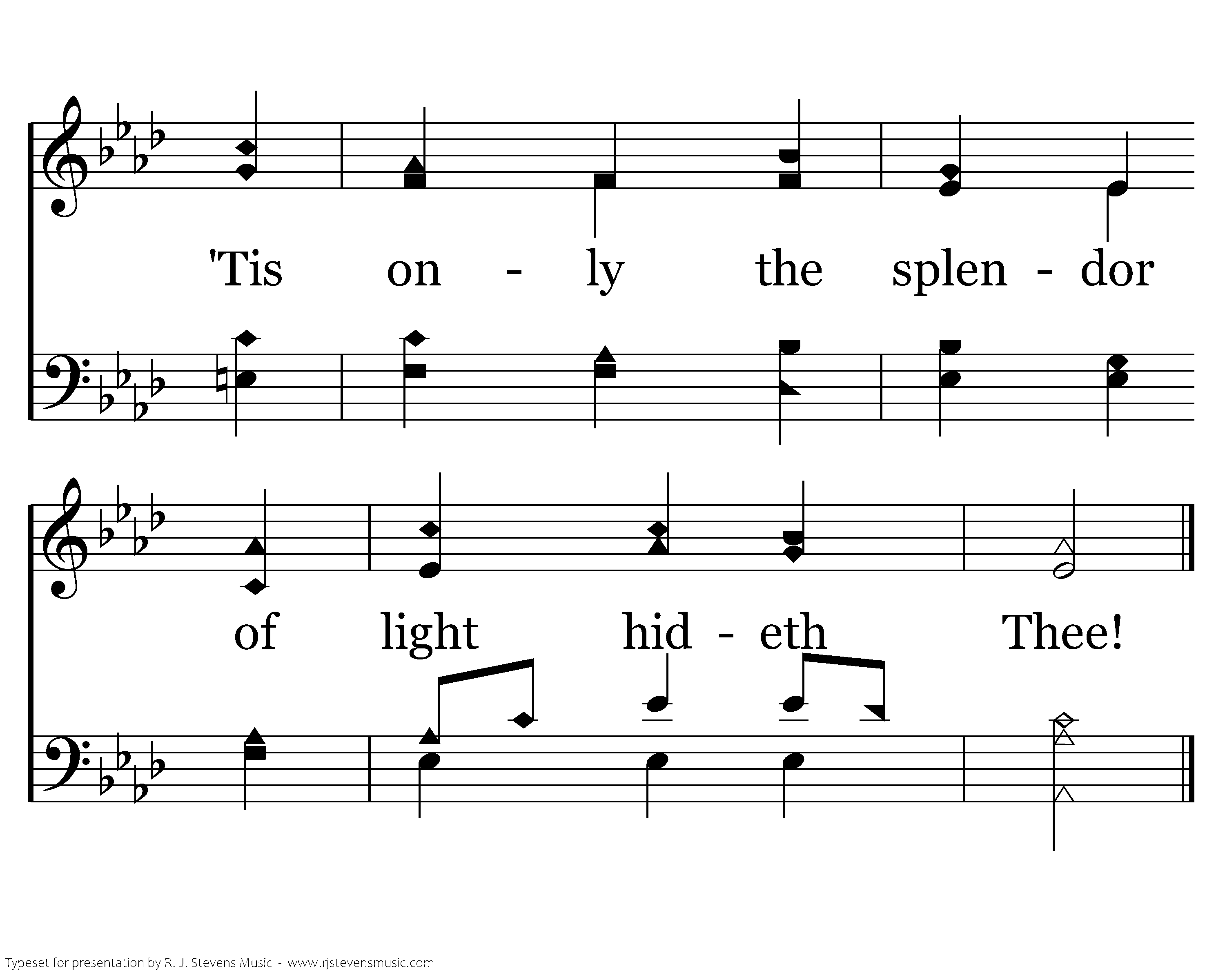 Great Father of glory, pure Father of light, Thine angels adore Thee, all veiling their sight; All praise we should render: O help us to see 'Tis only the splendor of light hideth Thee.