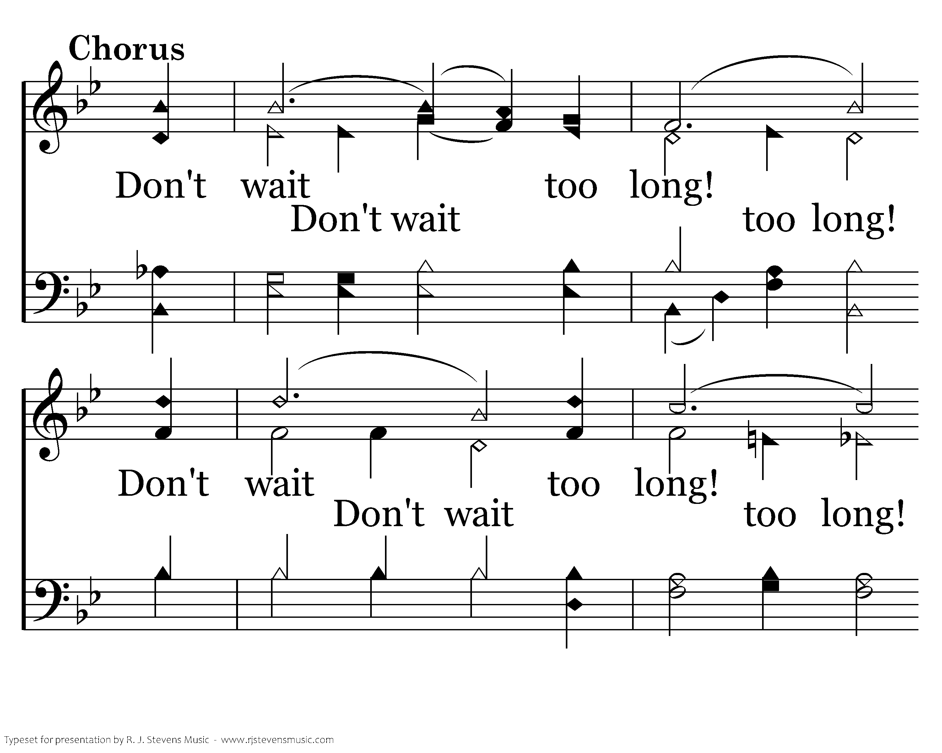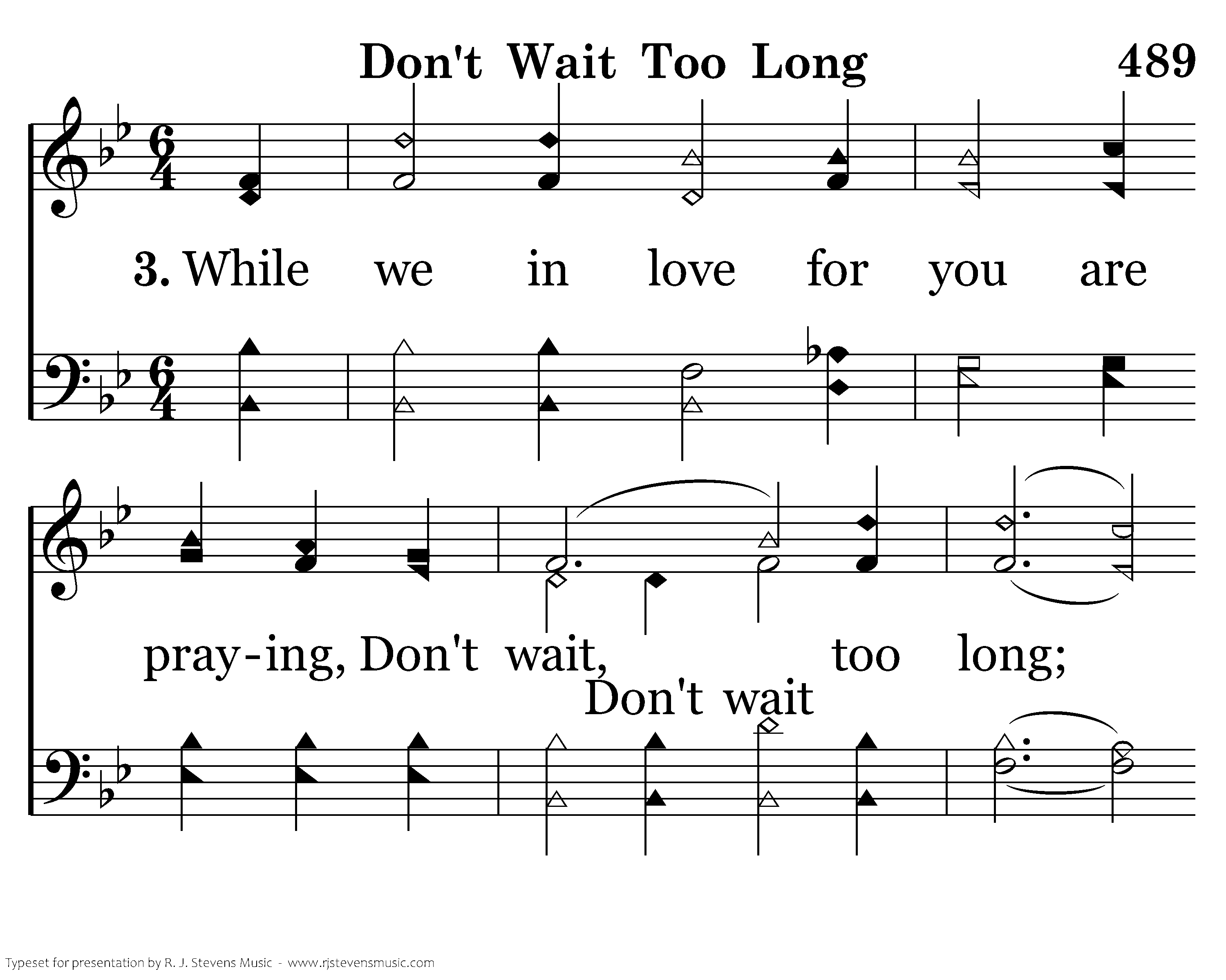 While we in love for you are praying, Don't wait too long; Accept His Word and come obeying, O soul, don't wait too long!
