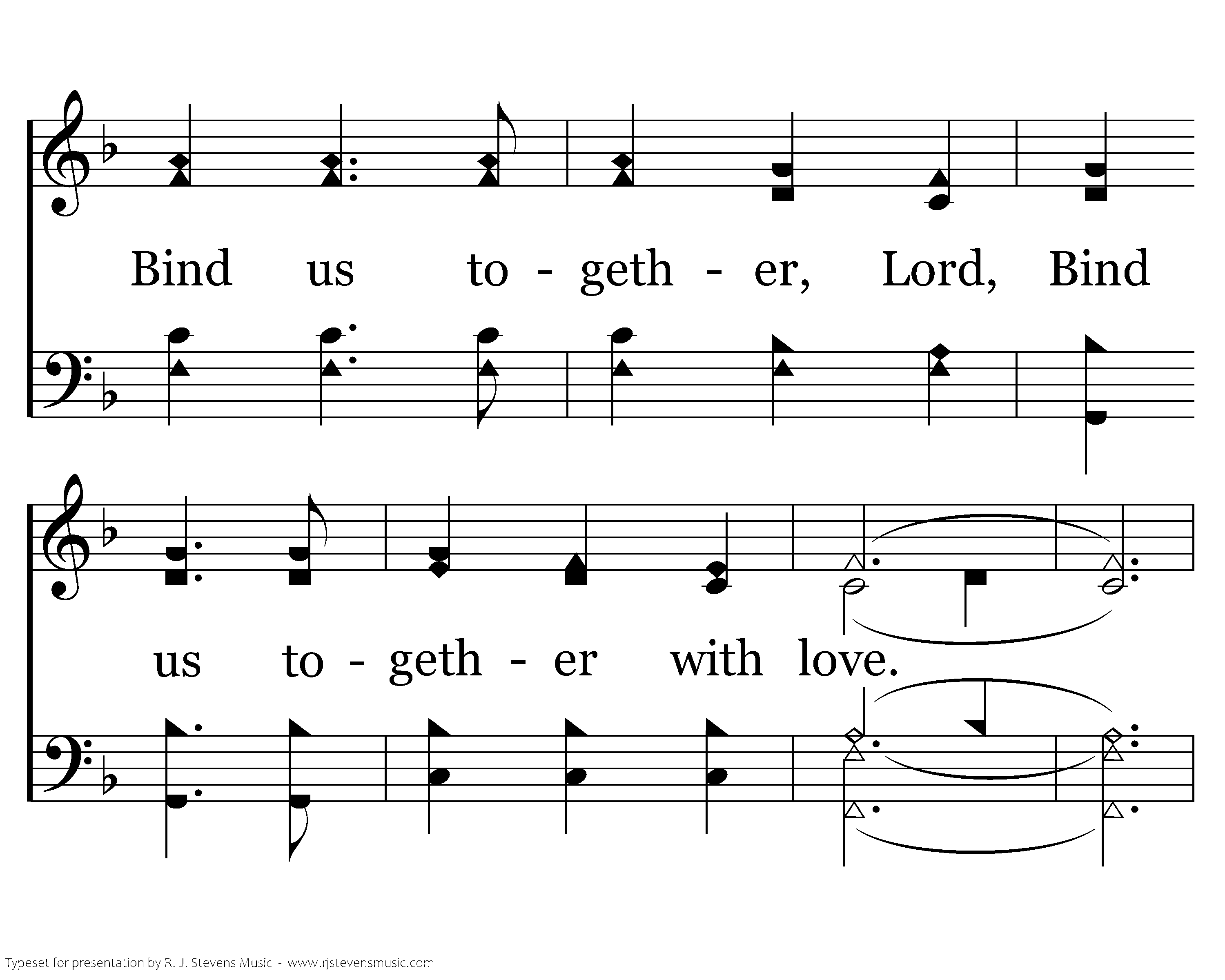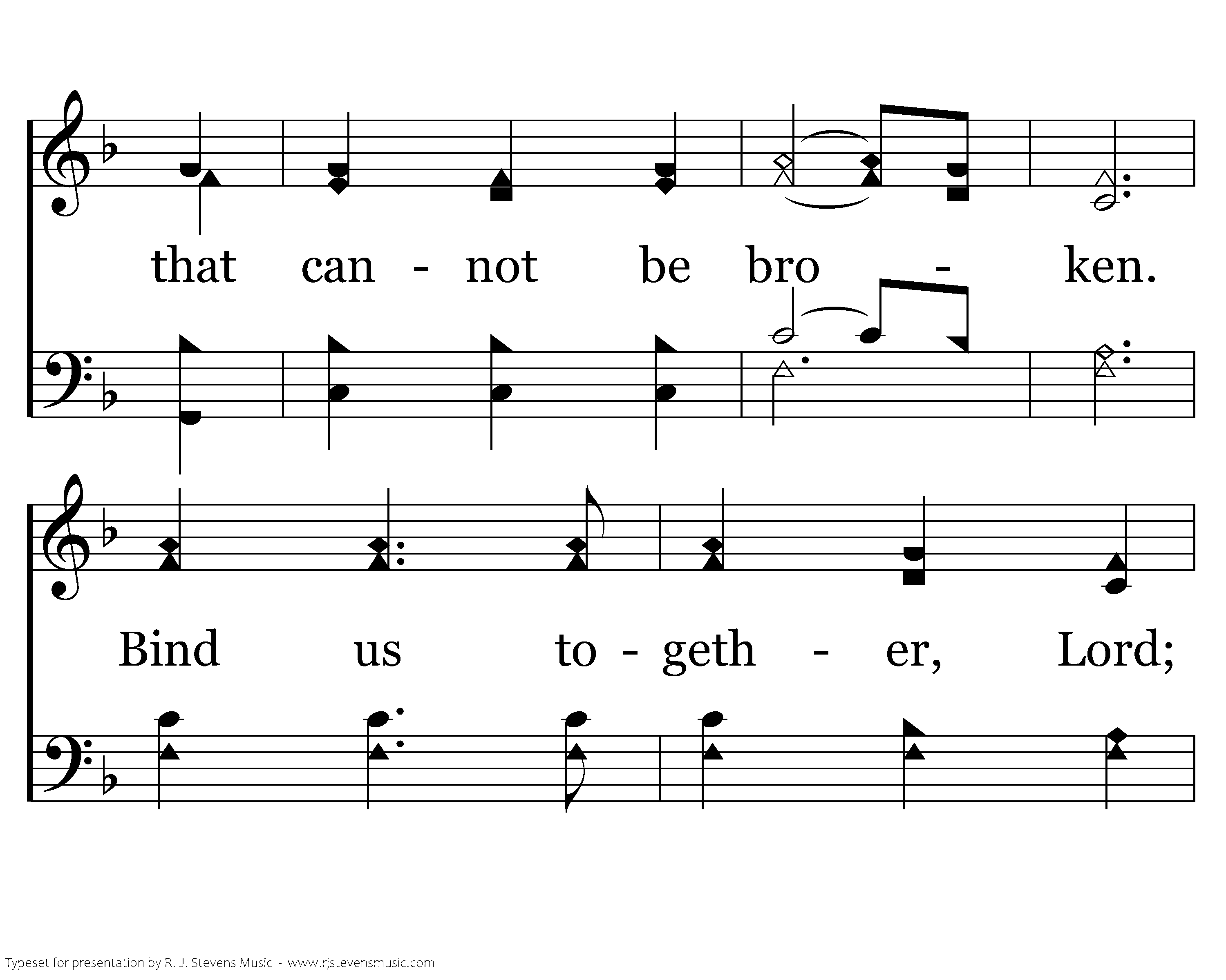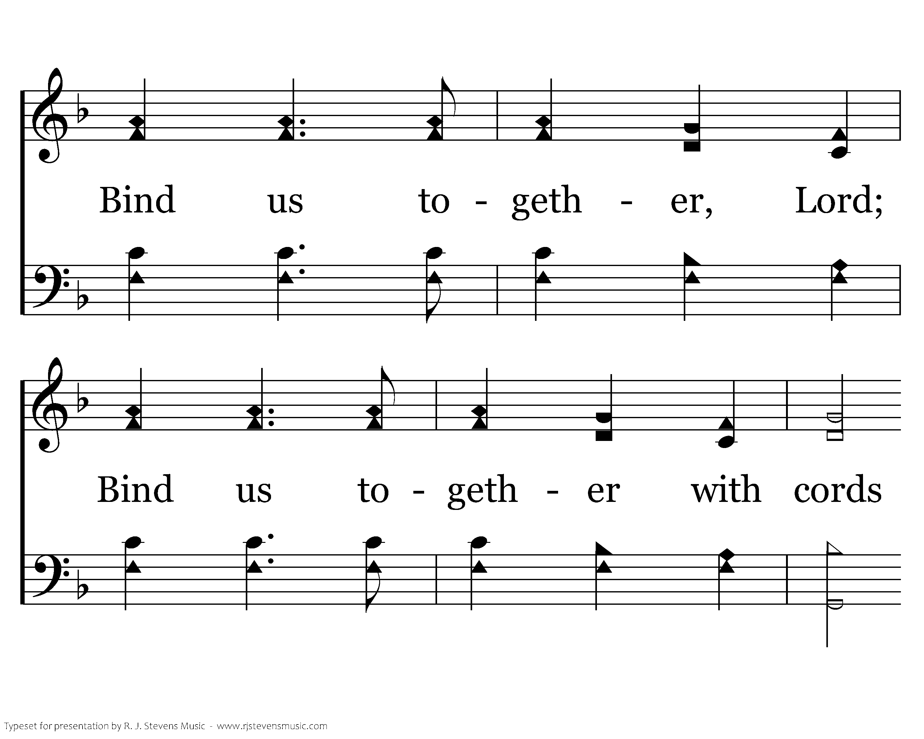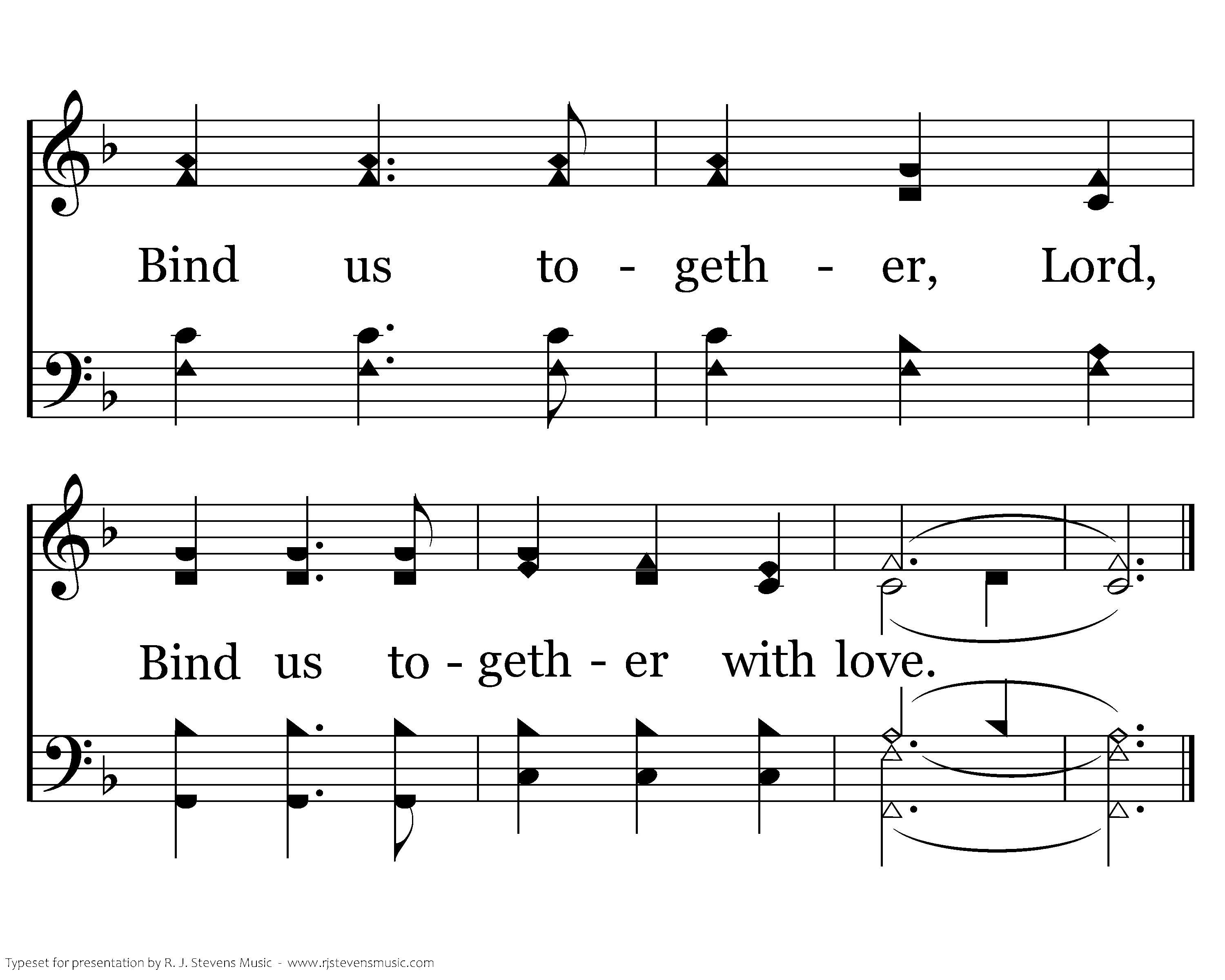 Bind us together, Lord; Bind us together with cords that cannot be broken. Bind us together, Lord; Bind us together, Lord, Bind us together with love. There is only one God. There is only one King. There is only one body. That is why we can sing: