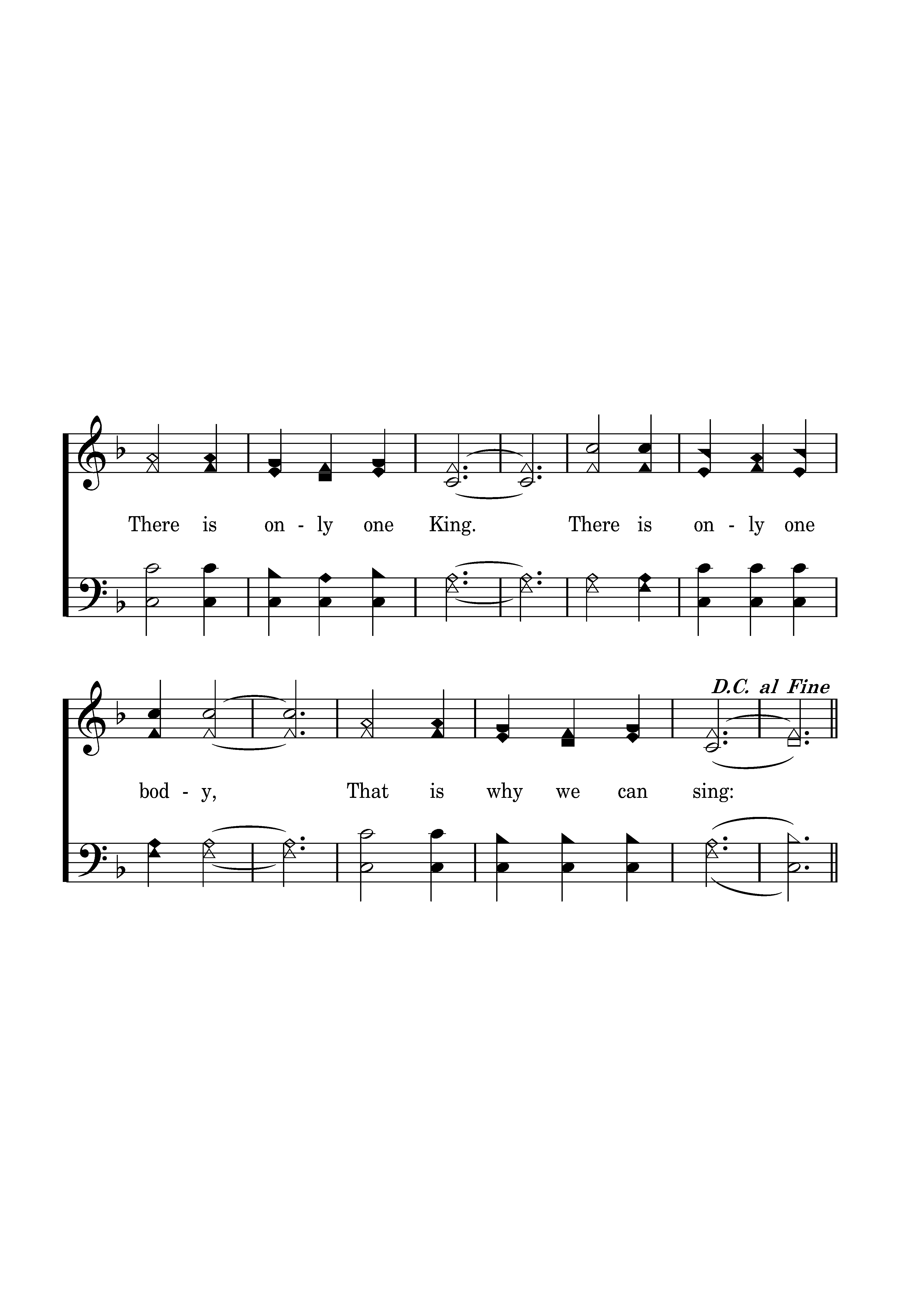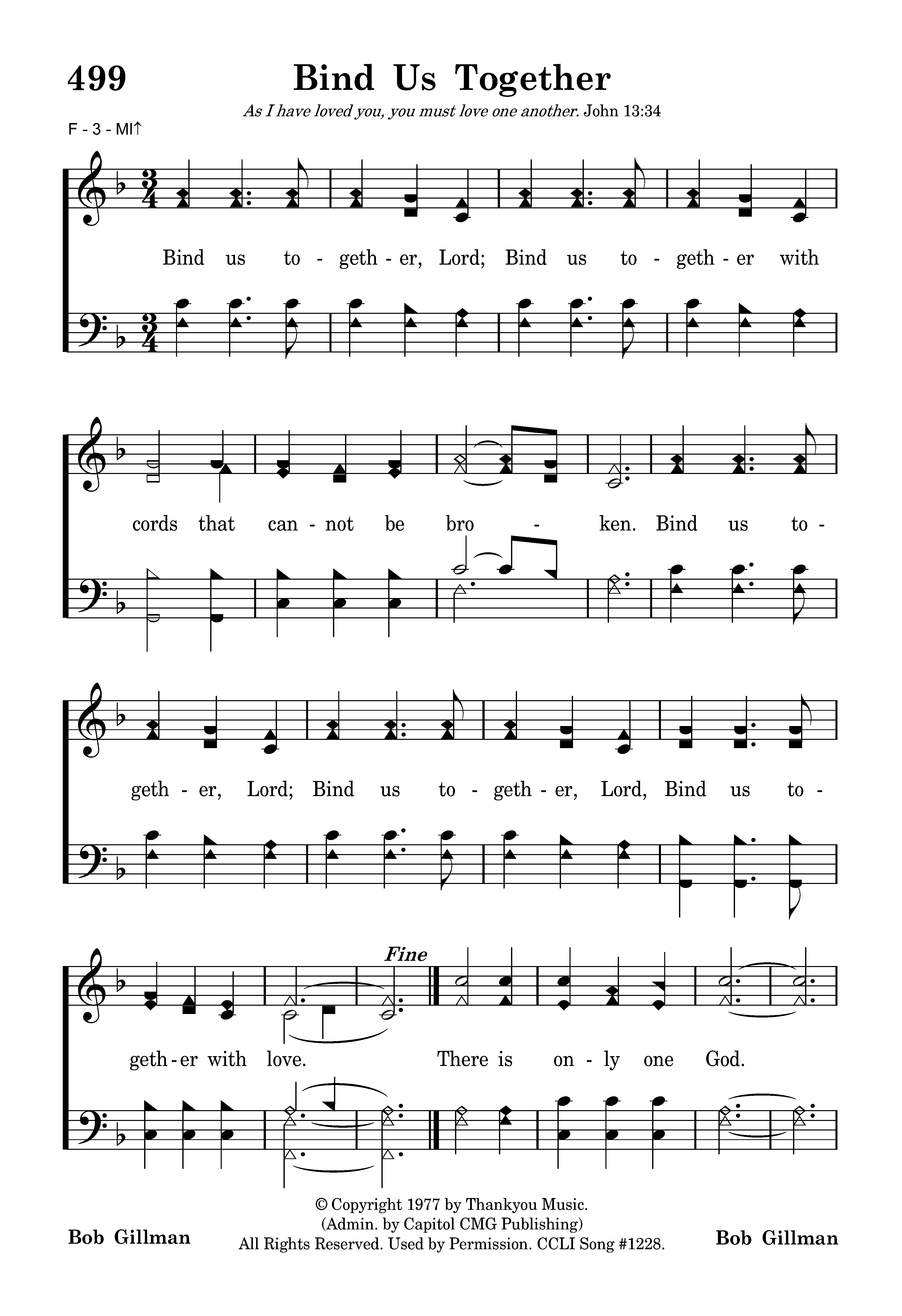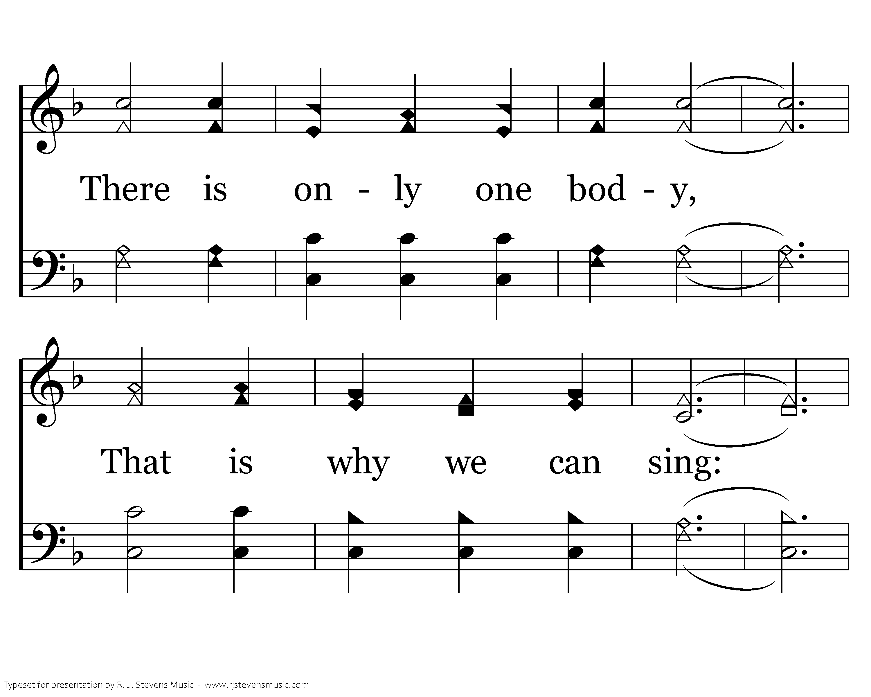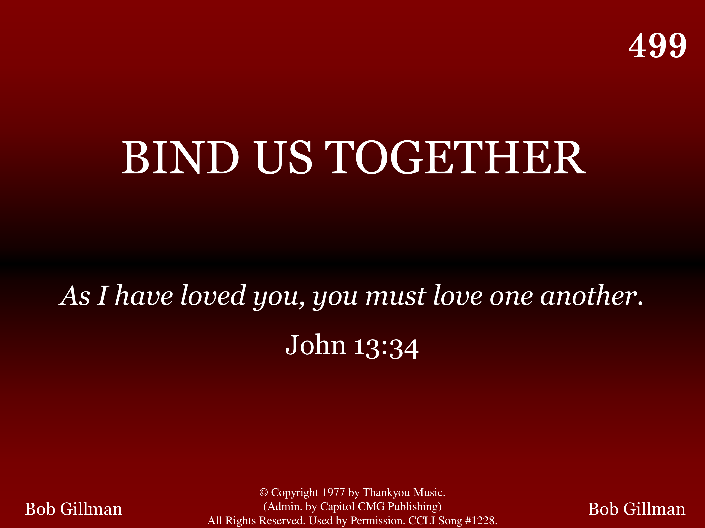 Bind us together, Lord; Bind us together with cords that cannot be broken. Bind us together, Lord; Bind us together, Lord, Bind us together with love. There is only one God. There is only one King. There is only one body. That is why we can sing: