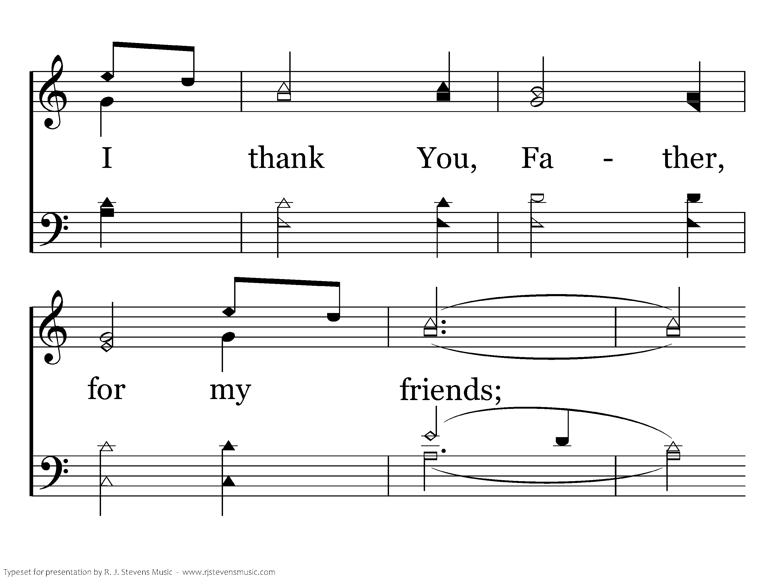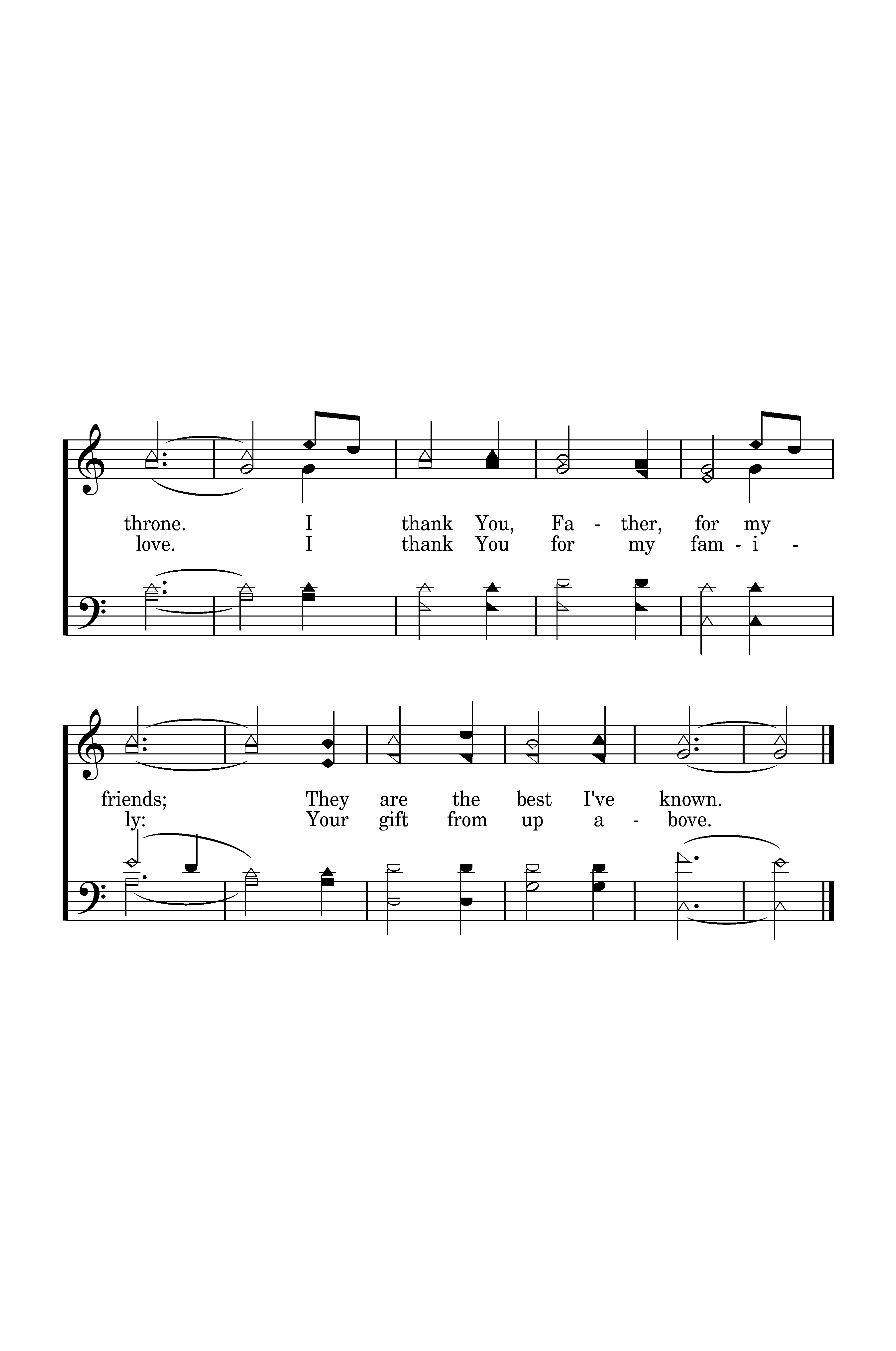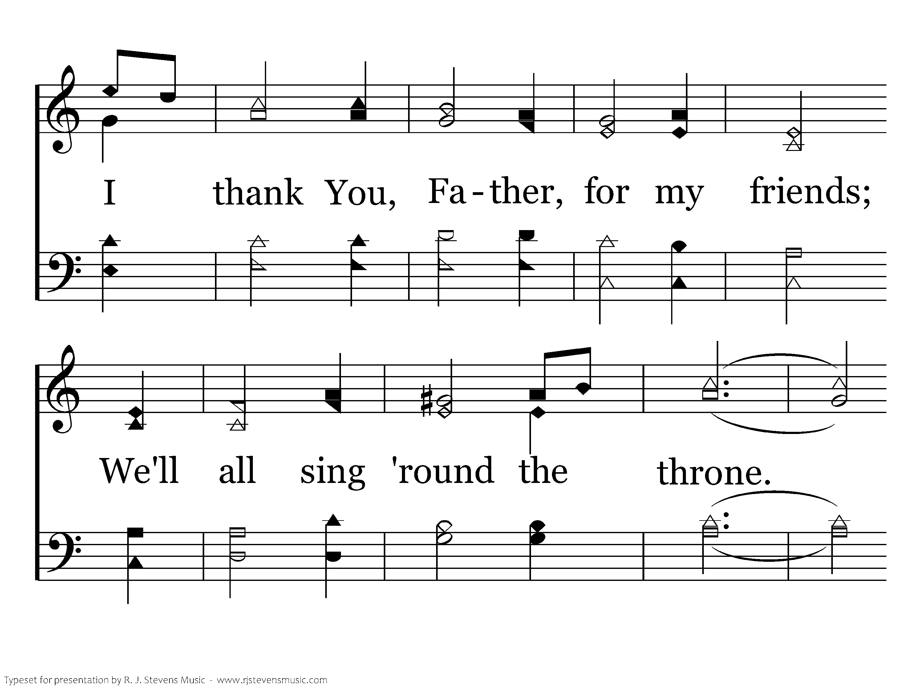 I thank You, Father, for my friends; They mean so much to me. We lift our hearts, we share our joys, We're friends eternally. I thank You, Father, for my friends; We'll all sing 'round the throne. I thank You, Father, for my friends; They are the best I've known.