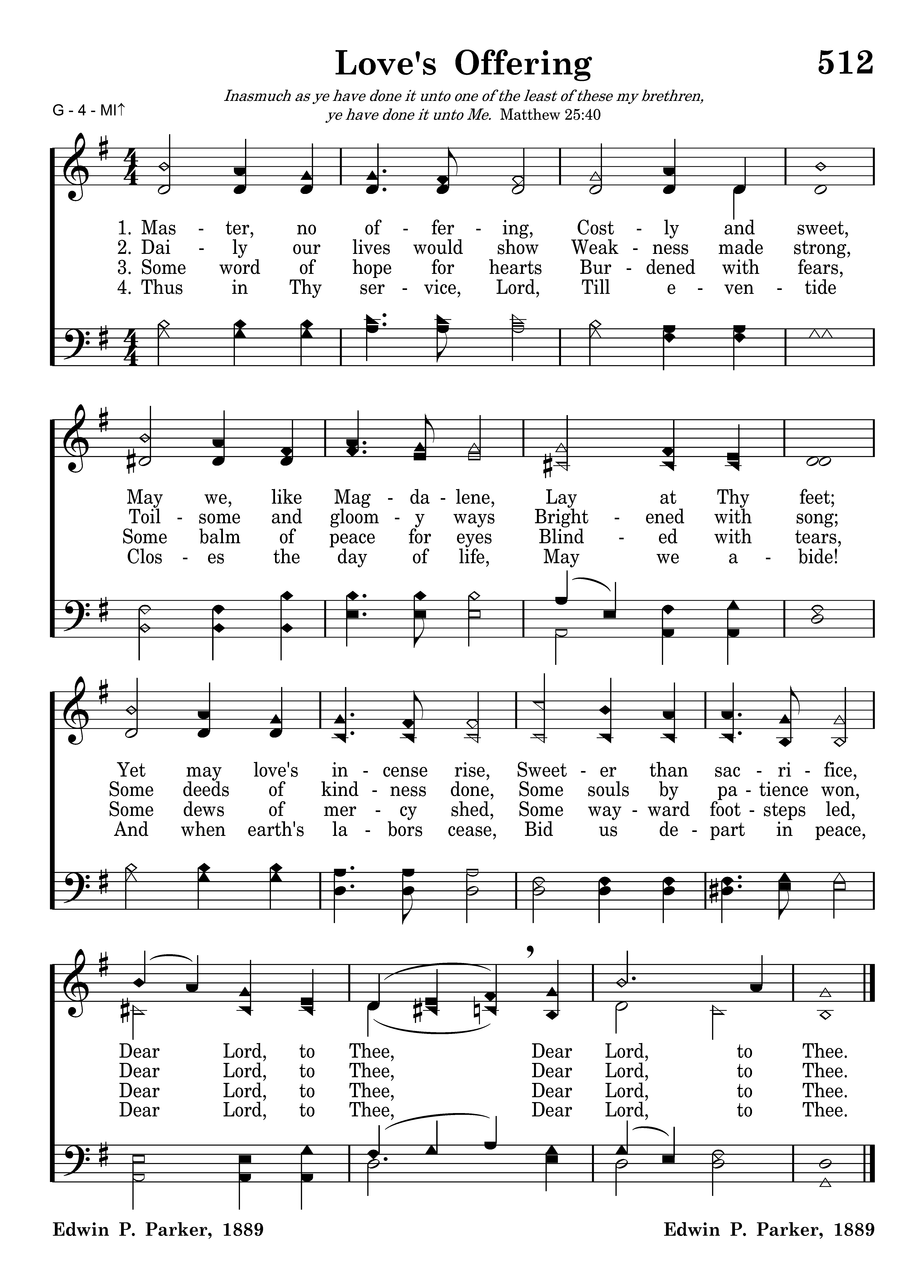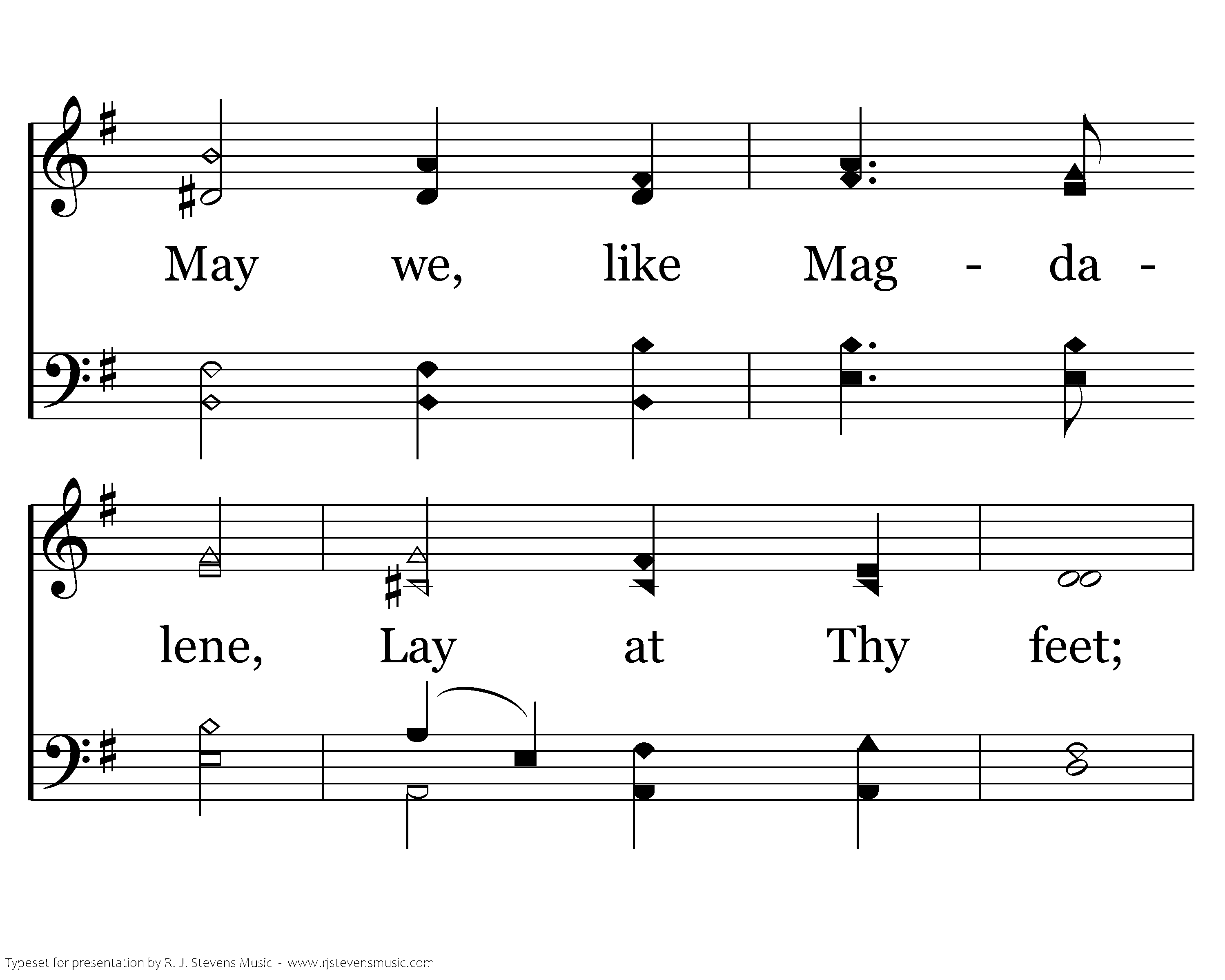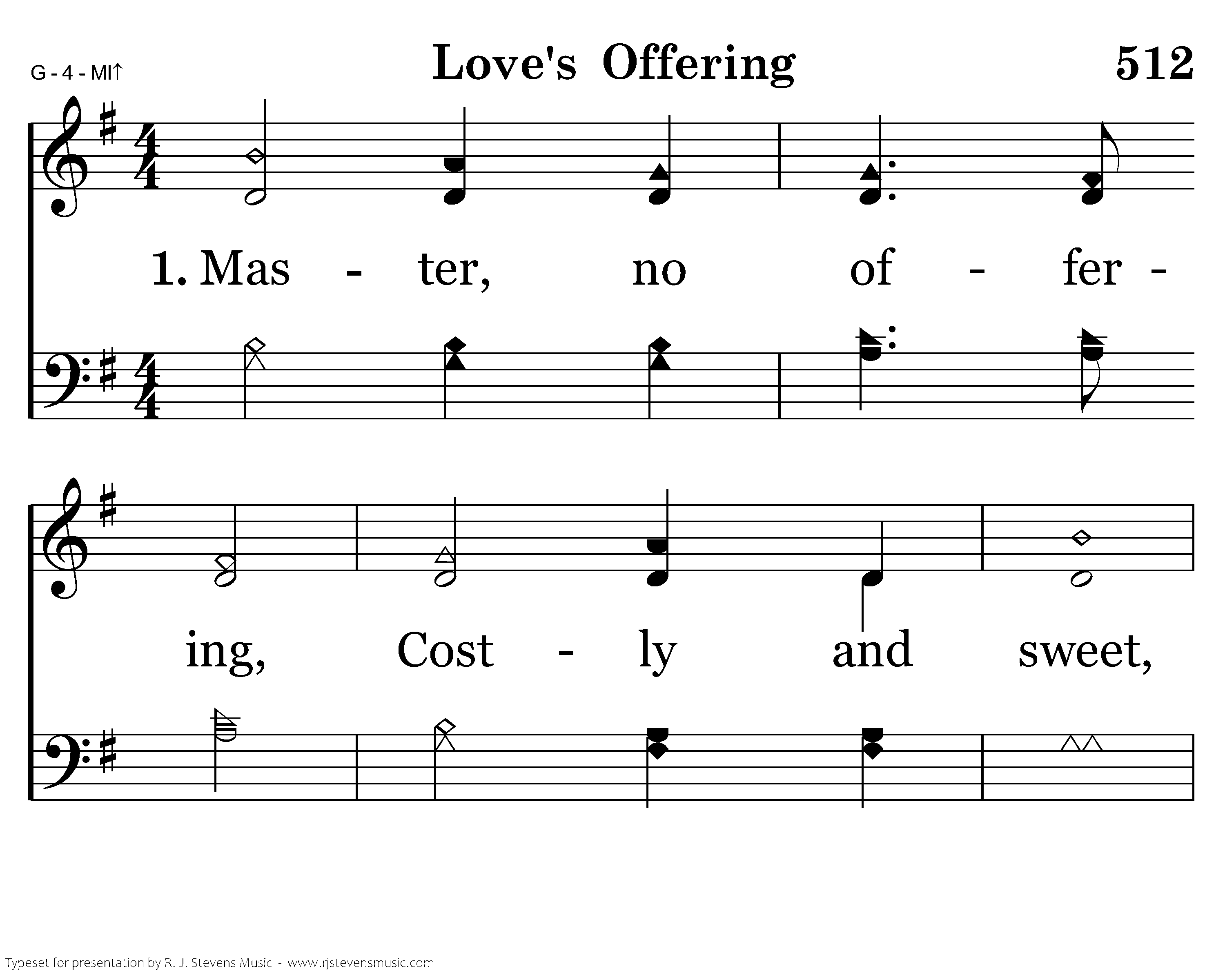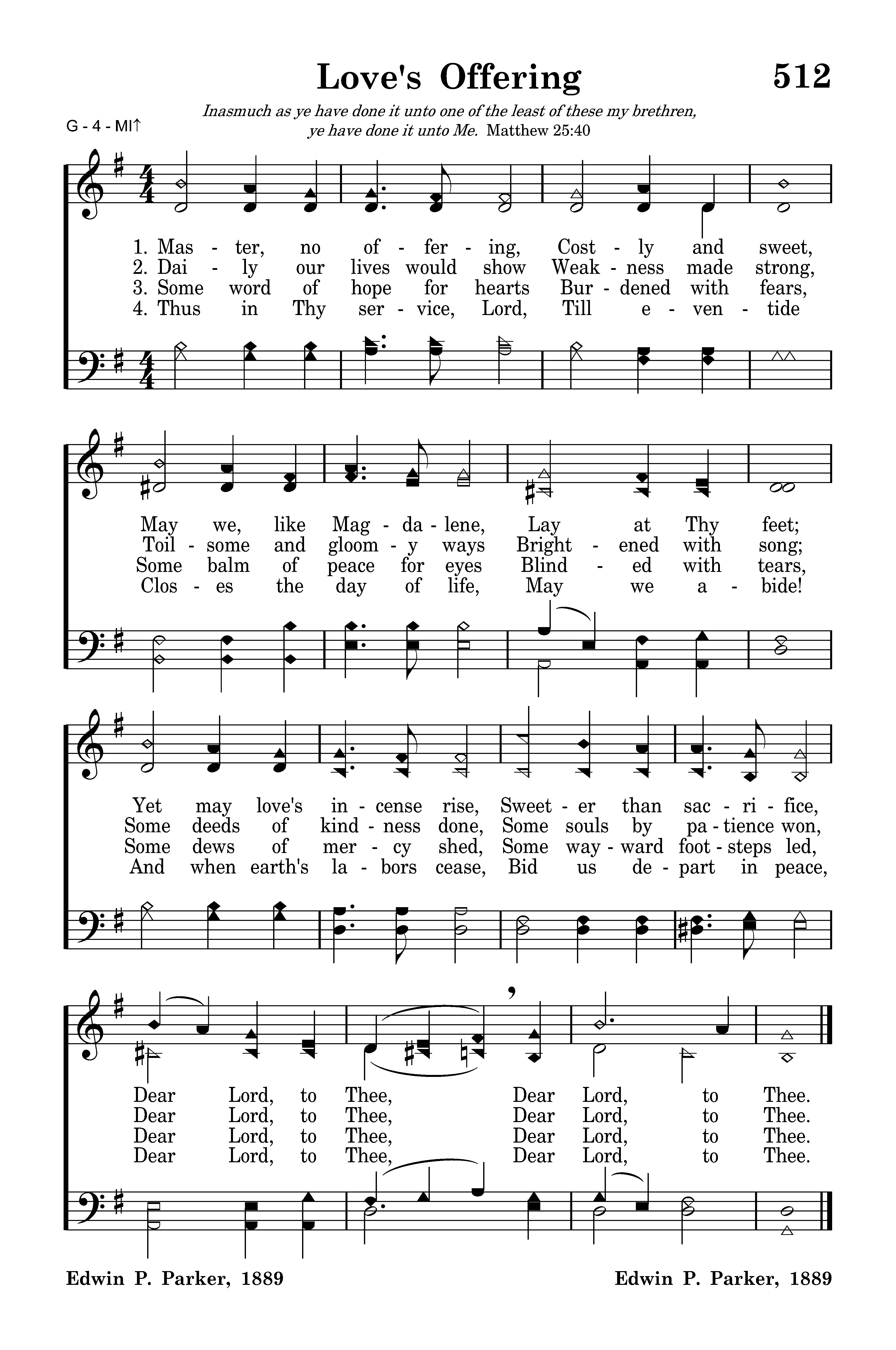 Master, no offering, Costly and sweet, May we, like Magdalene, Lay at Thy feet; Yet may love's incense rise, Sweeter than sacrifice, Dear Lord, to Thee, Dear Lord, to Thee.