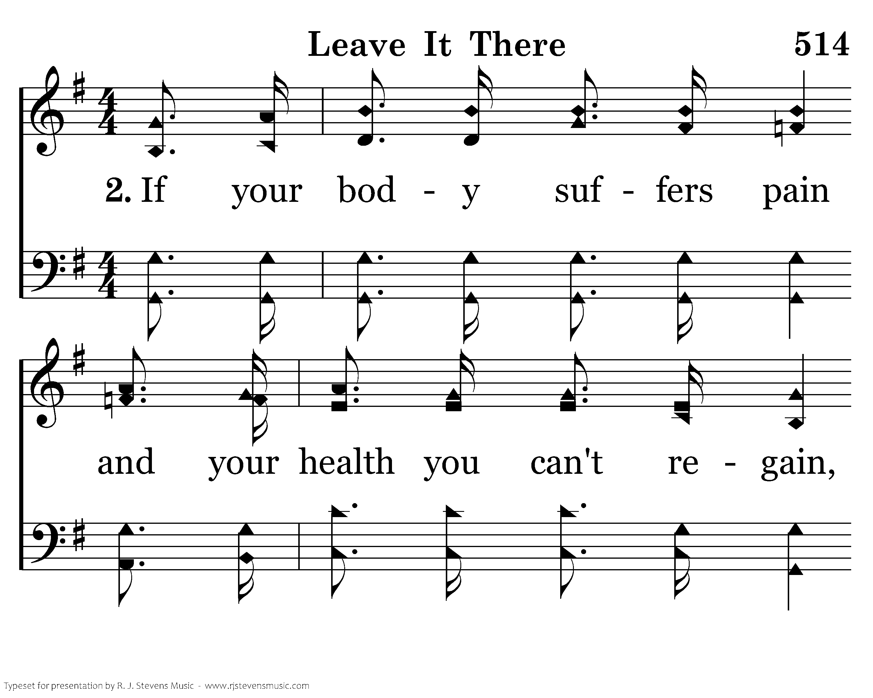 If your body suffers pain and your health you can't regain, And your soul is almost sinking in despair, Jesus knows the pain you feel, He can save and He can heal; Take your burden to the Lord and leave it there.