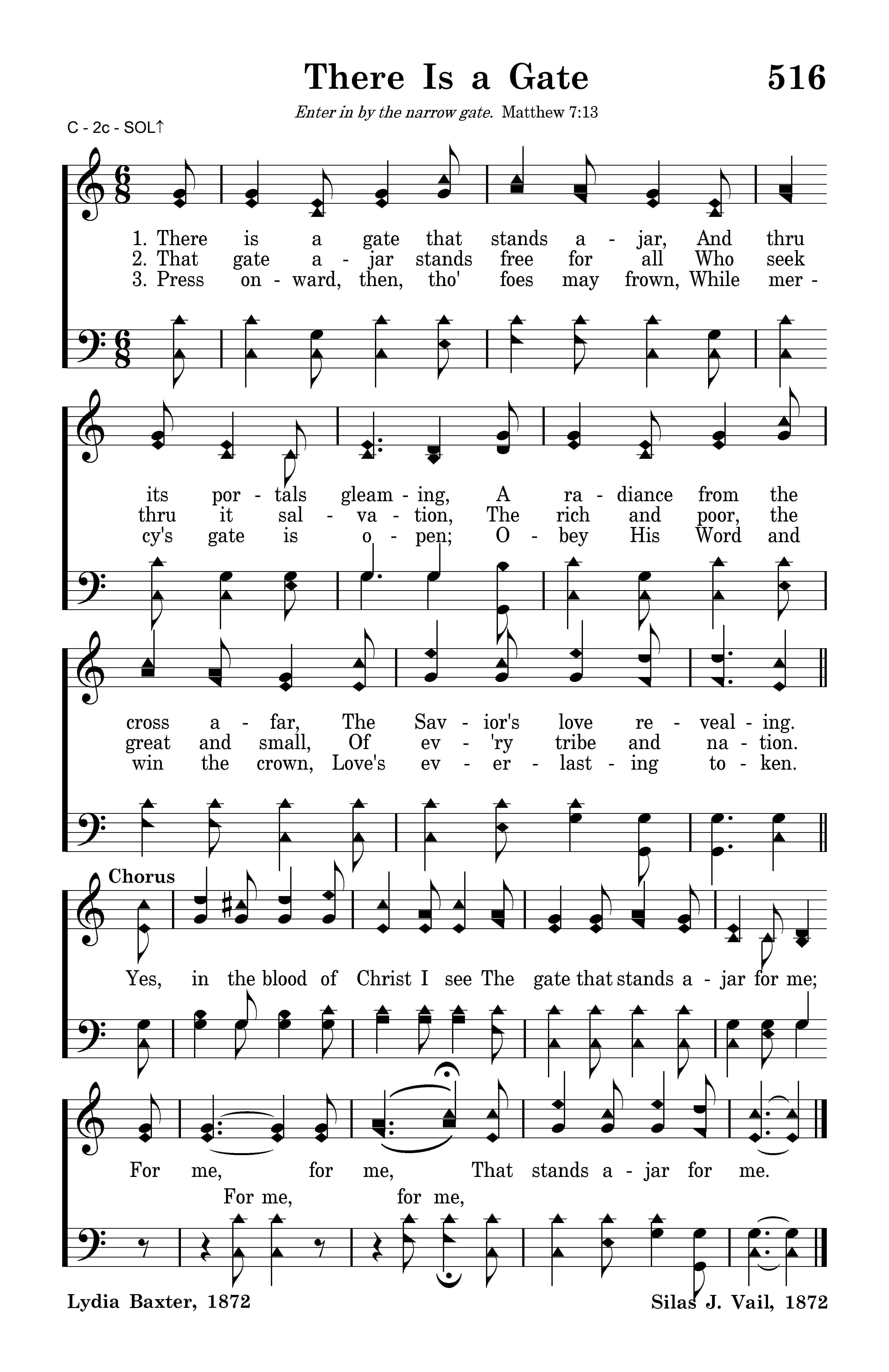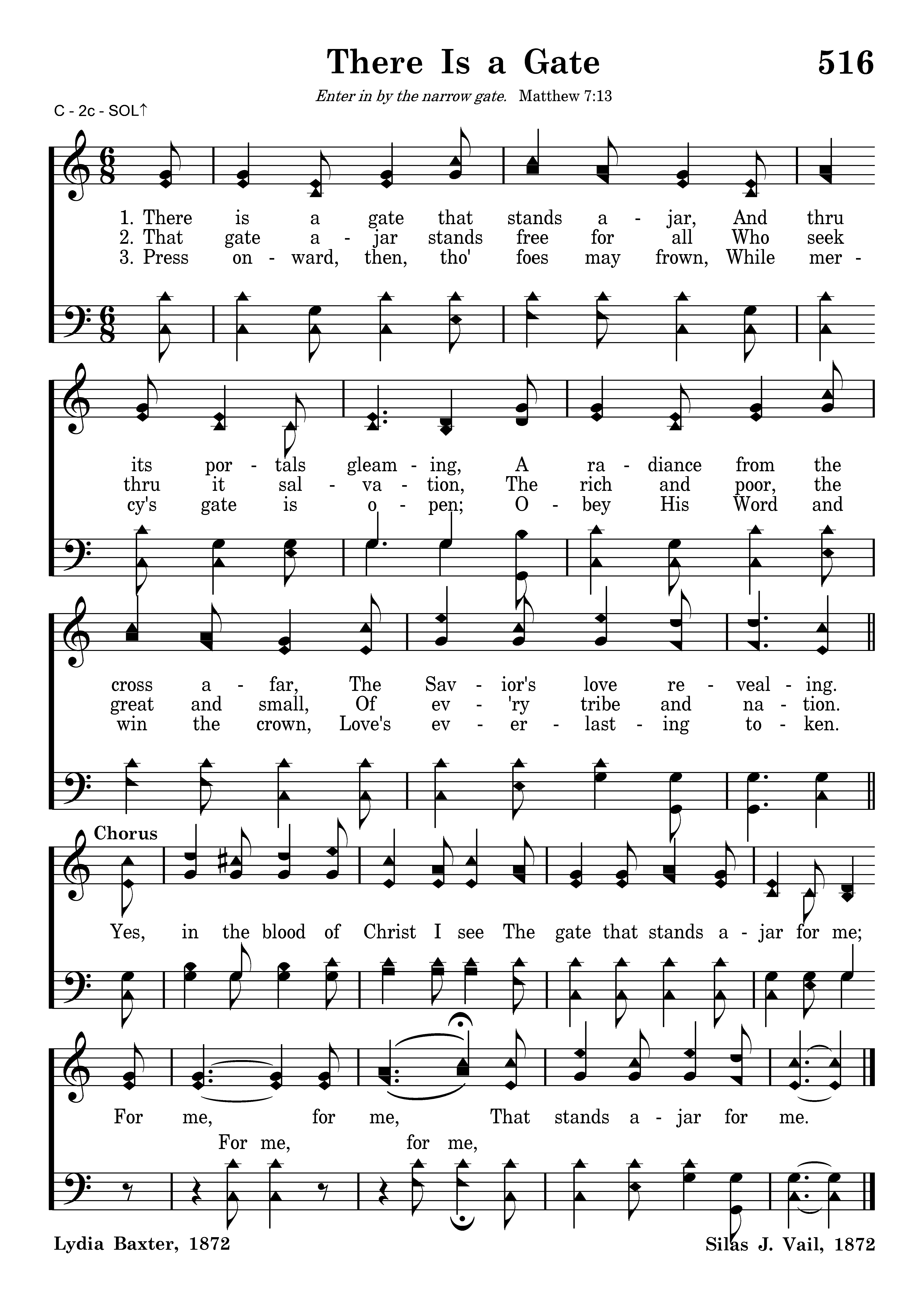 That gate ajar stands free for all Who seek thru it salvation, The rich and poor, the great and small, Of ev'ry tribe and nation.