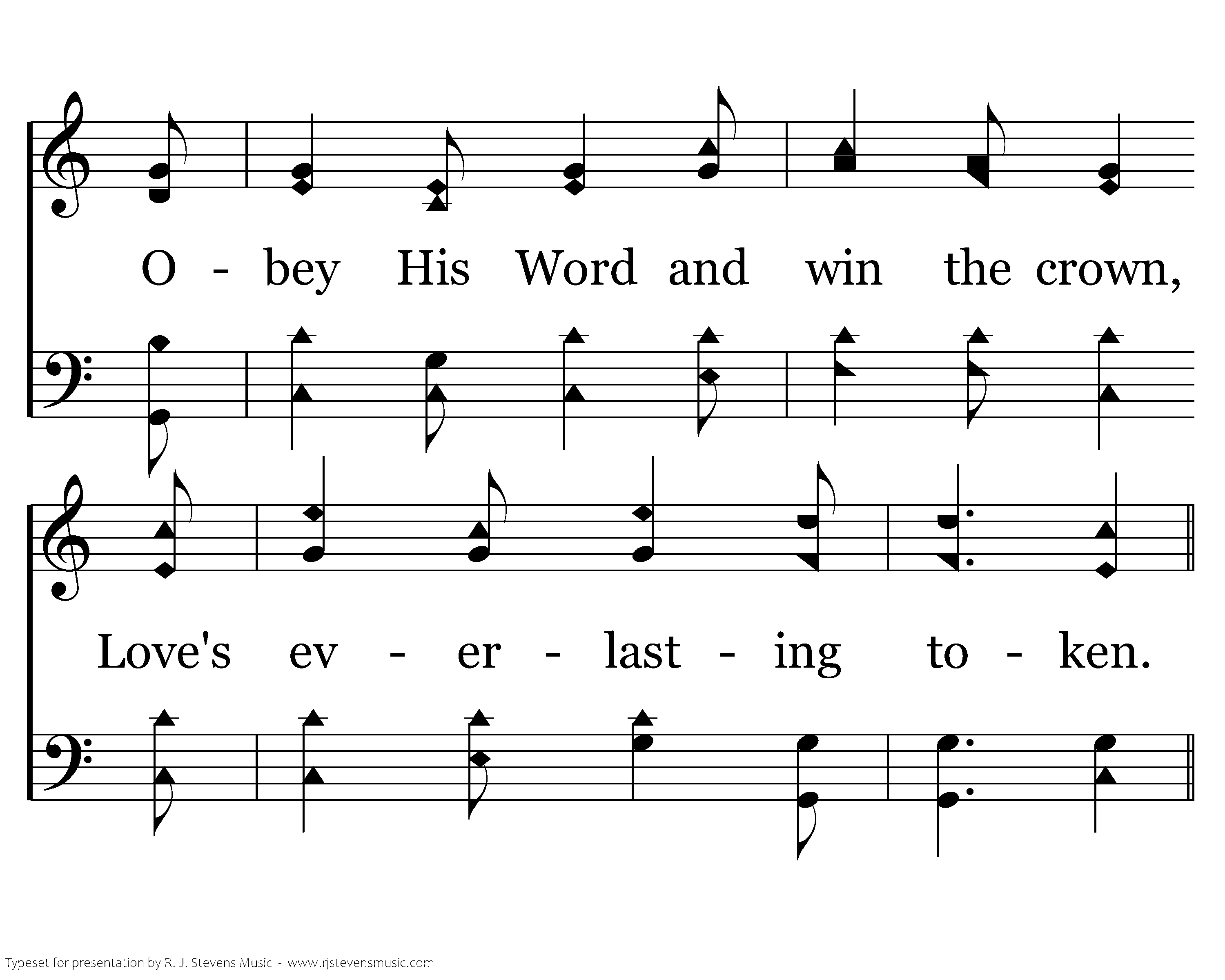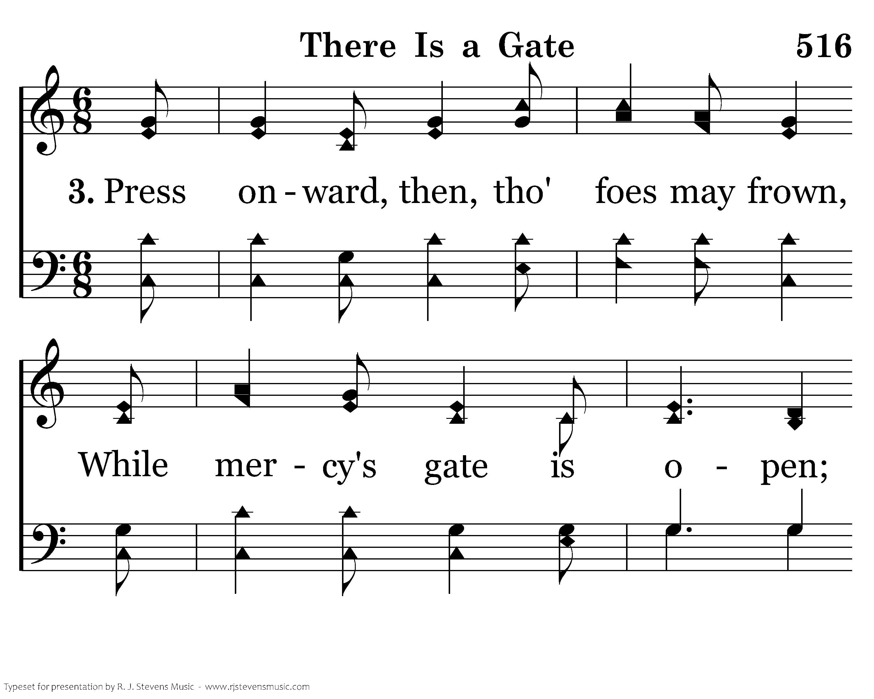 Press onward, then, t ho' foes may frown, While mercy's gate is open; Obey His Word and win the crown, Love's everlasting token.