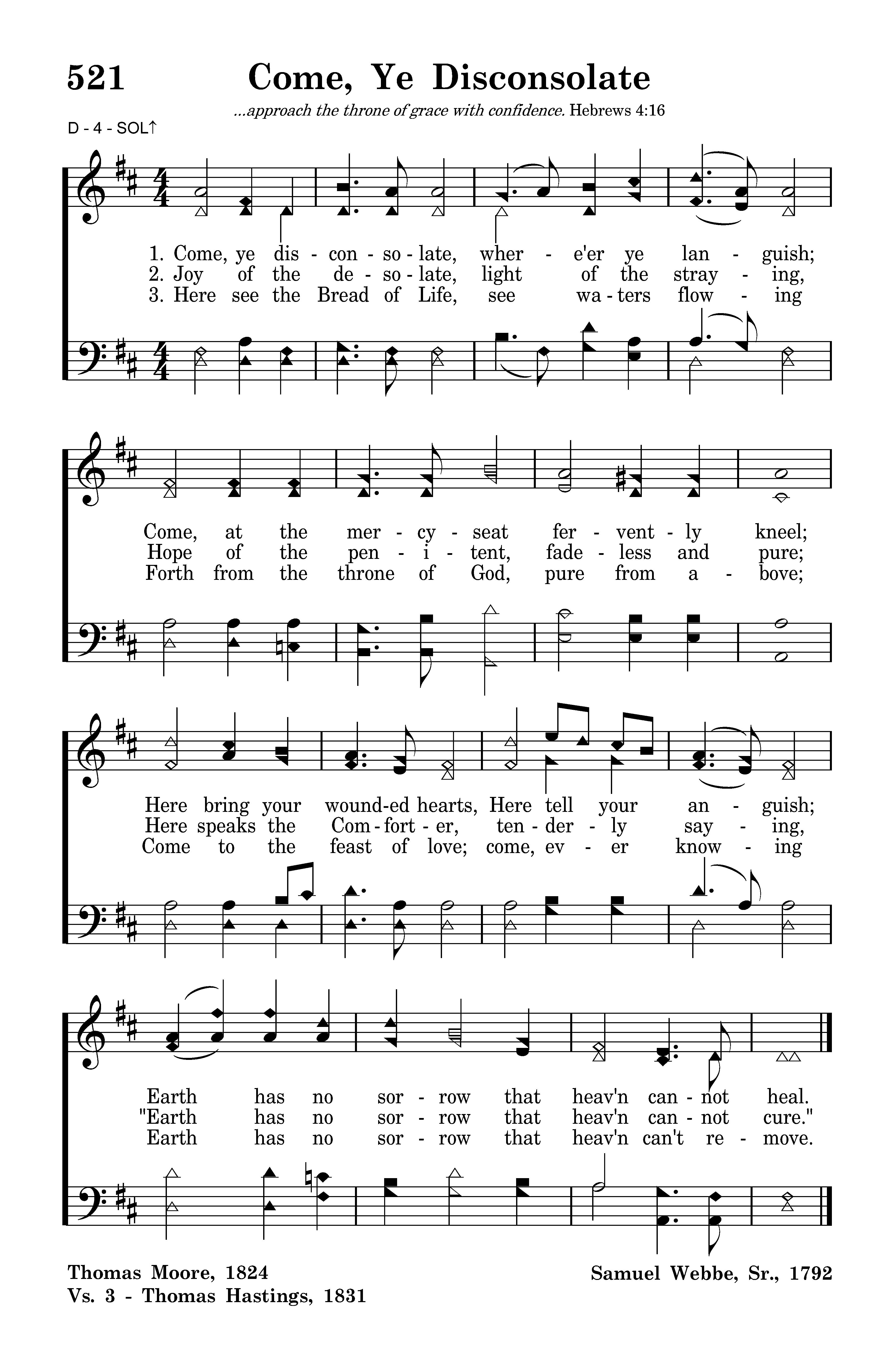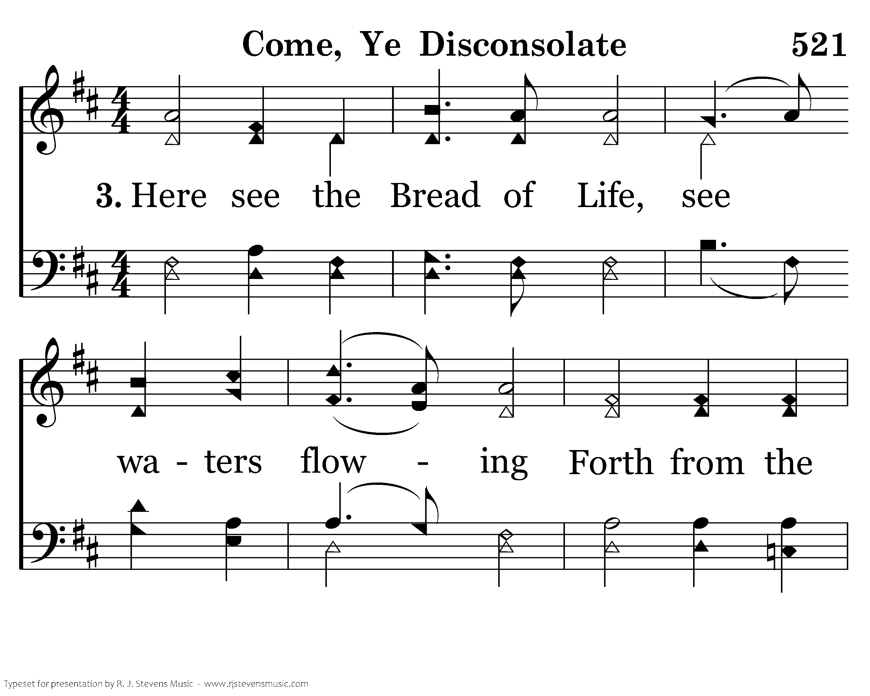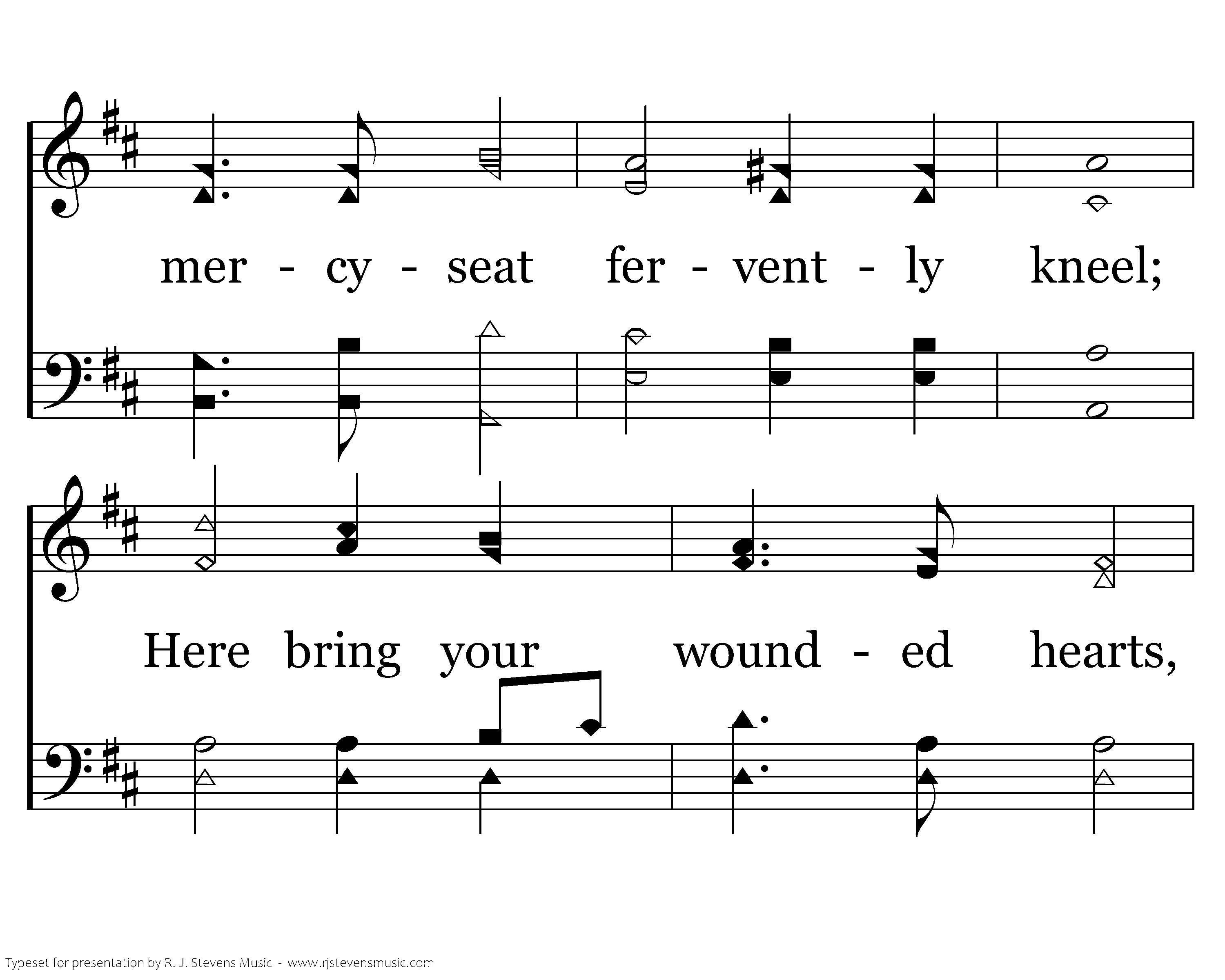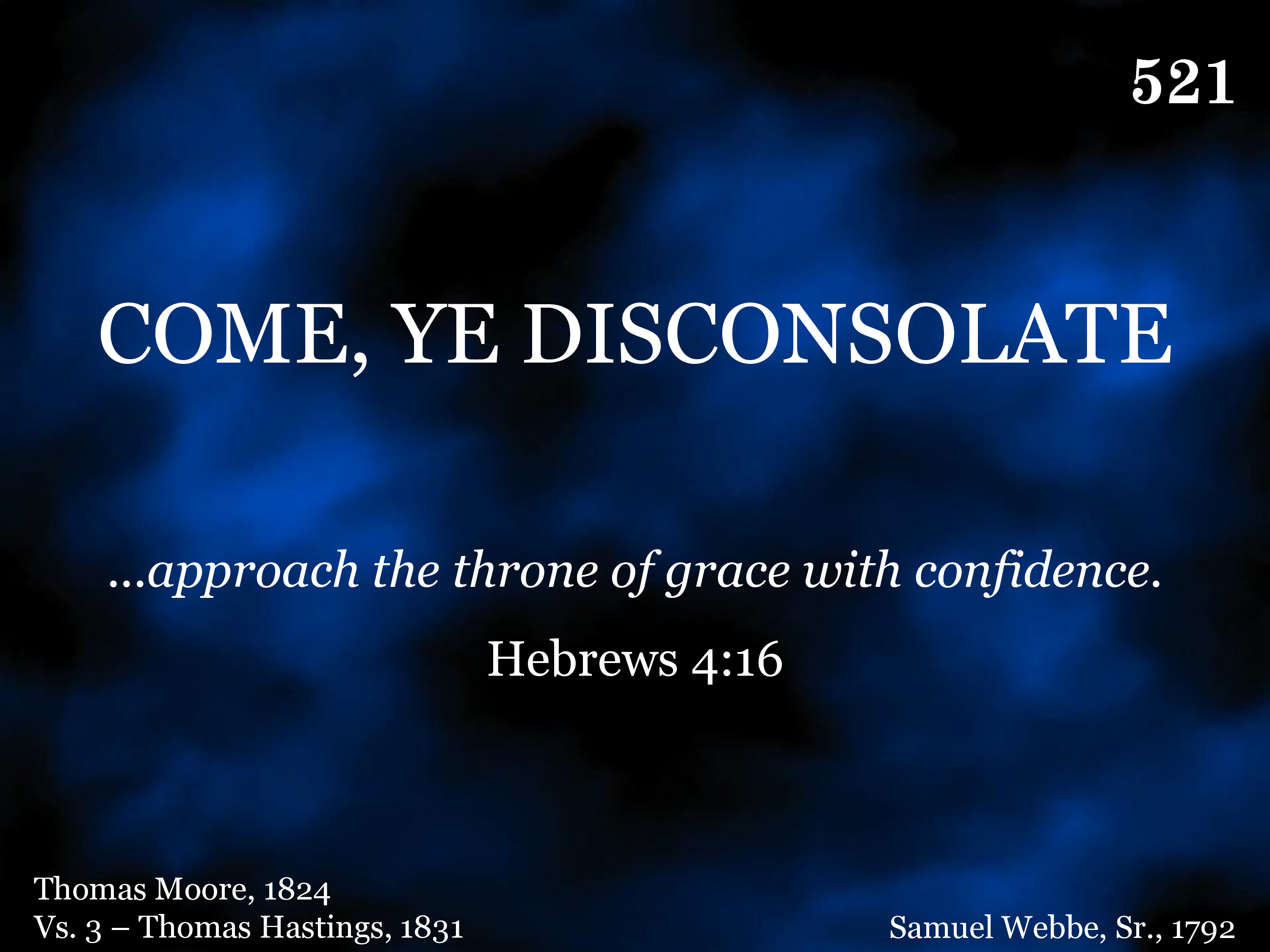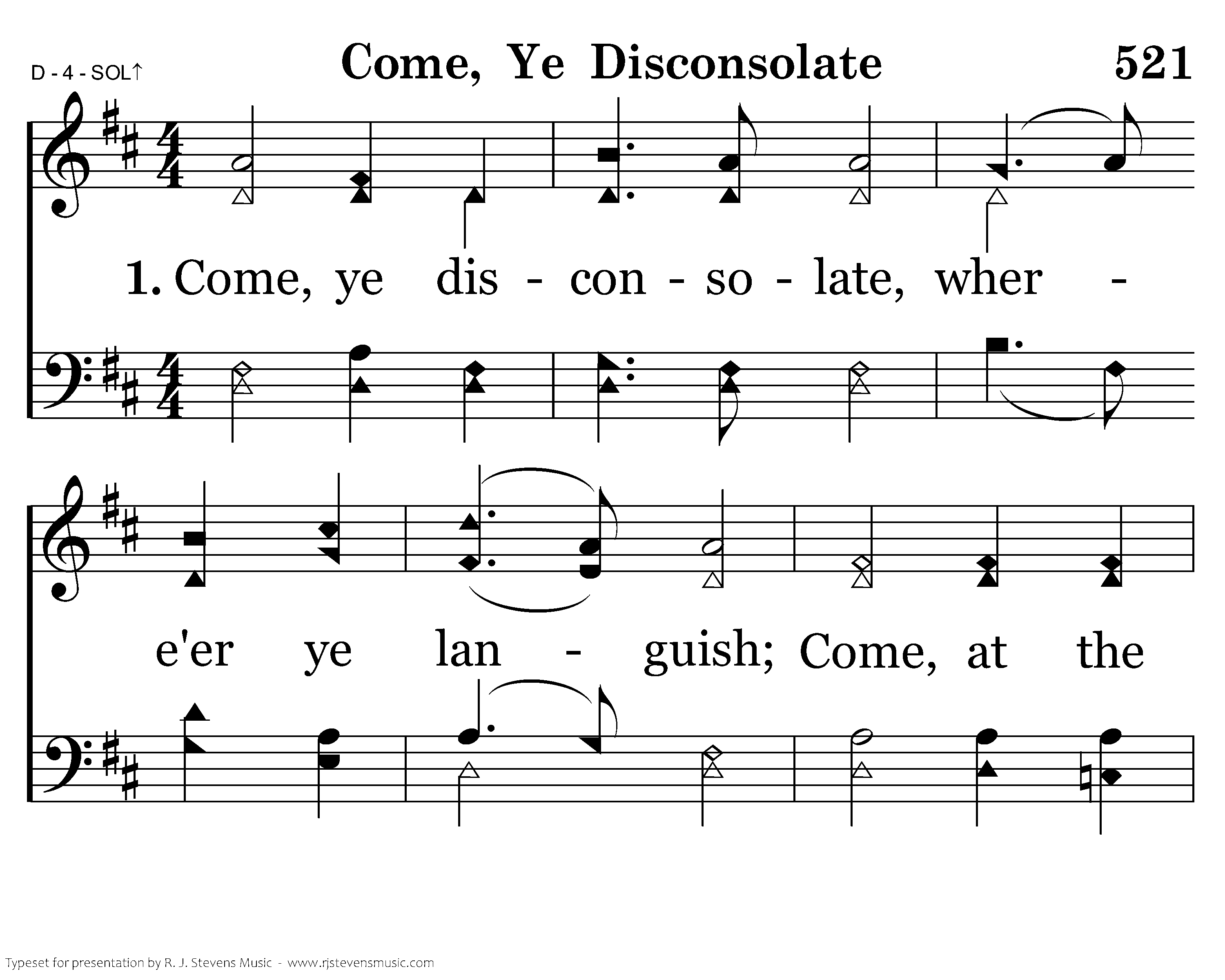 Come, ye disconsolate, where'er ye languish; Come, at the mercy seat fervently kneel; Here bring your wounded hearts, Here tell your anguish; Earth has no sorrow that heav'n cannot heal.