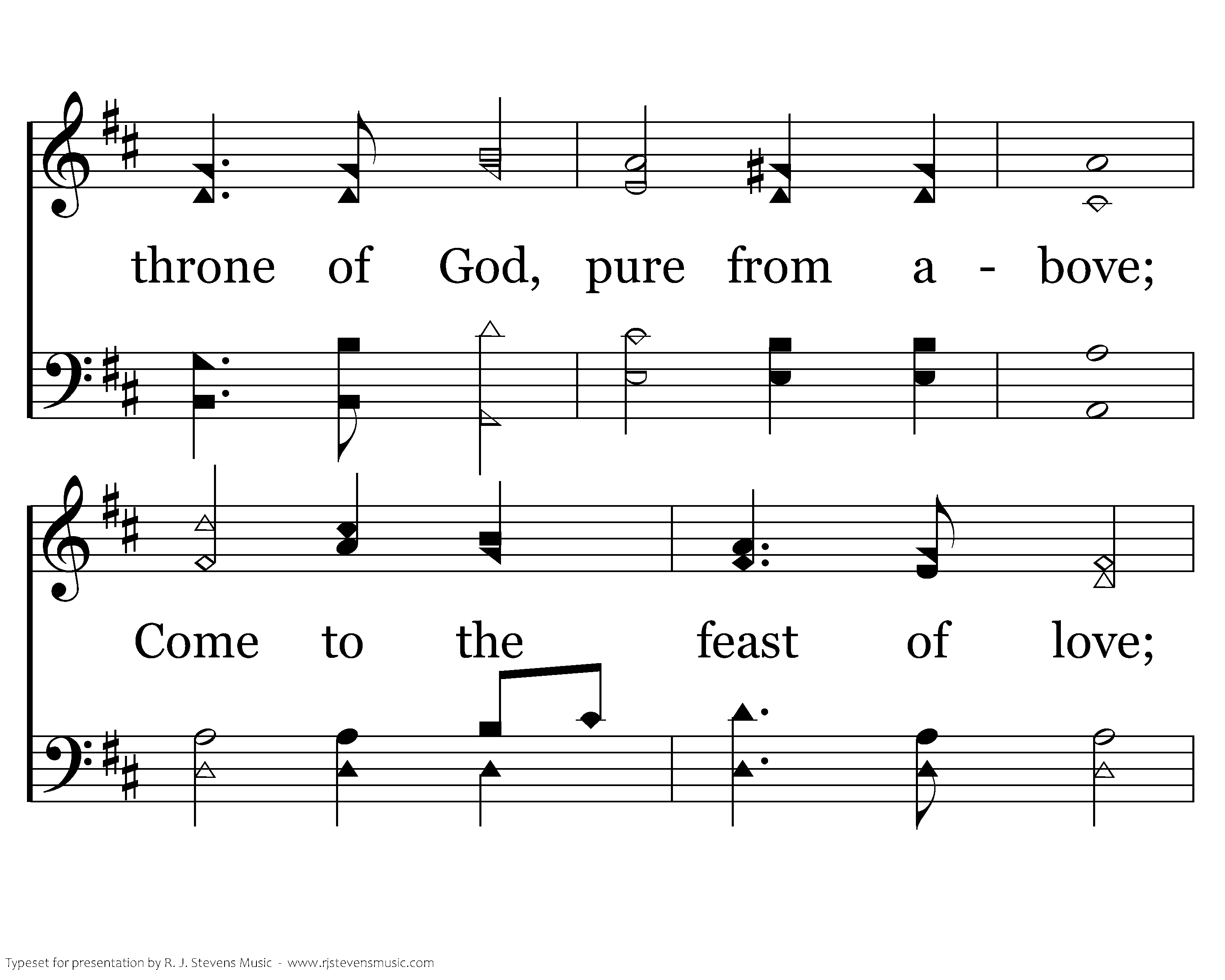Here see the Bread of Life, see waters flowing Forth from the throne of God, pure from above; Come to the feast of love; come, ever knowing Earth has no sorrow that heav'n can't remove.