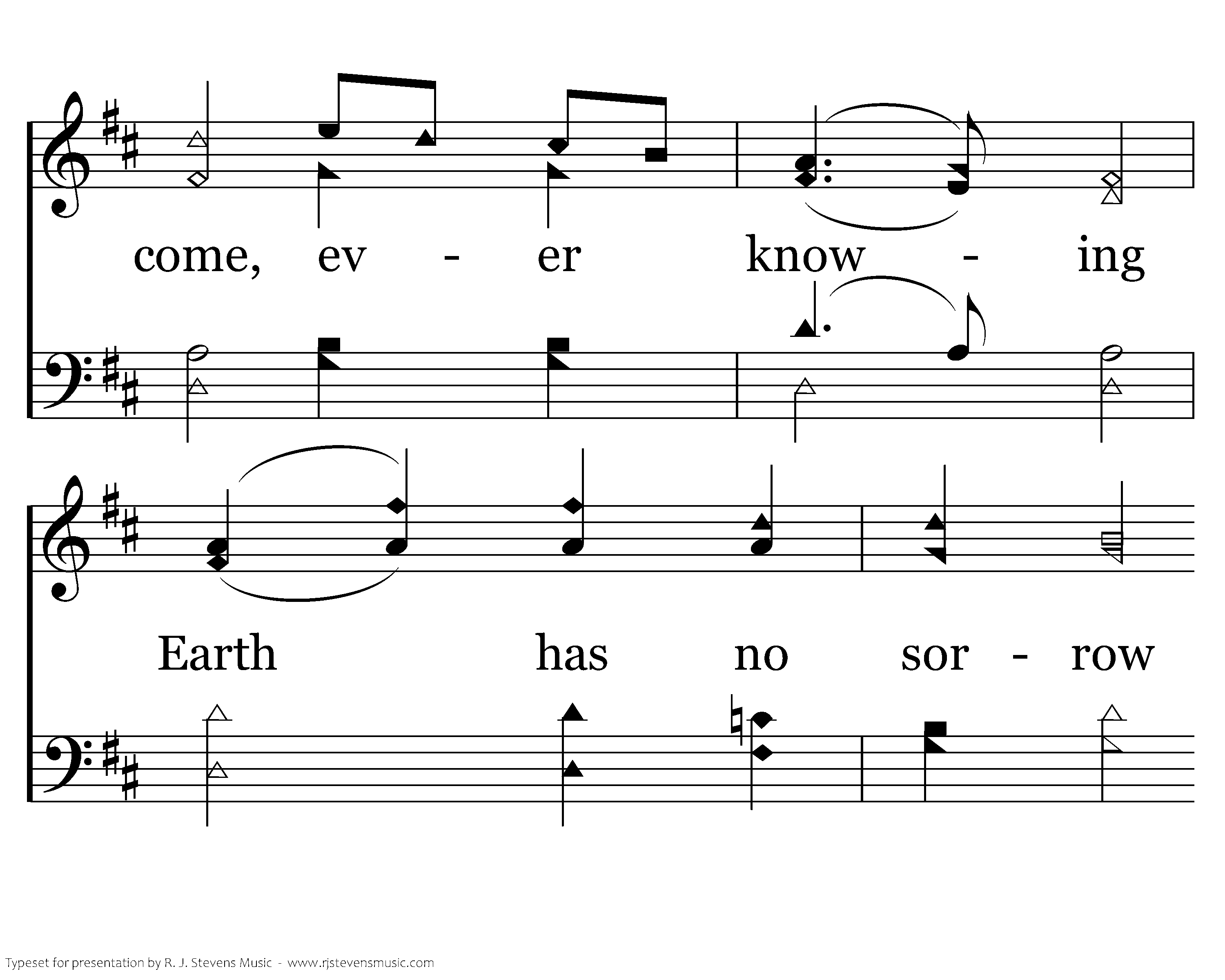 Joy of desolate, light of the straying, Hope of the penitent, fadeless and pure; Here speaks the Comforter, tenderly saying, "Earth has no sorrow that heav'n cannot cure."