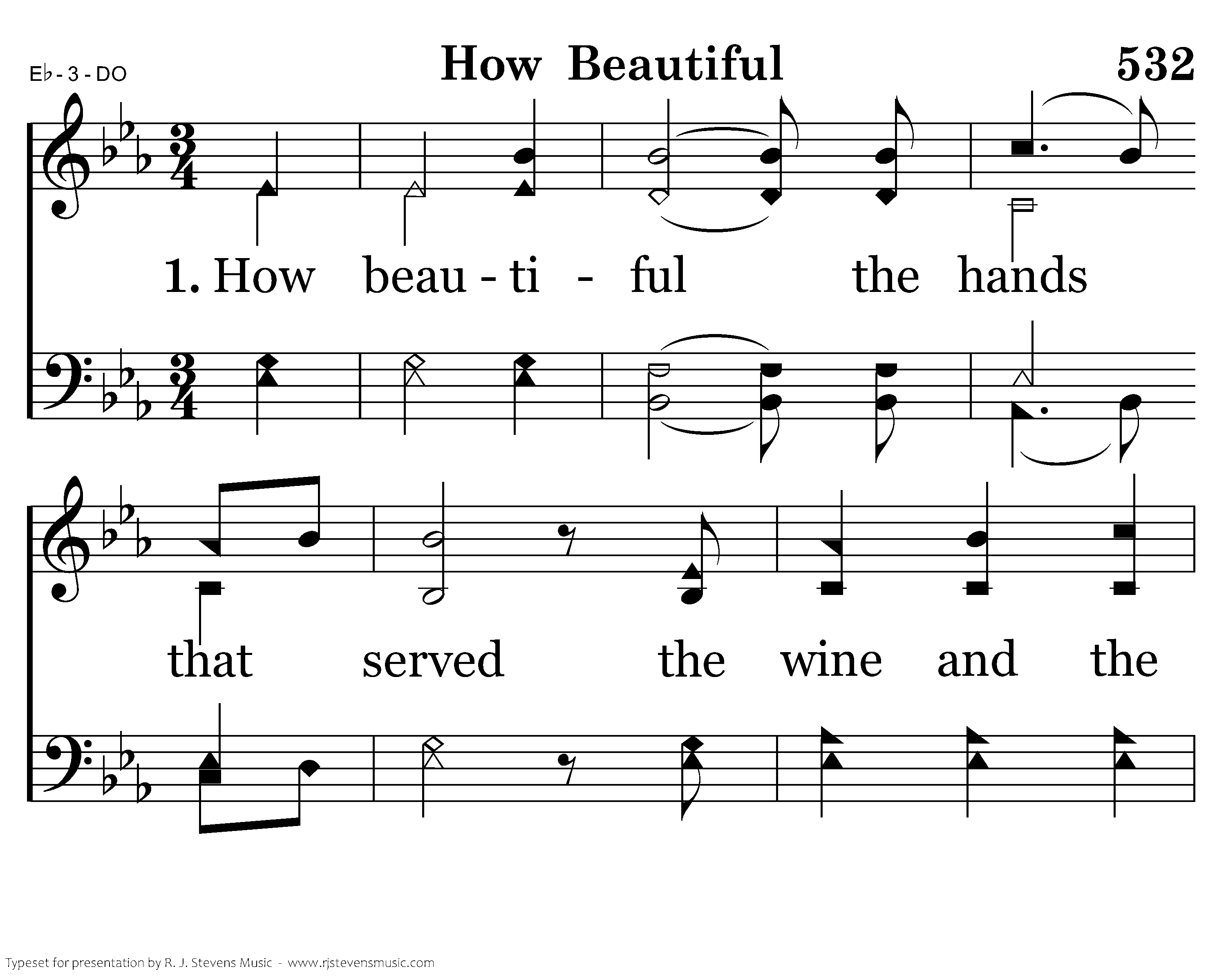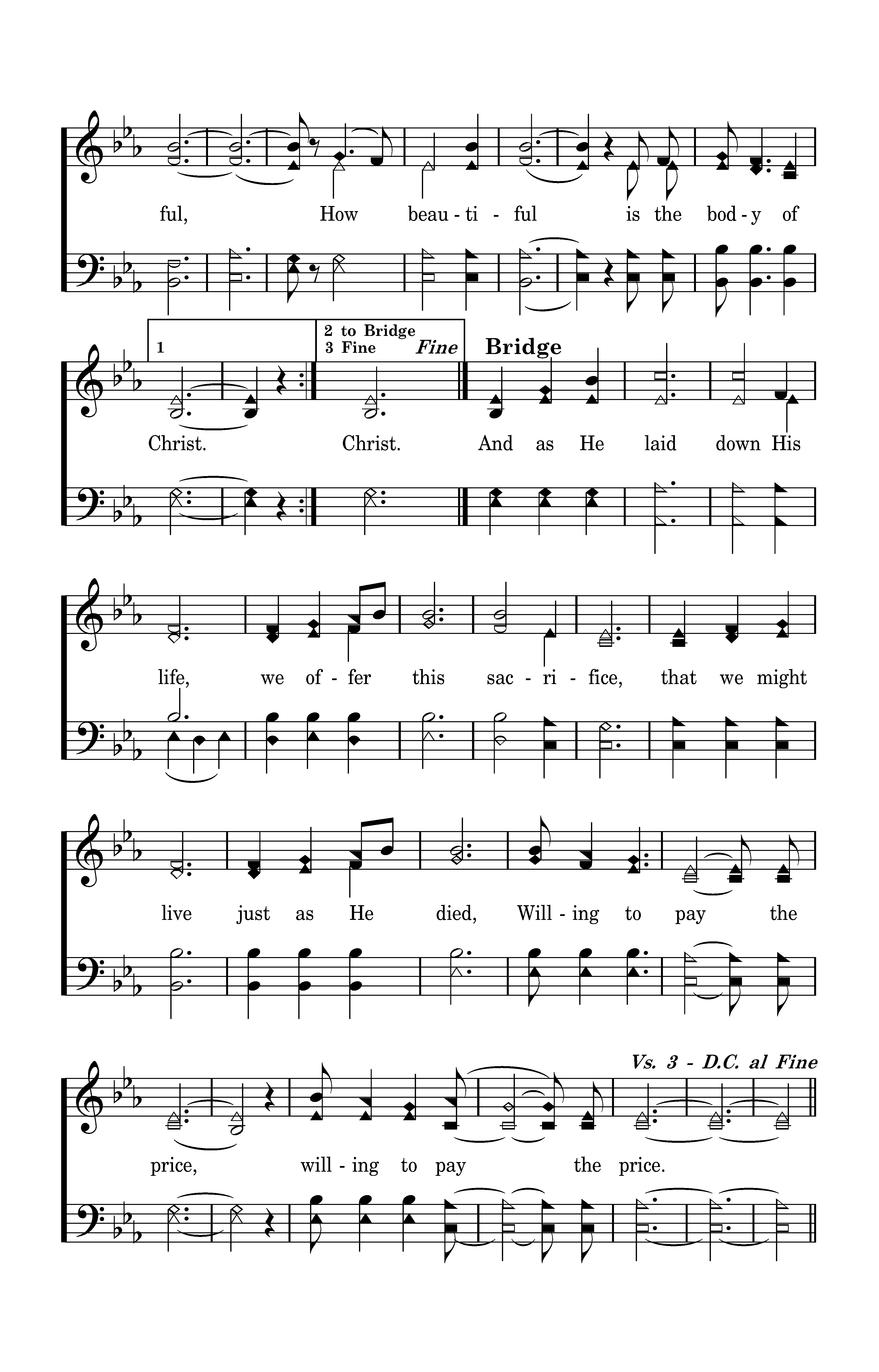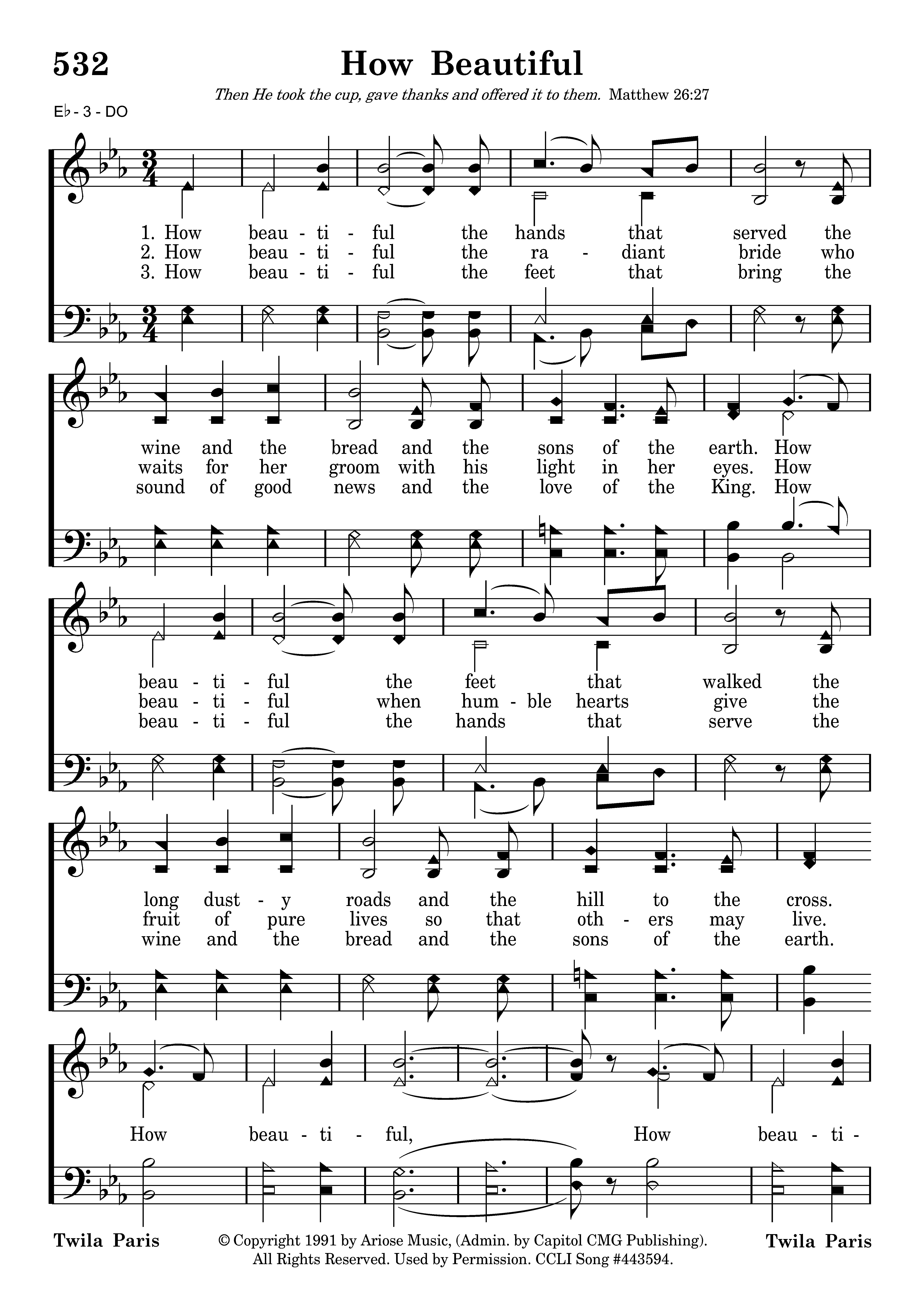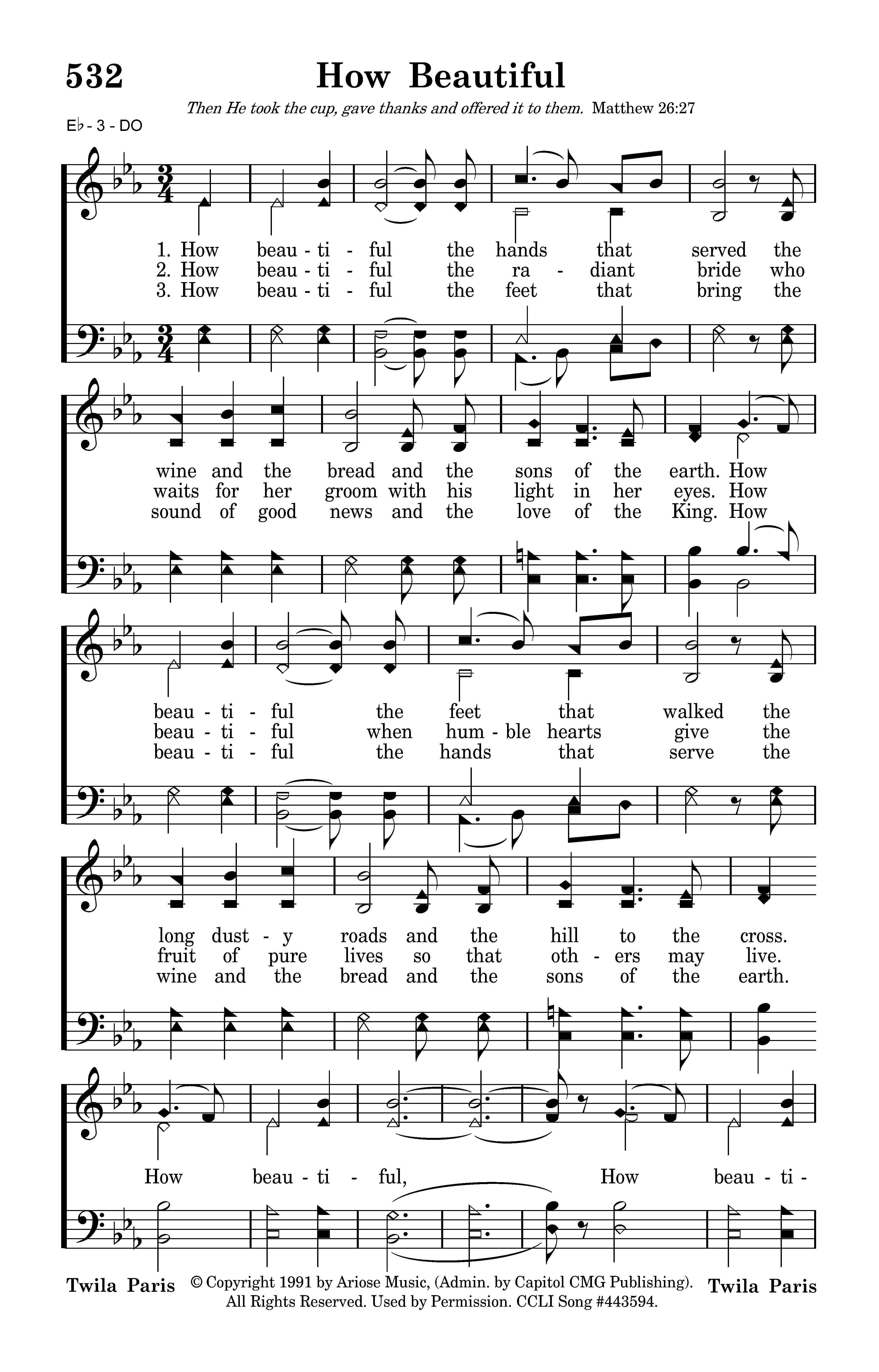 How beautiaful the hands that served the wine and the bread and the sons of the earth. How beautiful the feet that walked the long dusty roads and the hill to the cross. How beautiful, How beautiful How beautiful is the body of Christ.