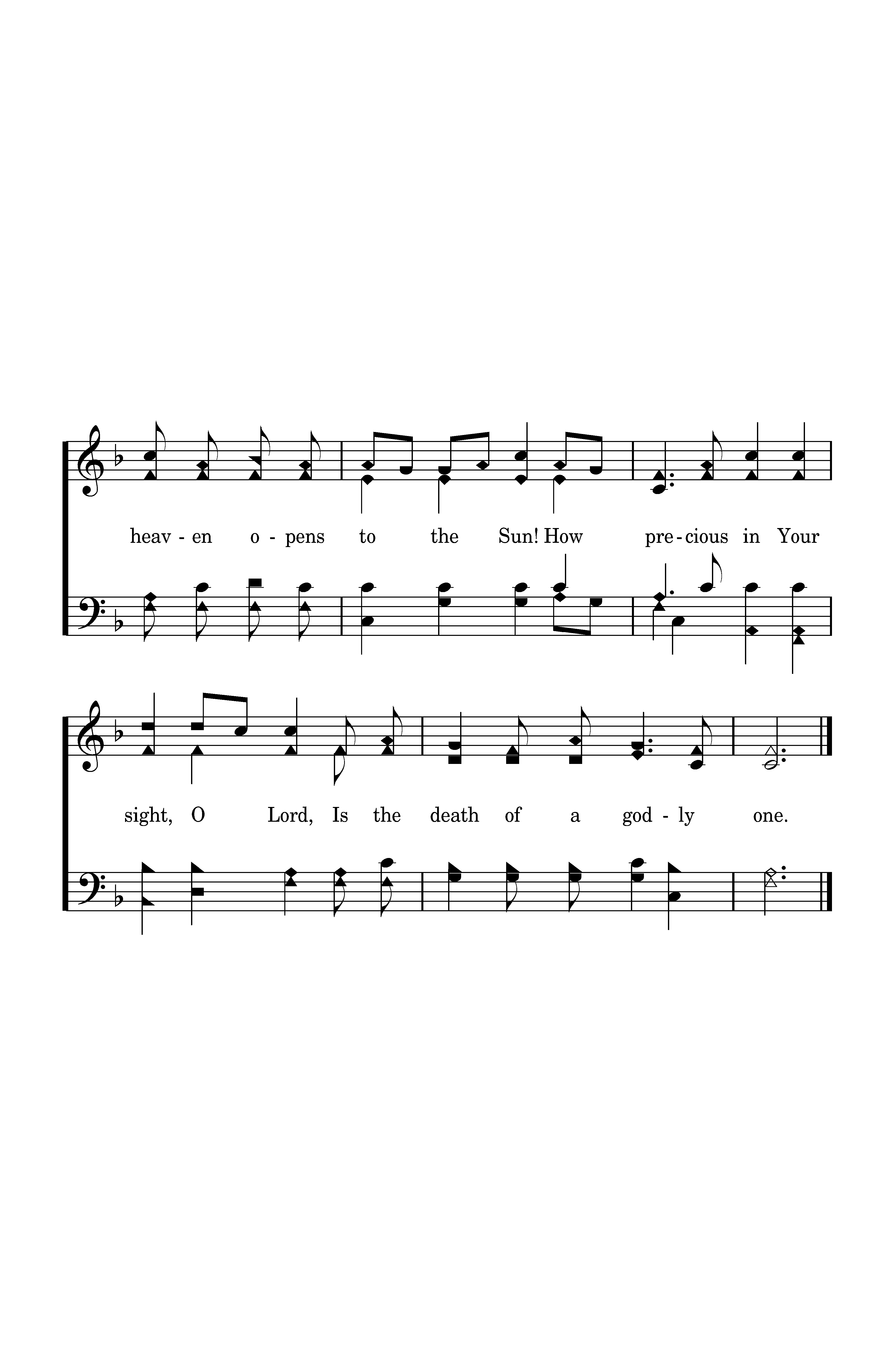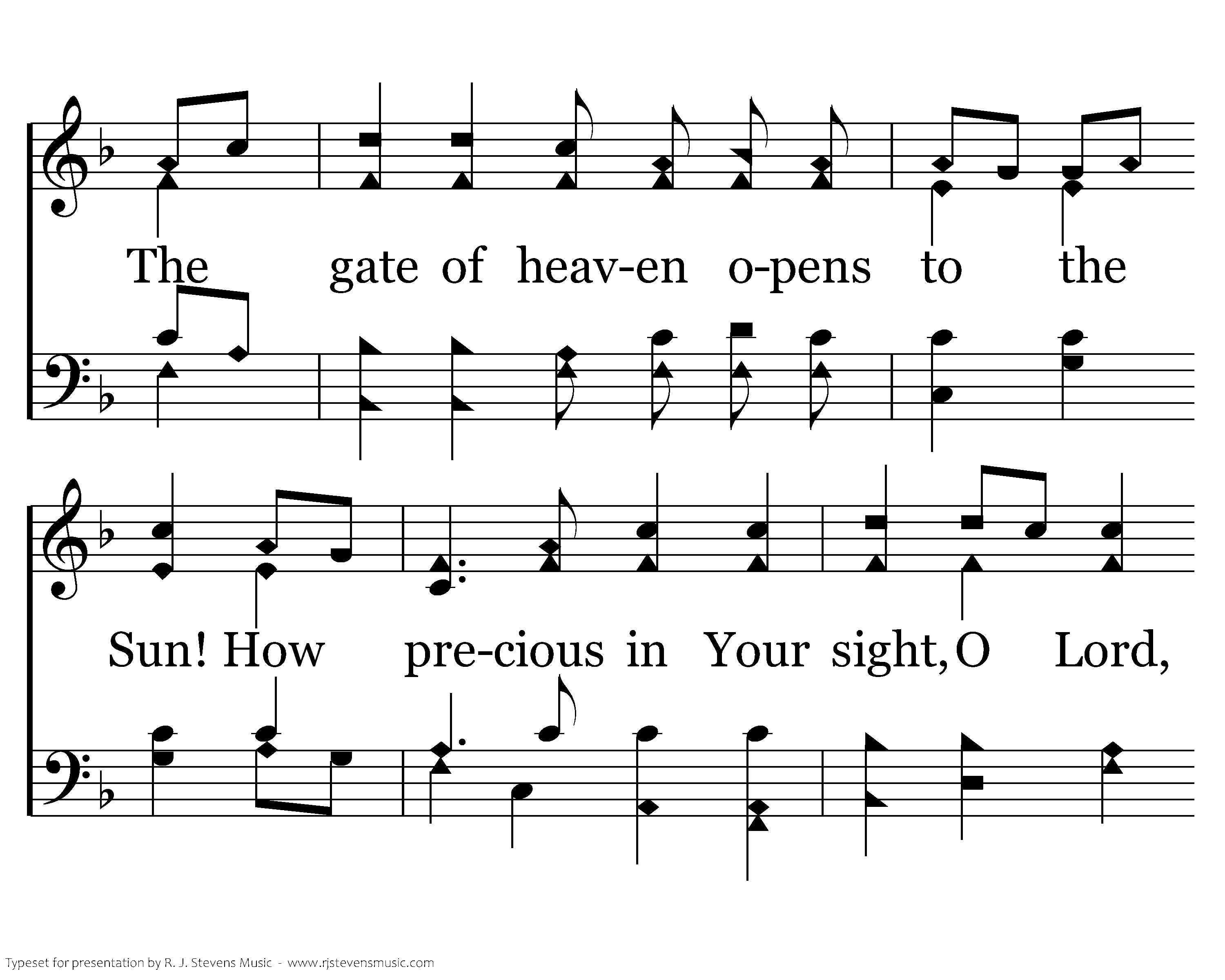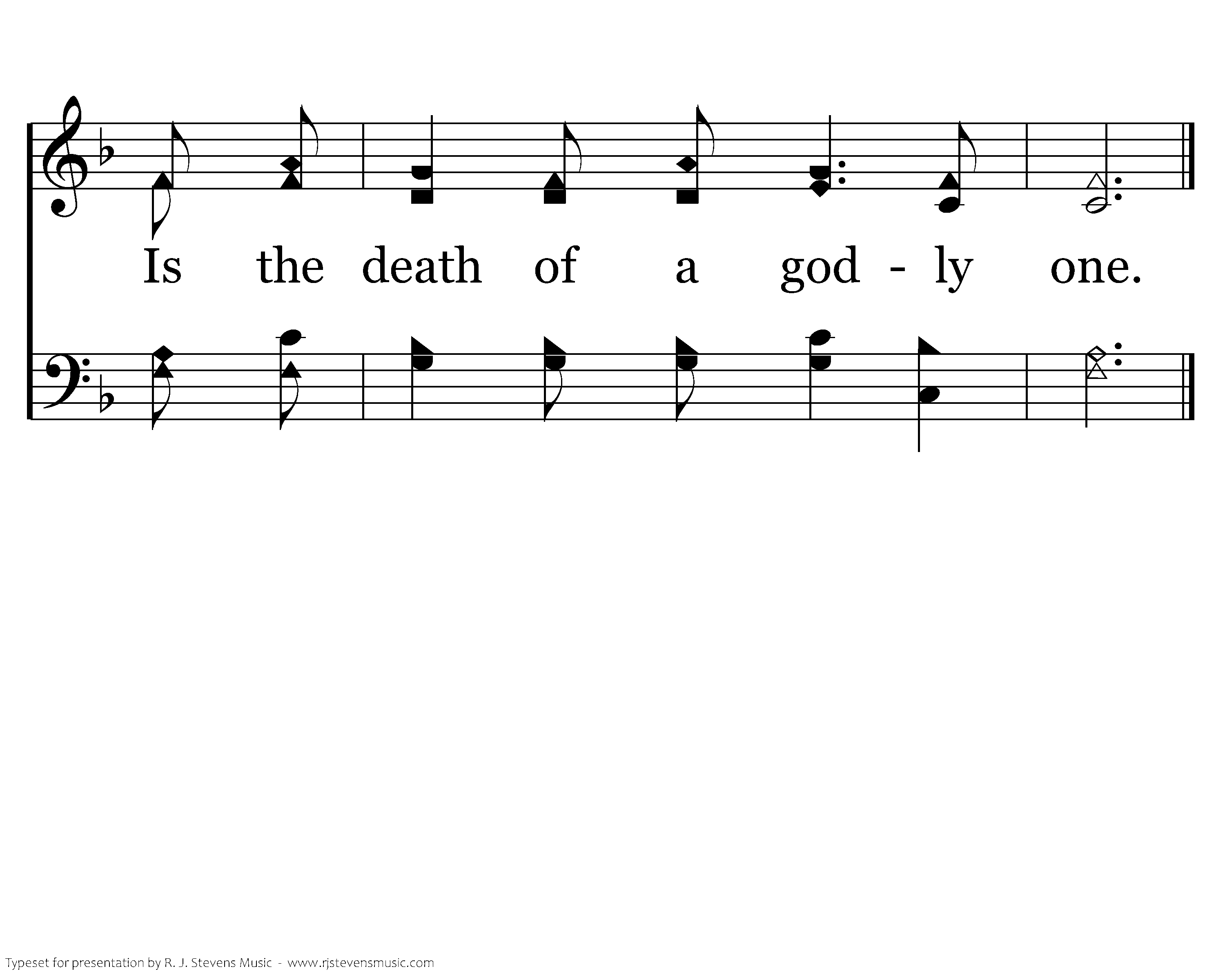 Another race is finished; A burden is laid down; The gate of heaven opens to the Sun! How precious in your sight, O lord, Is the death of a godly one.