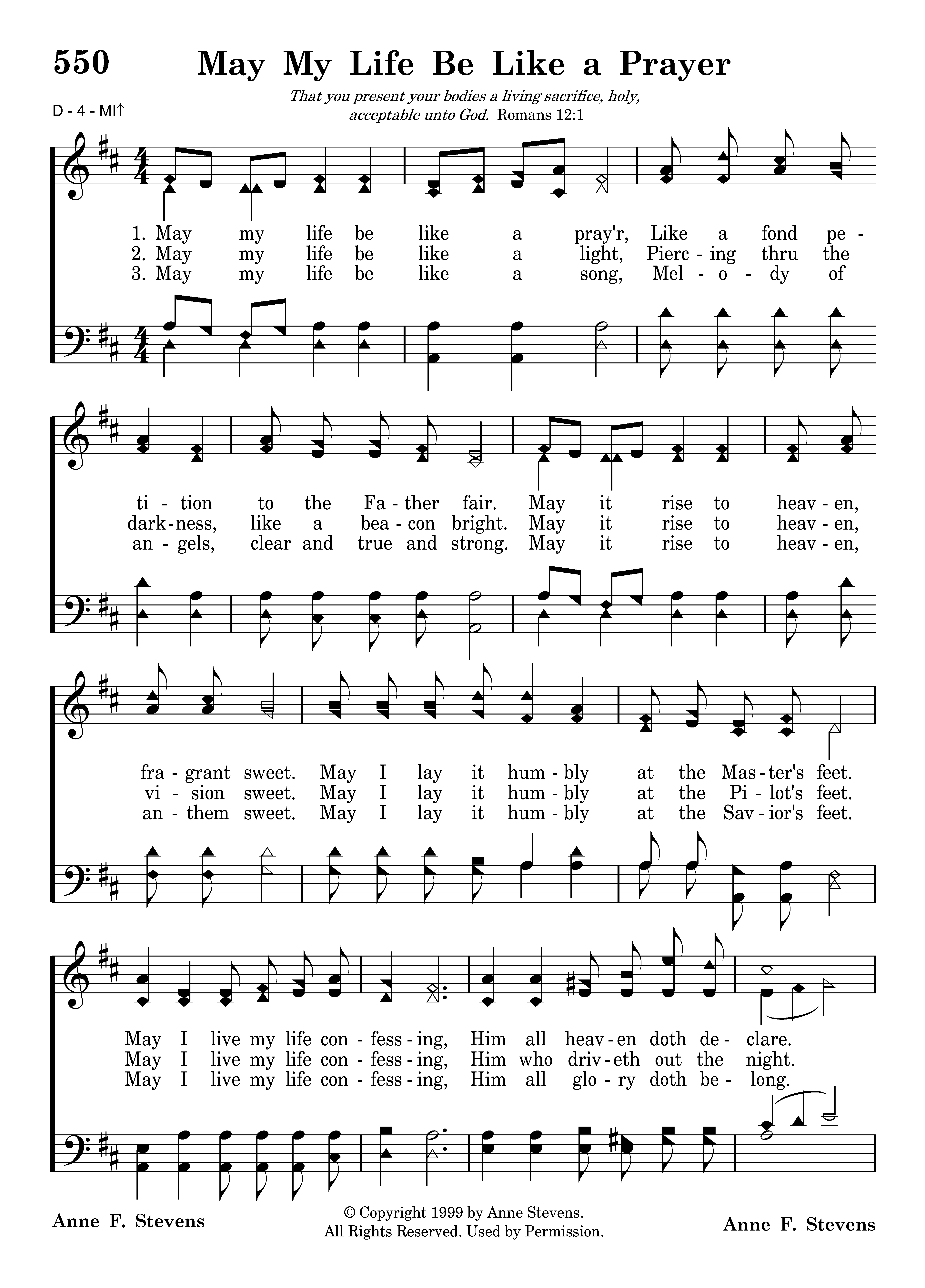May my life be like a prayer, Like a fond petition to the Father fair. May it rise to heaven, fragrant sweet. May I lay it humbly at the Master's feet. May I live my life confessing, Him all heaven doth declare. May my life be like a blessing. May my life be like a prayer.