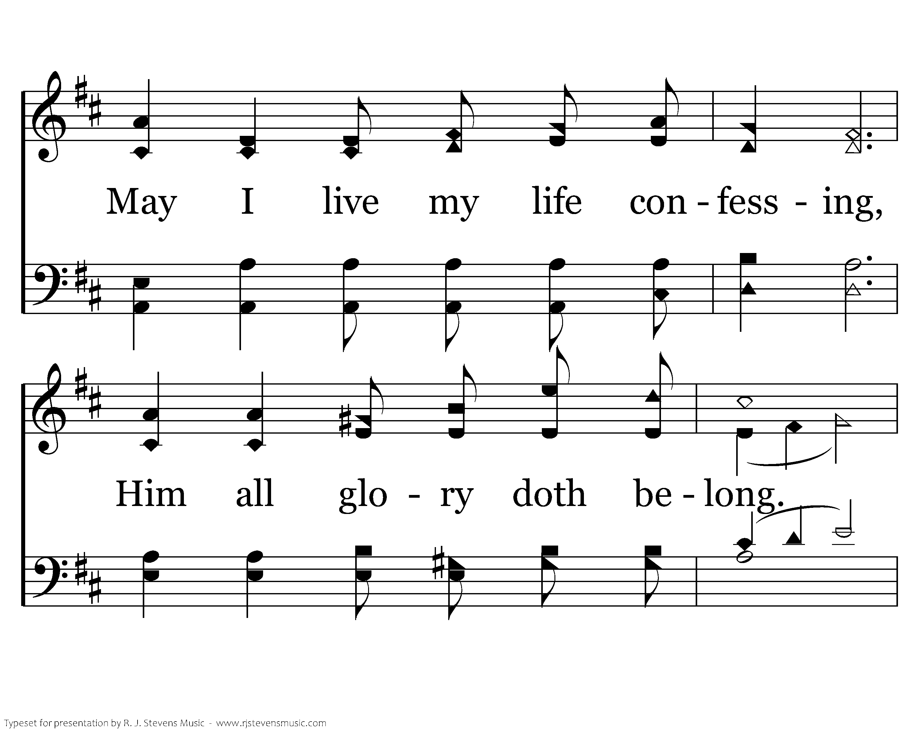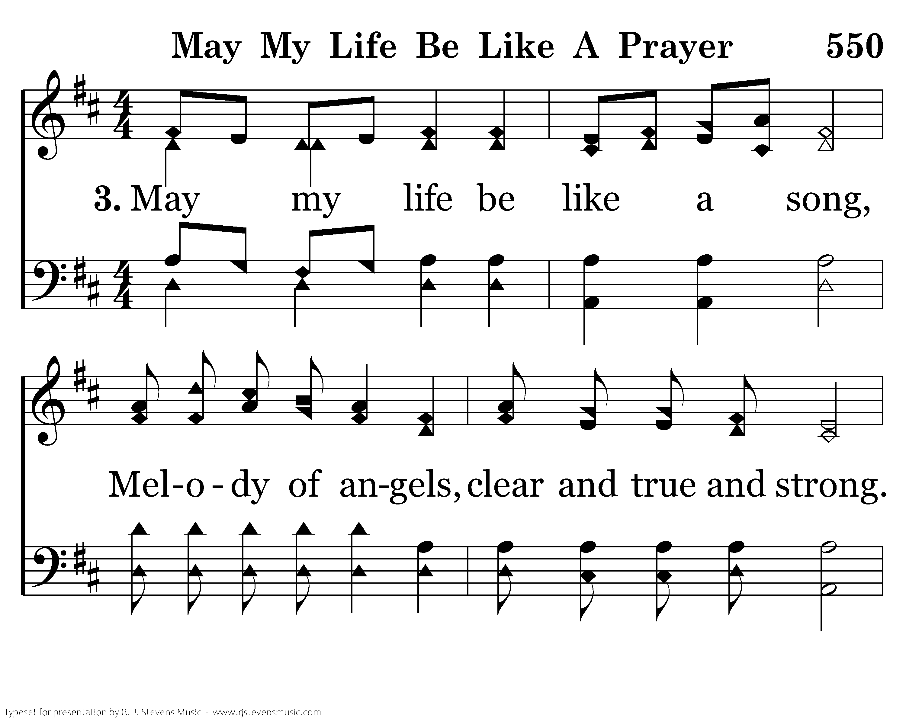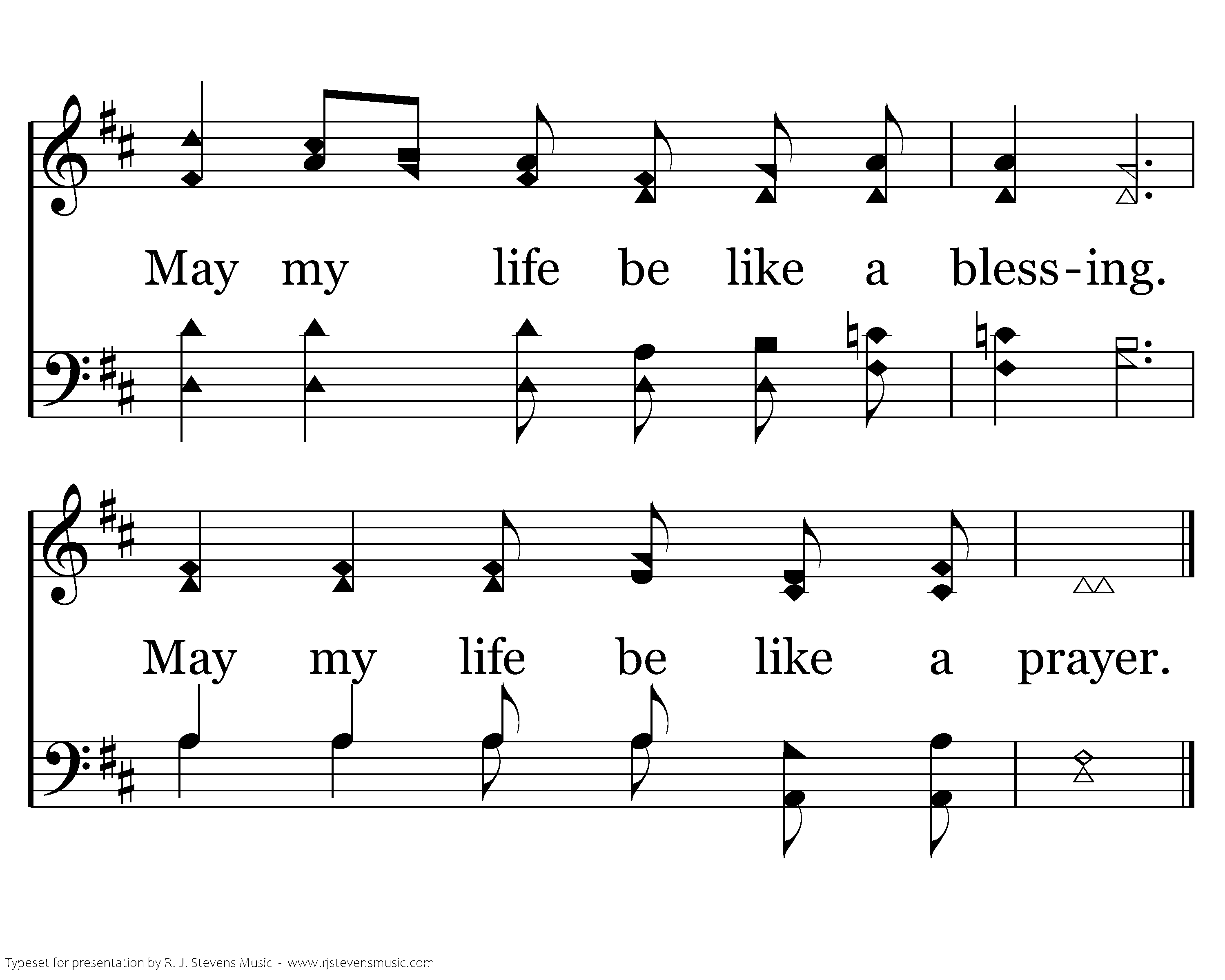 May my life be like a song, Melody of angels, clear and true and strong. May it rise to heaven, anthem sweet. May I lay it humbly at the Savior's feet. May I live my life confessing, Him all glory doth belong. May my life be like a blessing. May my life be like a song.