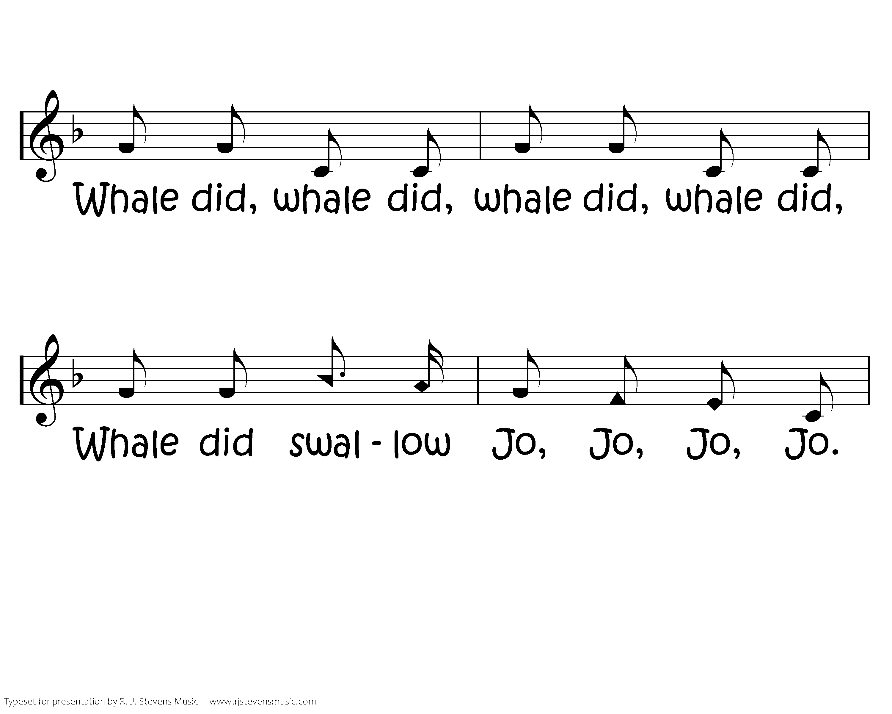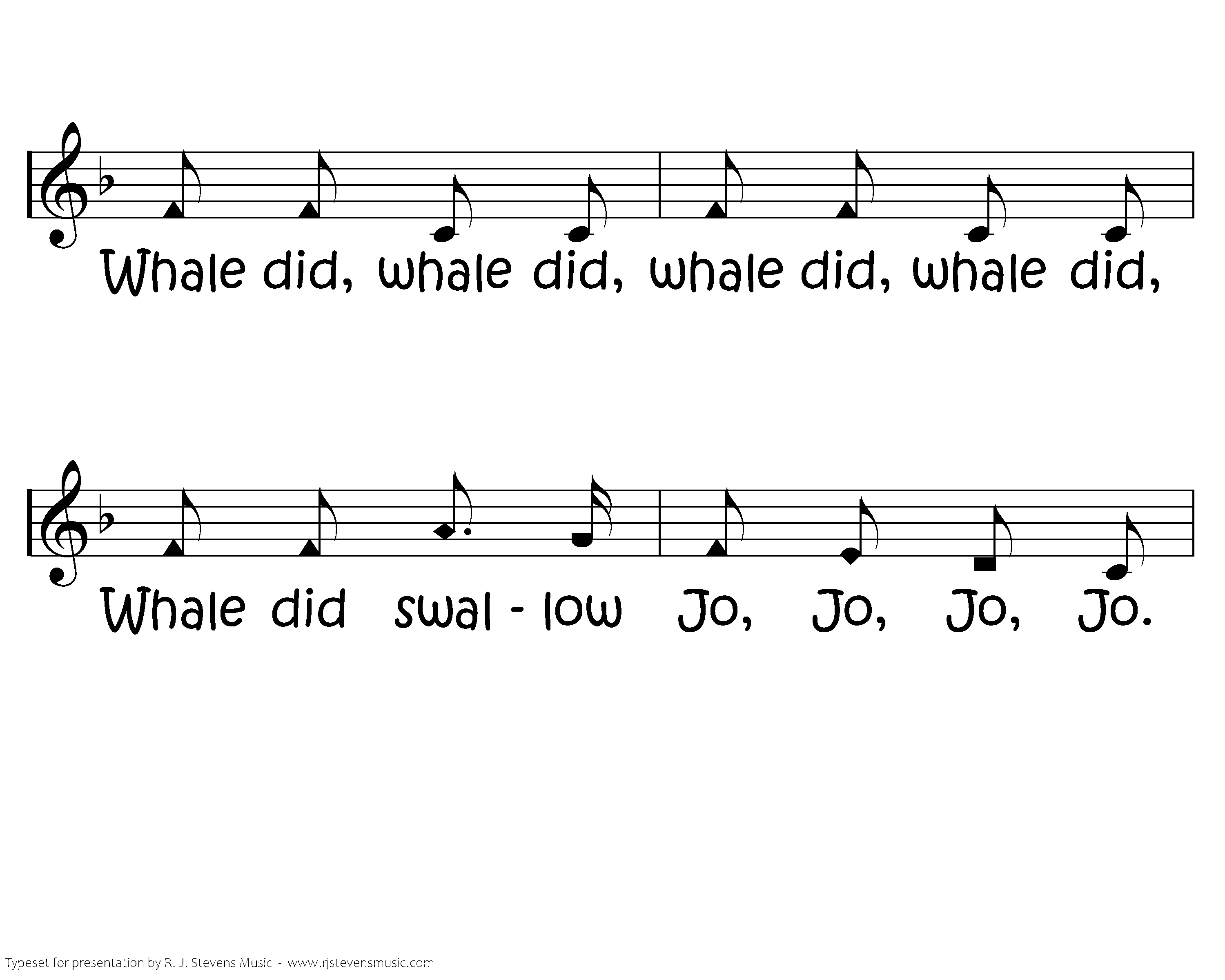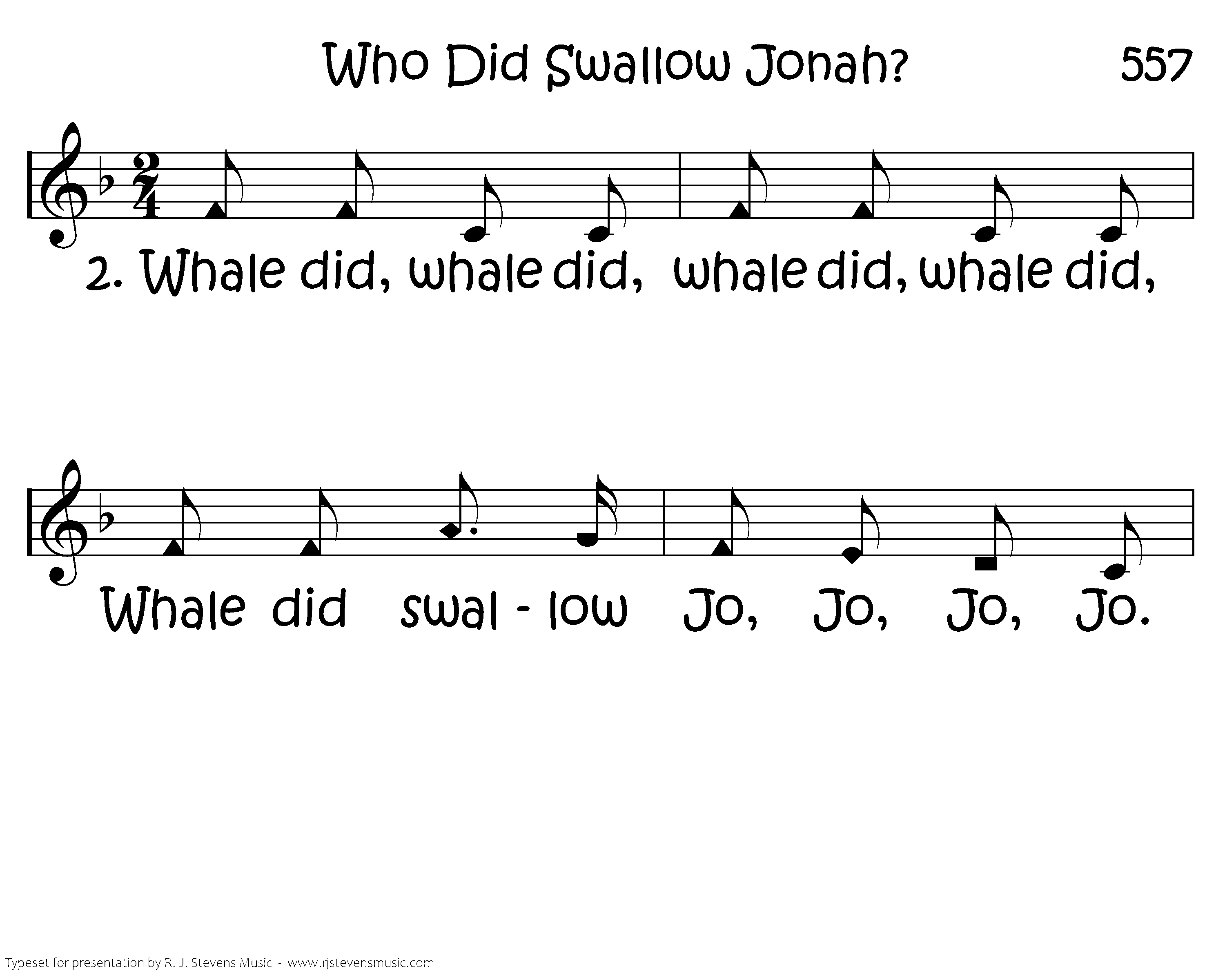 Whale did, whale did, whale did, whale did, Whale did swallow Jo, Jo, Jo, Jo. Whale did, whale did, whale did, whale did, Whale did swallow Jo, Jo, Jo, Jo. Whale did, whale did, whale did, whale did, Whale did swallow Jo, Jo, Jo, Jo. Whale did swallow Jonah, Whale did swallow Jonah, Whale did swallow Jonah up!