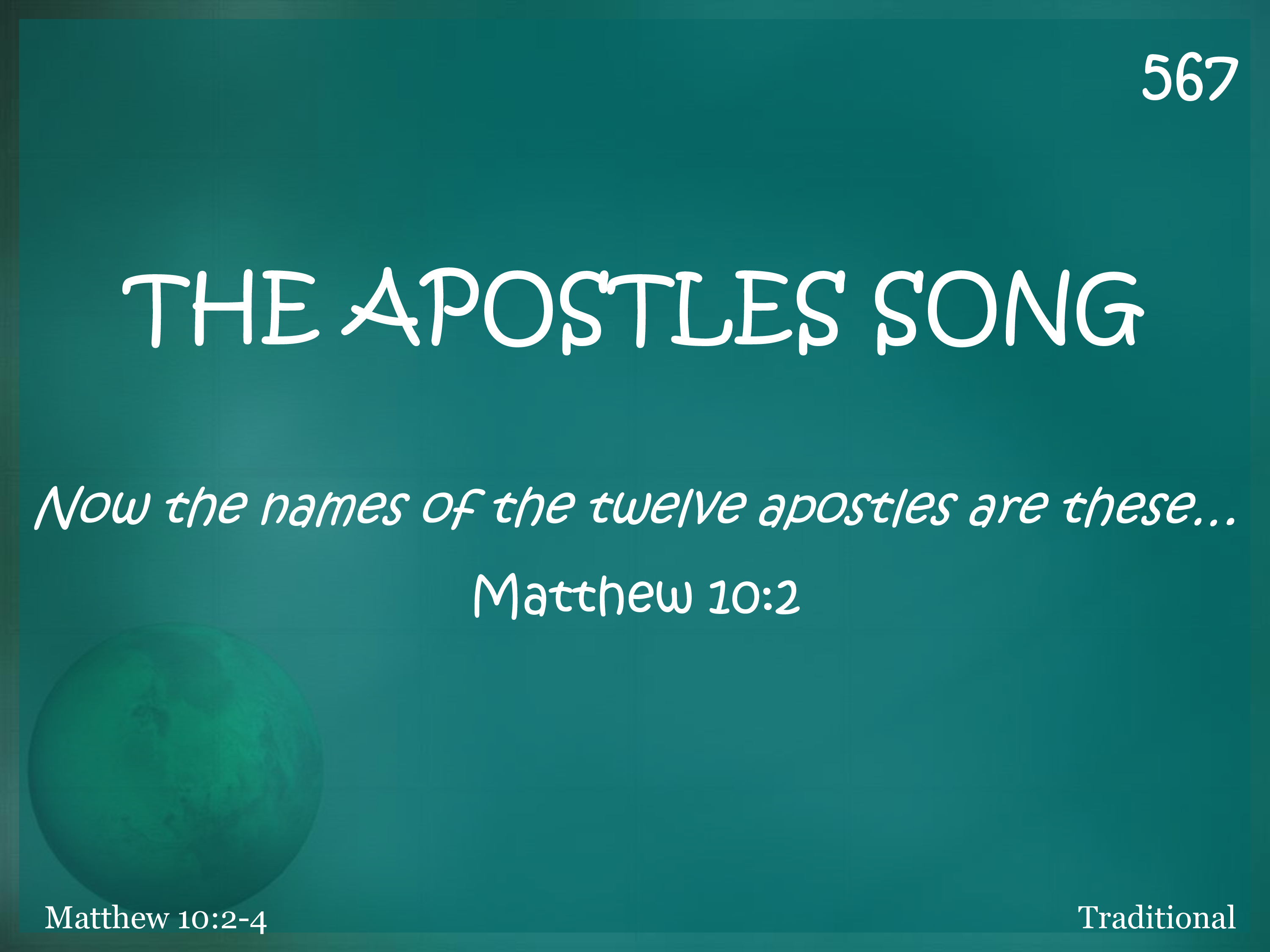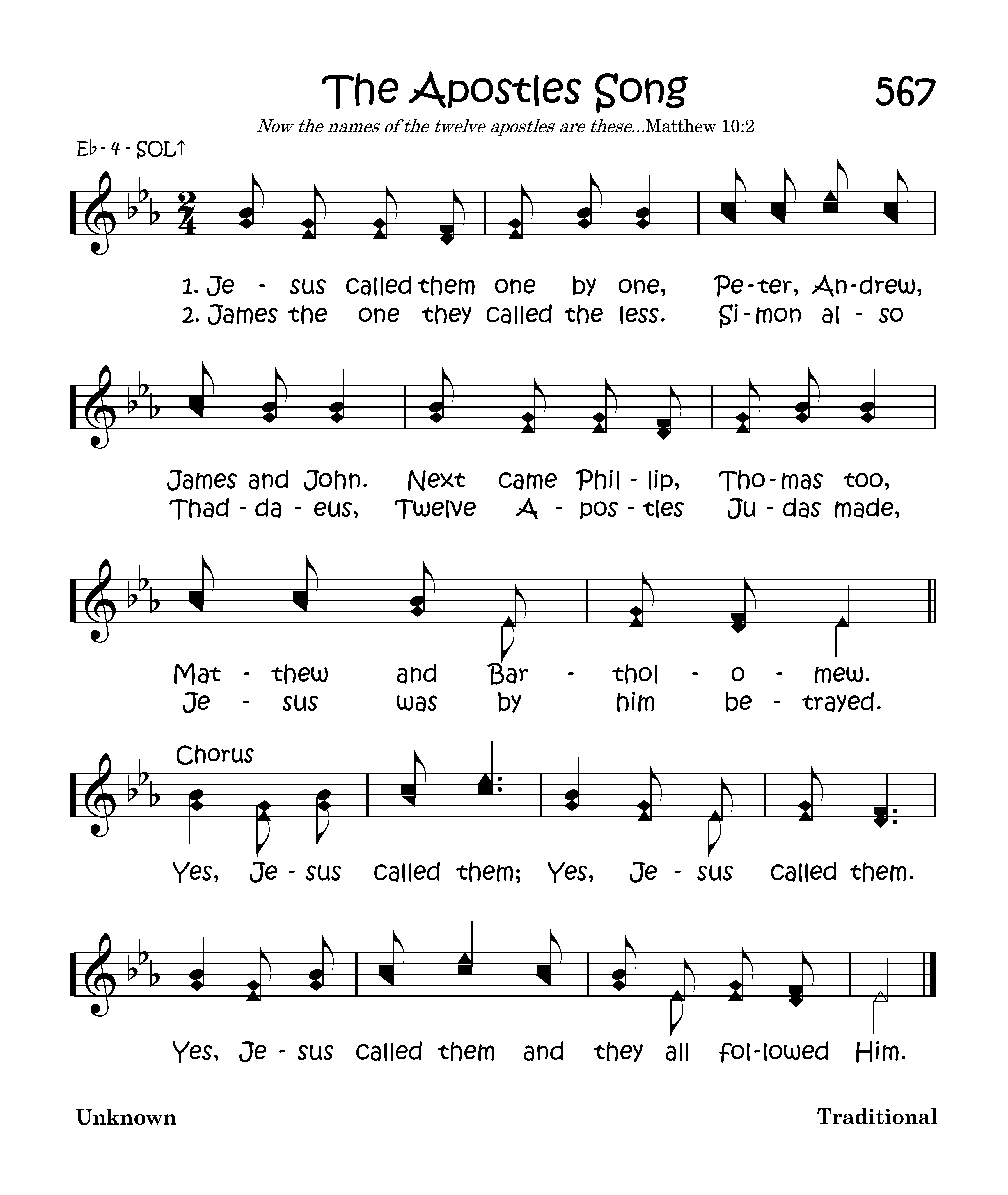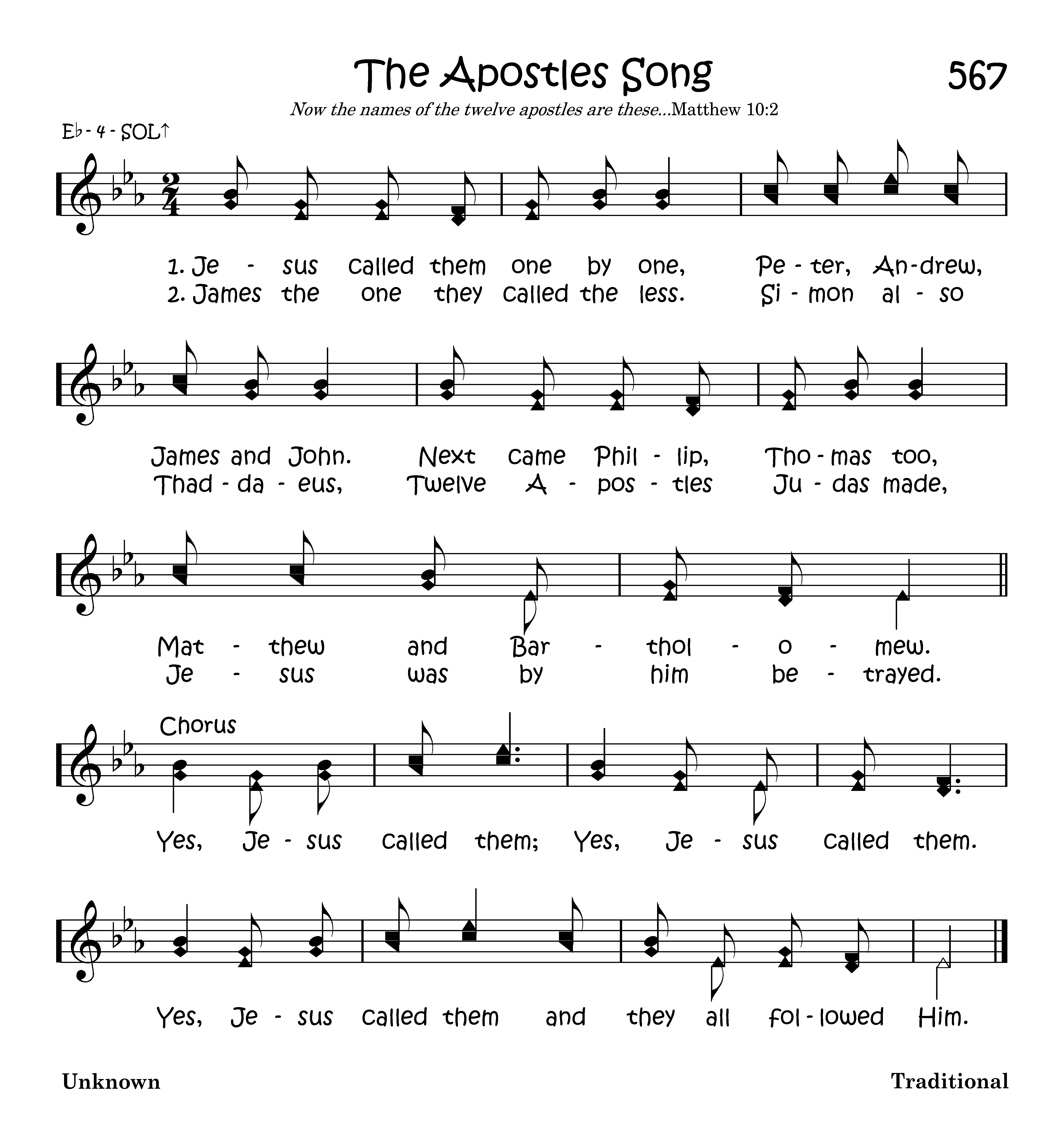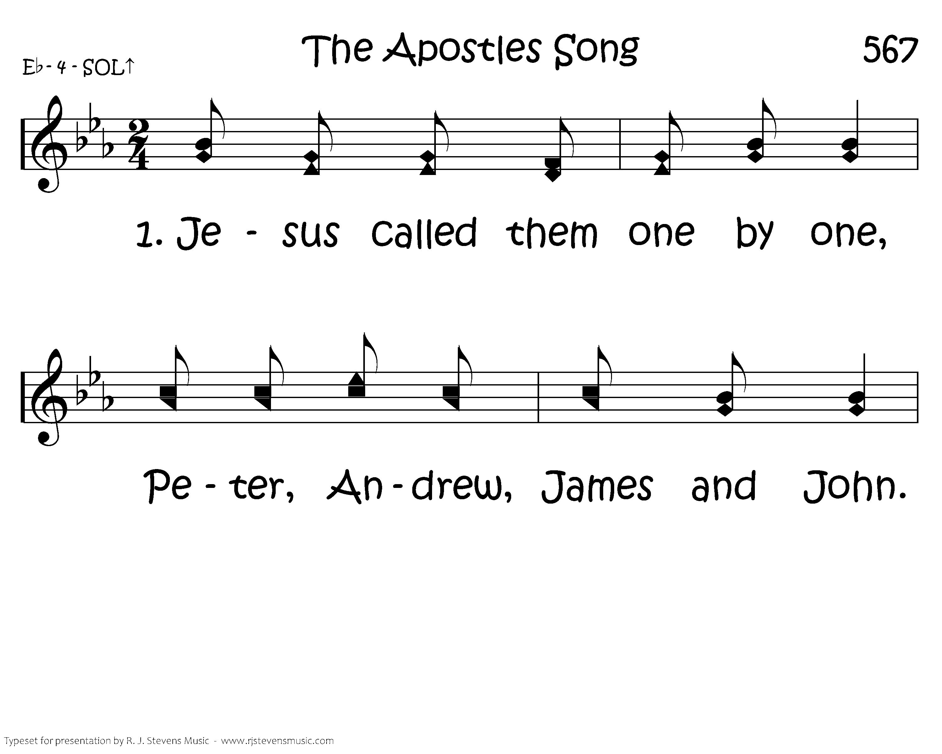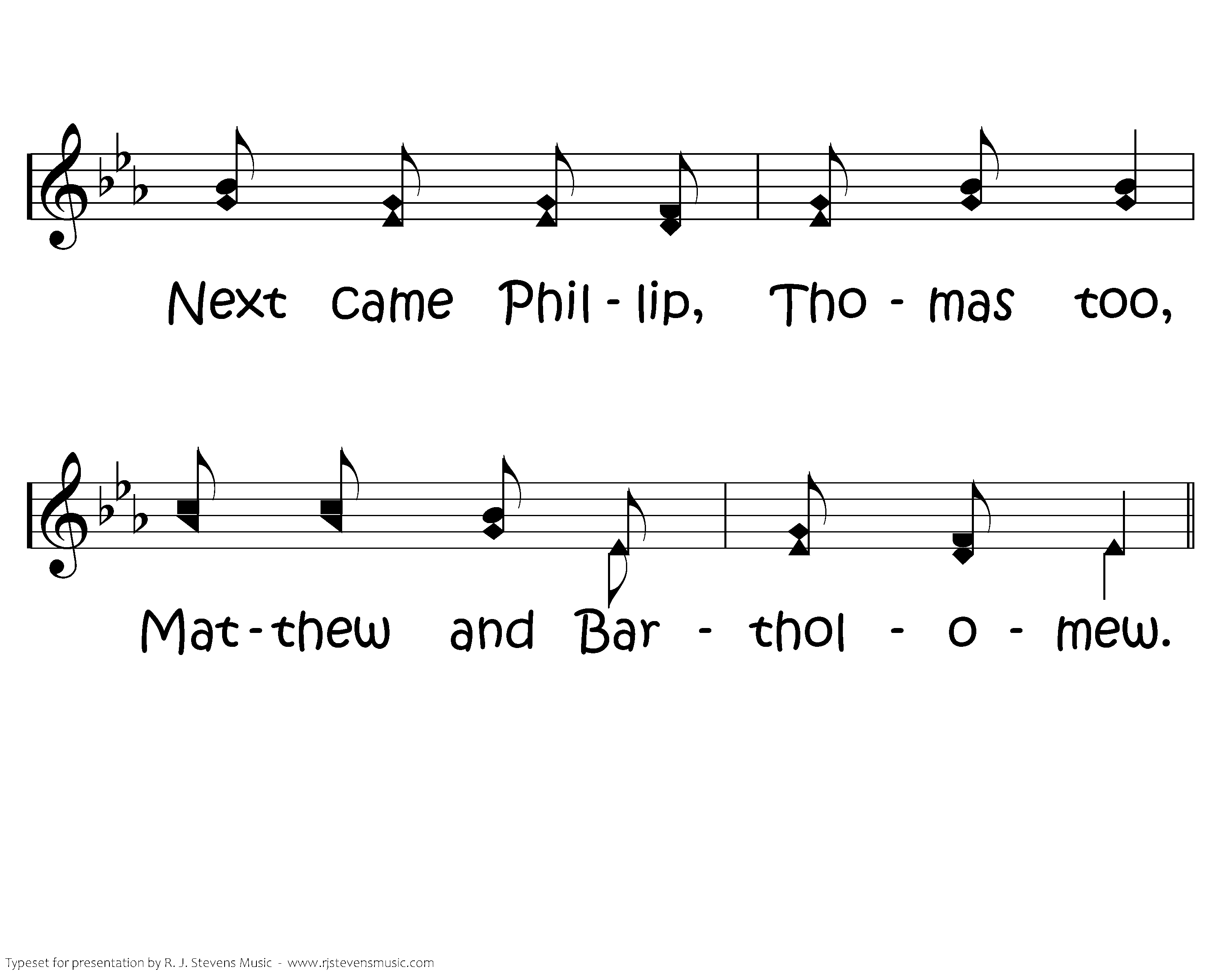 Jesus called one by one, Peter, Andrew, James and John. Next came Phillip, Tomas too, Matthew and Bartholomew.