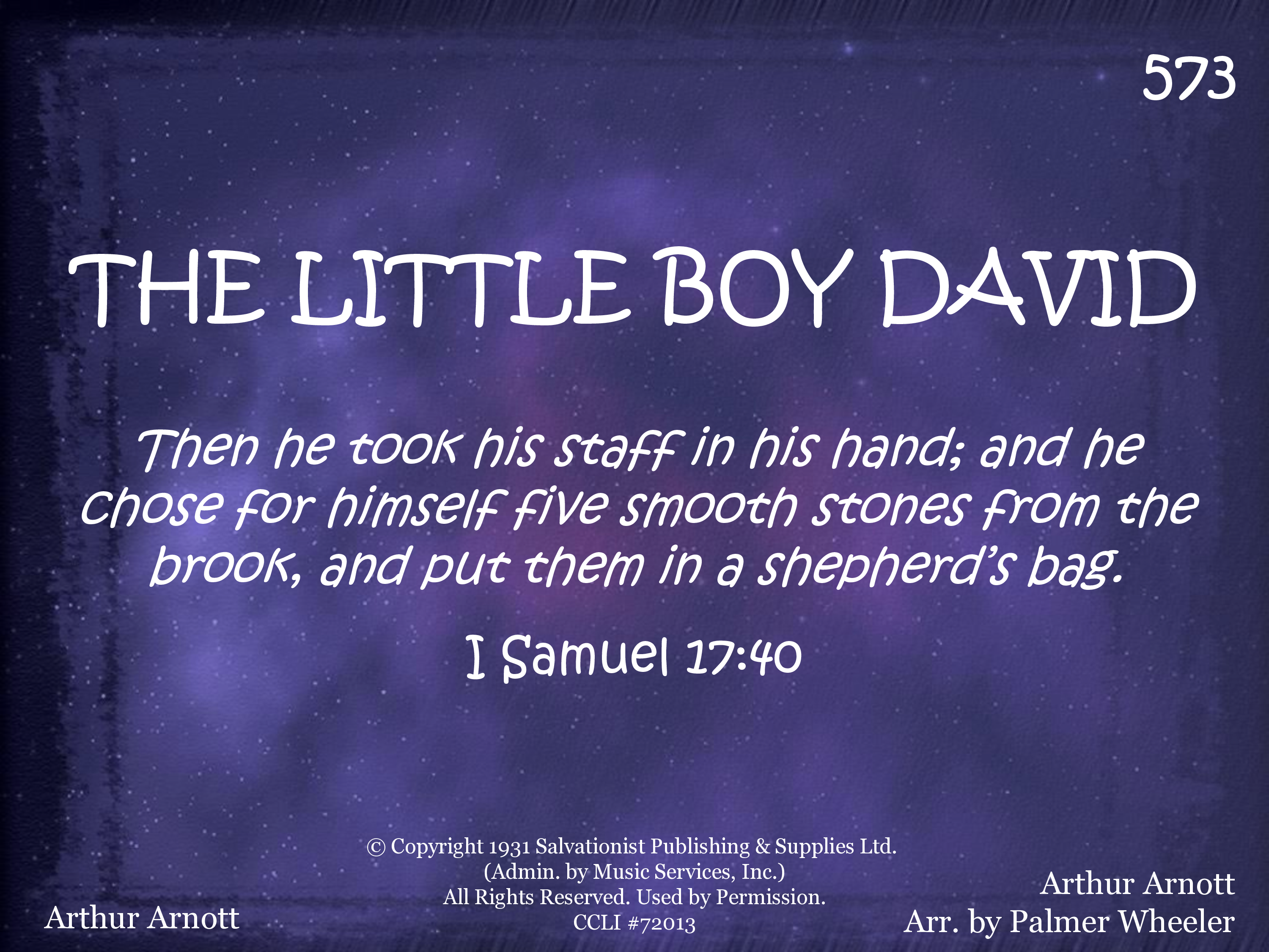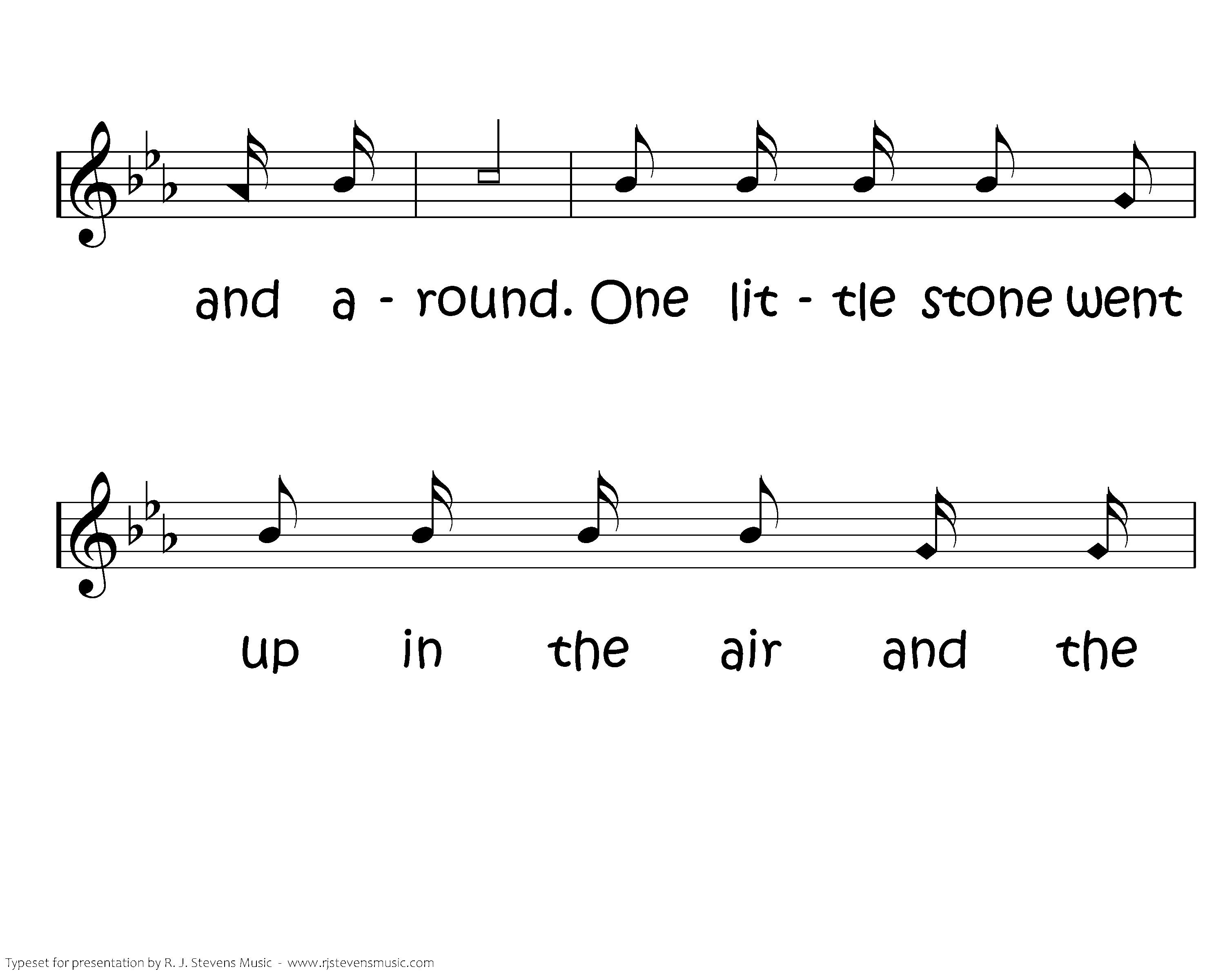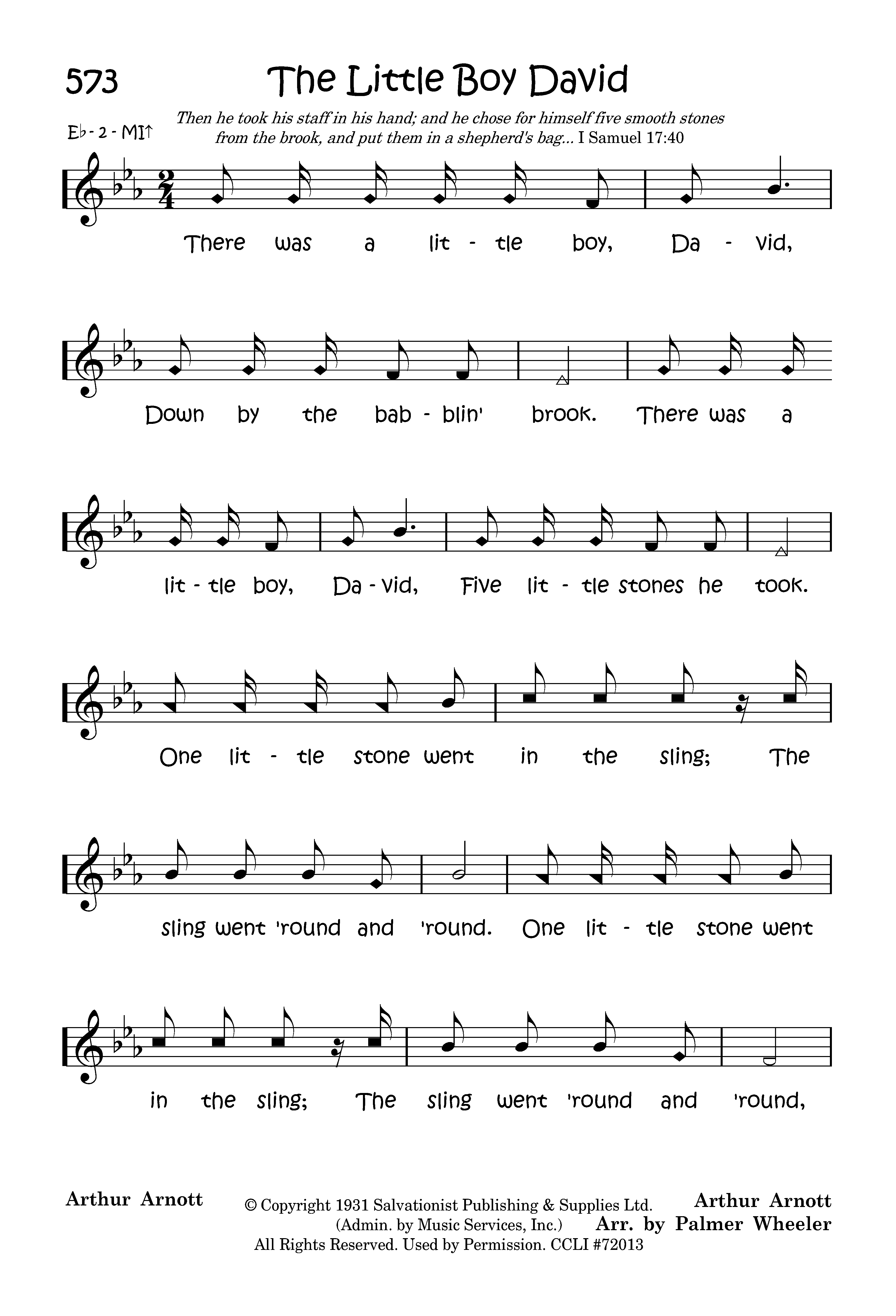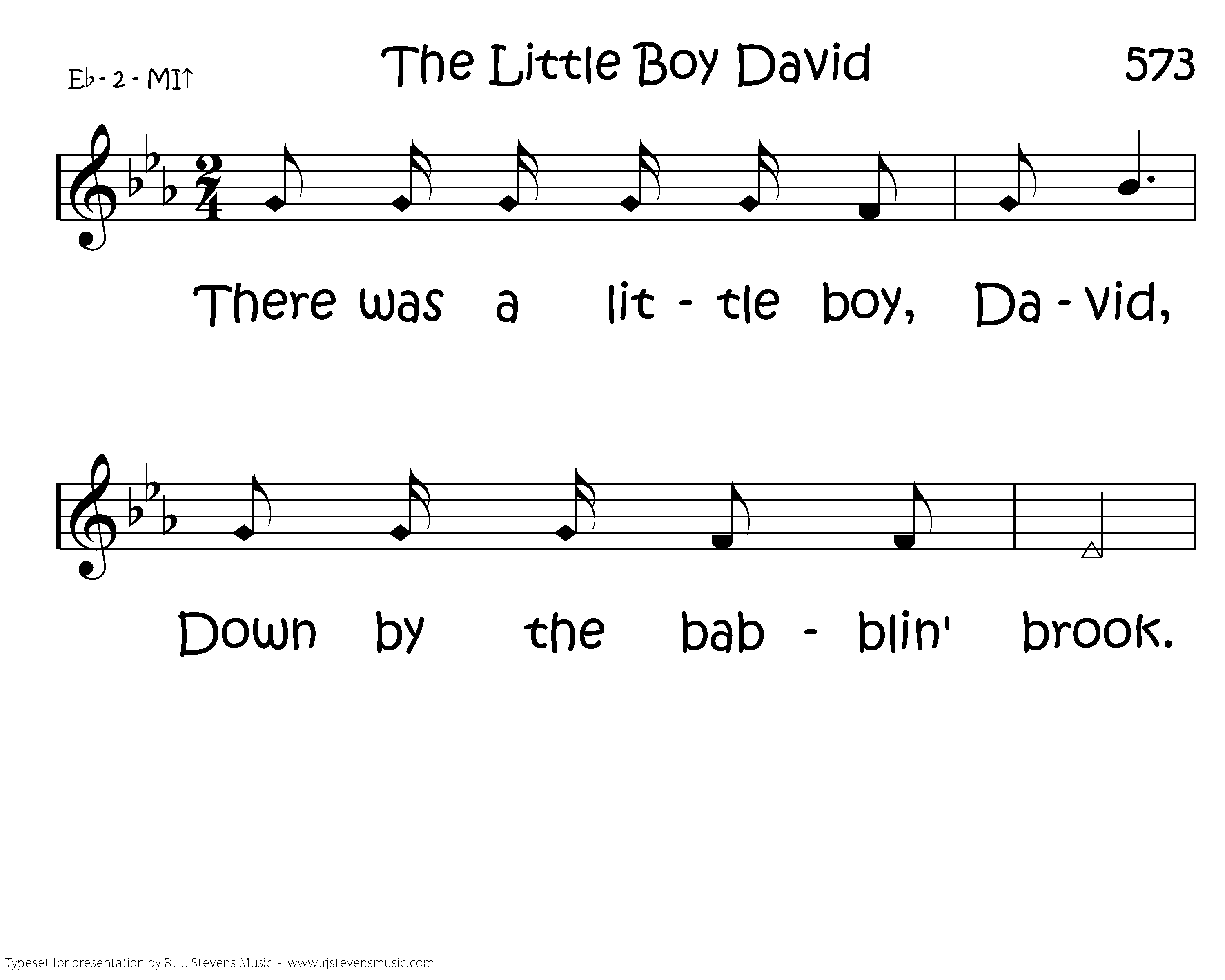 There was a little boy, David, Down by the babblin' brook. There was s little boy, David, Five little stones he took. One little stone went in the sling; The sling went 'round and 'round. One little stone went in the sling; The sling went 'round and 'round, 'round and around and around and around, 'round and around and around. One little stone went up in the air and the Giant came tumbling down. BOOM!