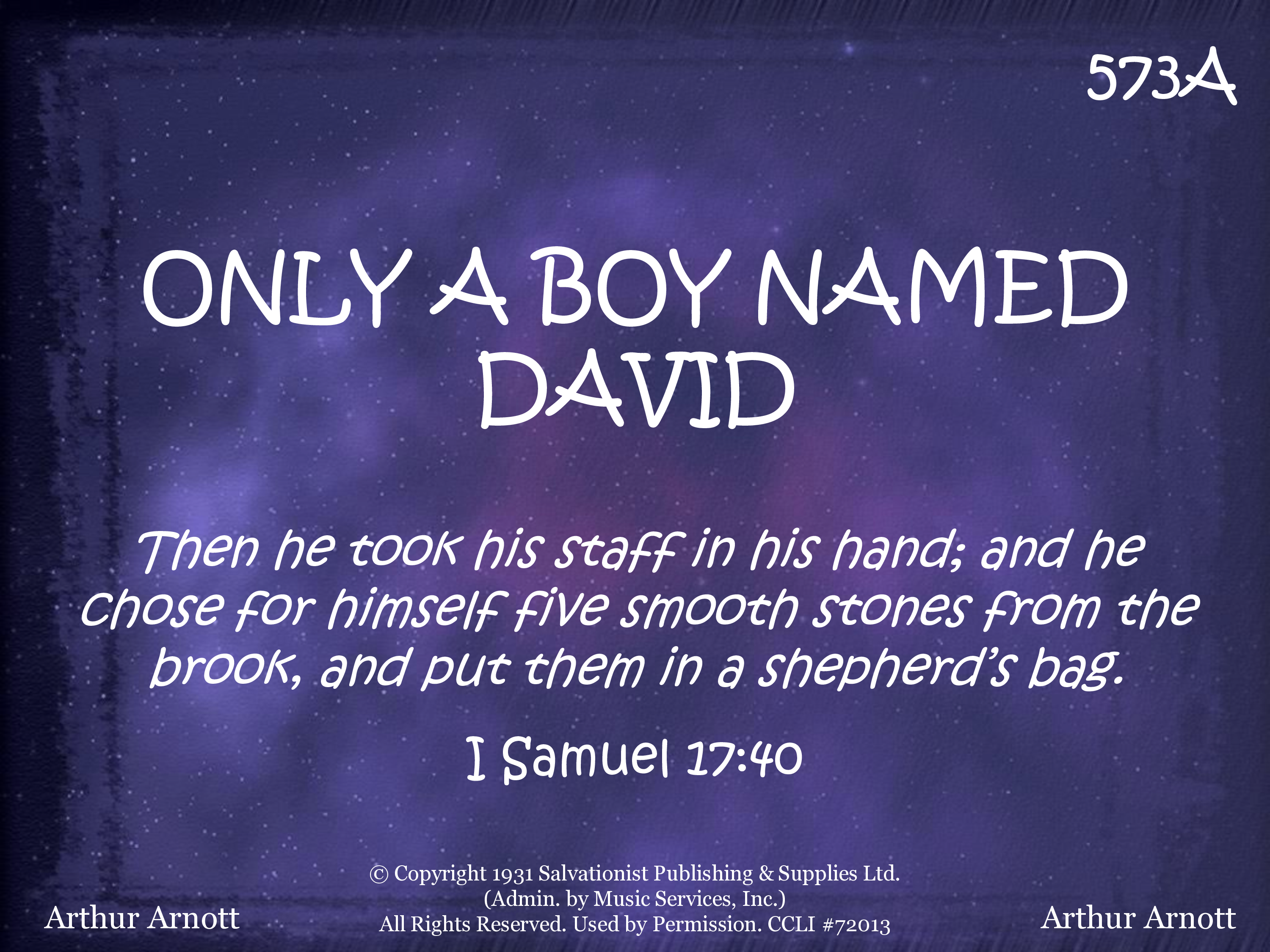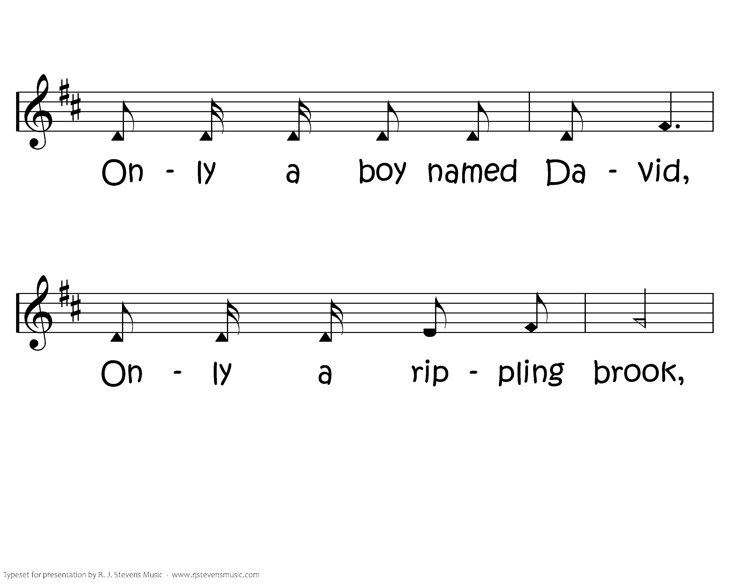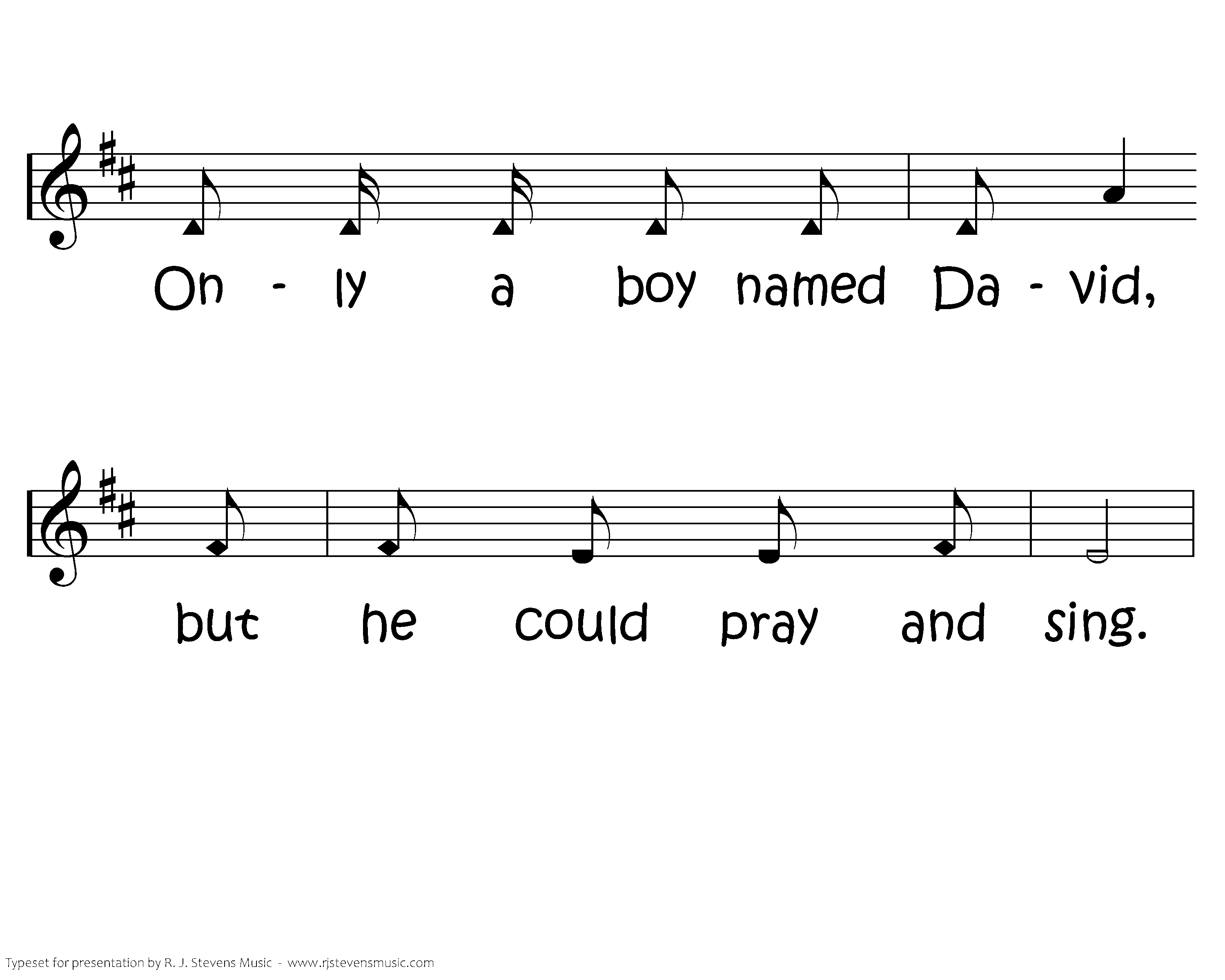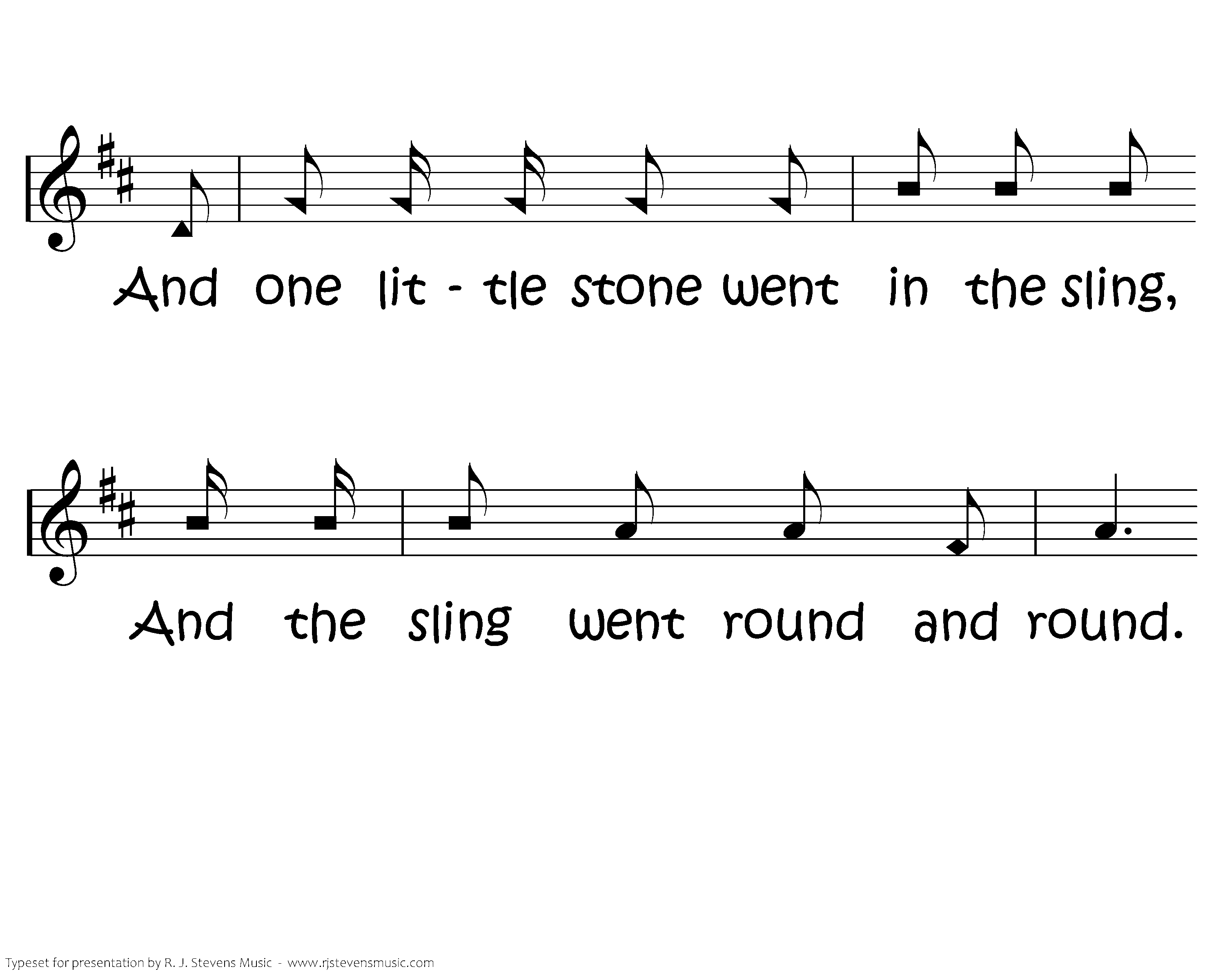 Only a boy named David, Only a little sling, Only a boy named David, but he could pray and sing. Only a boy named David, Only a rippling brook, Only a boy named David but five little stones he took. And one little sone went in the sling, And the sling went round and round. And one little stone went in the sling, And the sling went round and round; And round and round and round and round, And round and round and round. And one little stone went up in the air, And the giant came tumbling down. BOOM!