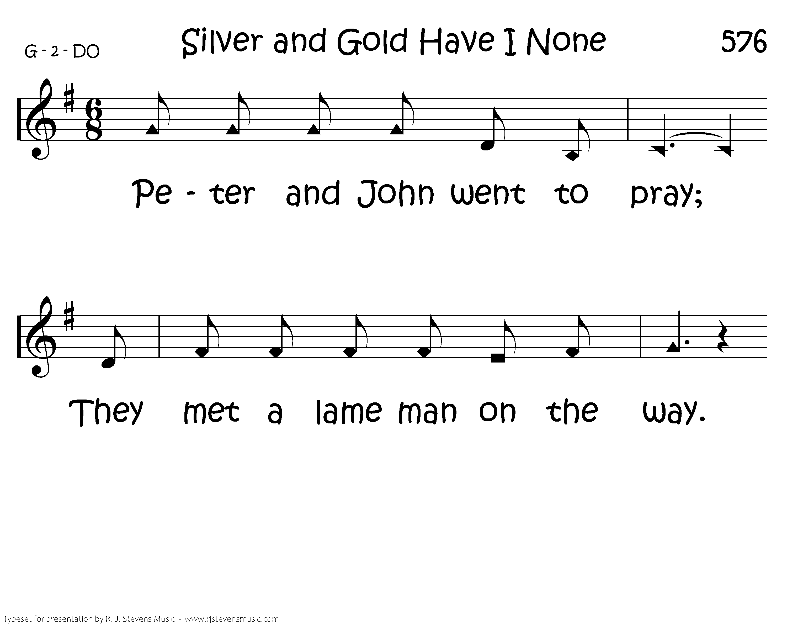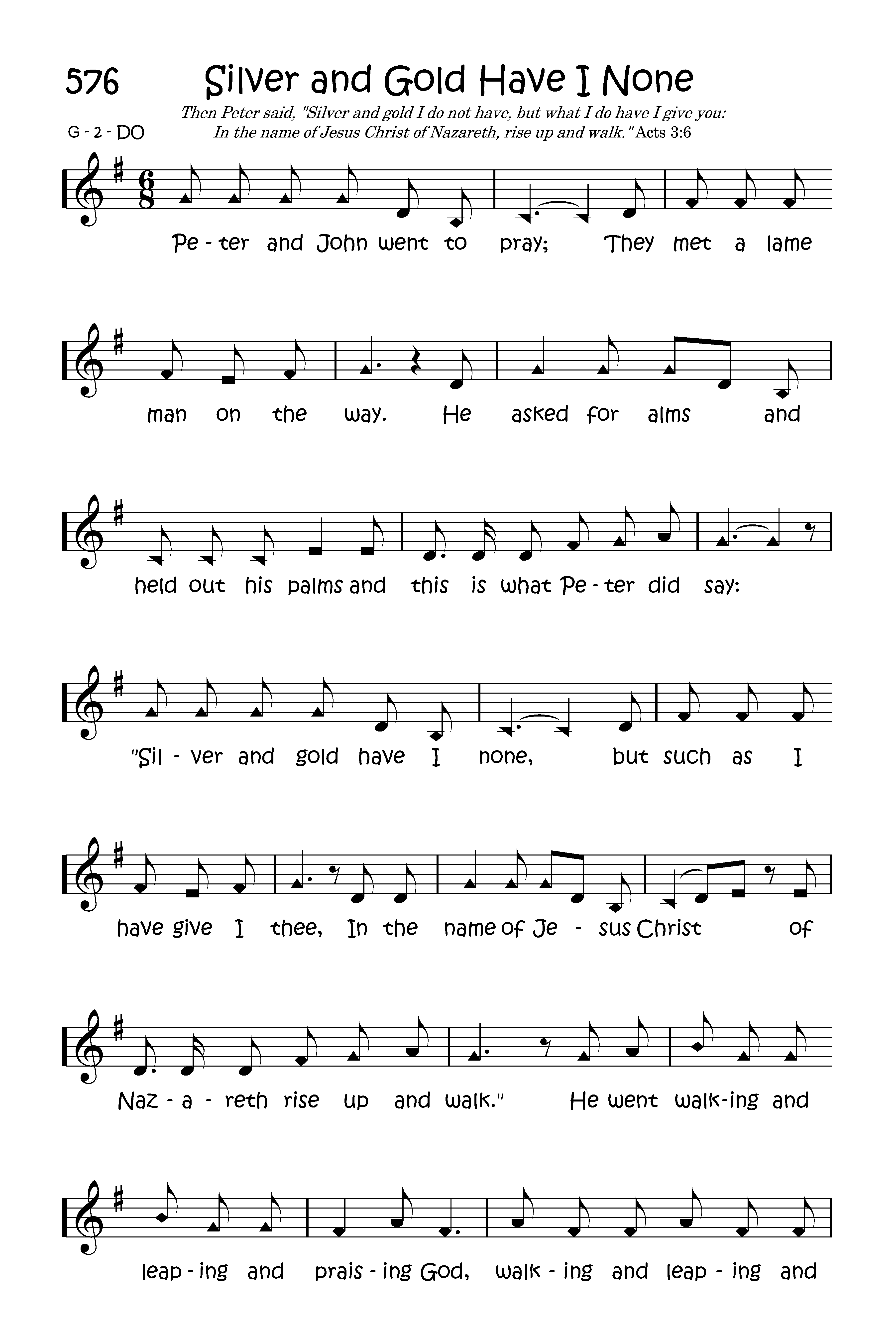 Peter and John went to pray; They met a lame man on the way. He asked for alms and held out his palms and this is what Peter did say: "Silver and gold have I none, but such as I have give I thee, In the name of Jesus Christ of Nazareth rise up and walk." He went walking and leaping and praising God, walking and leaping and praising God. "In the name of Jesus Christ of Nazareth rise up and walk.