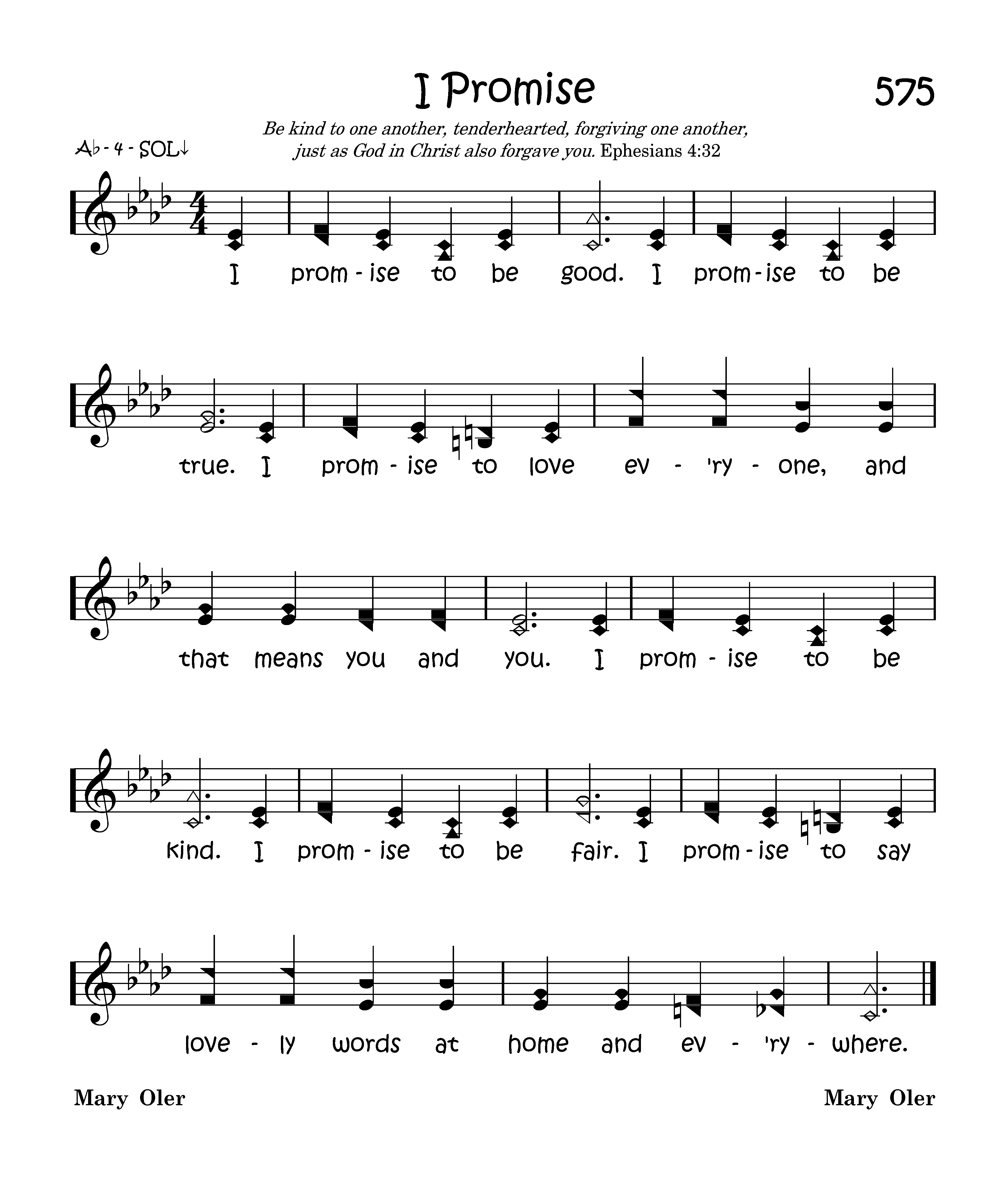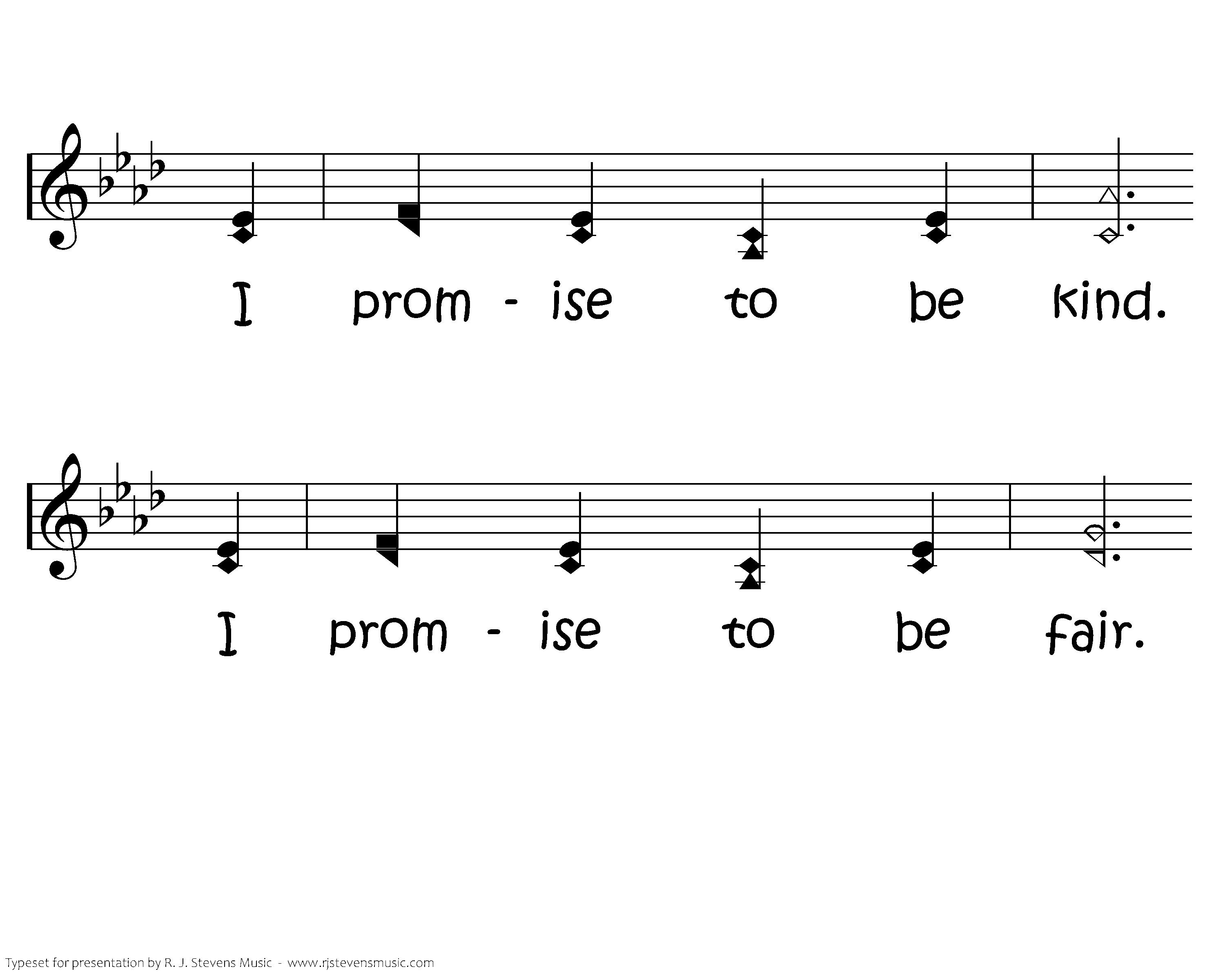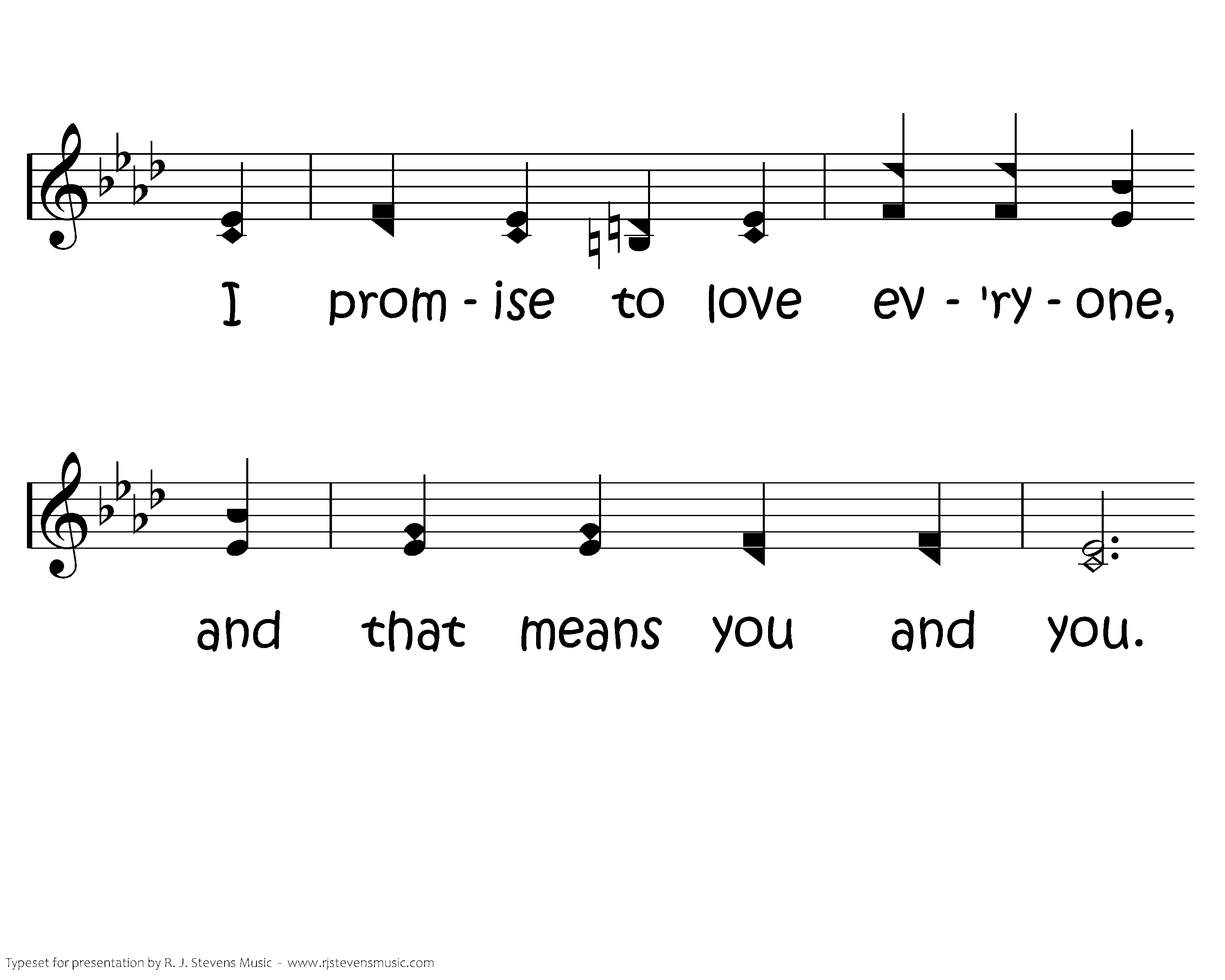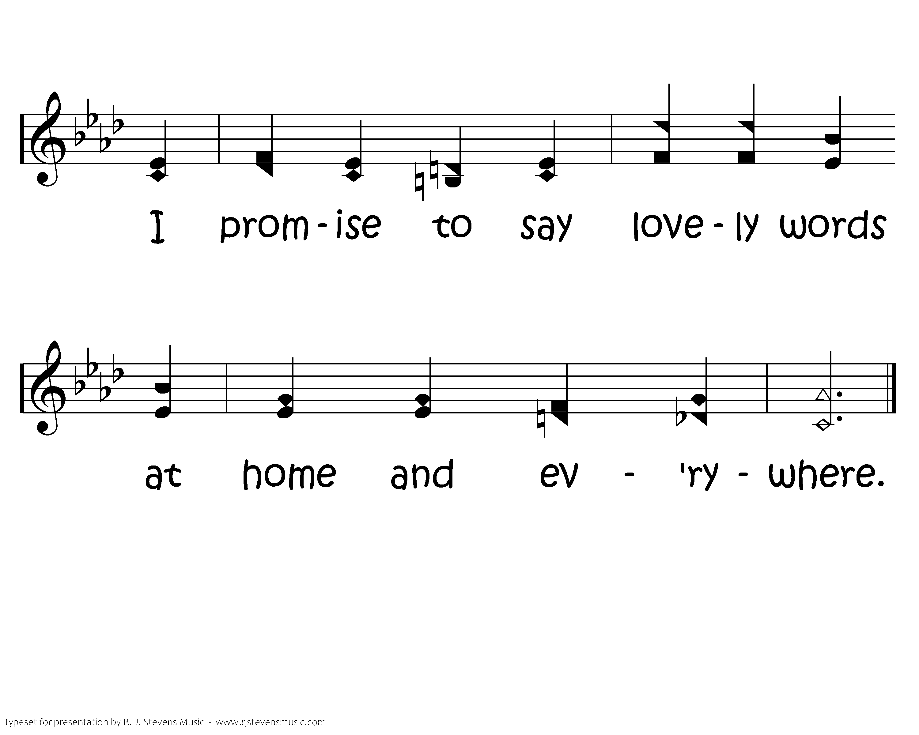 I promise to be good. I promise to be true. I promise to love ev'ryone, and that means you and you. I promise to be kind. I promise to be fair. I promise to say lovely words at home and ev'rywhere.