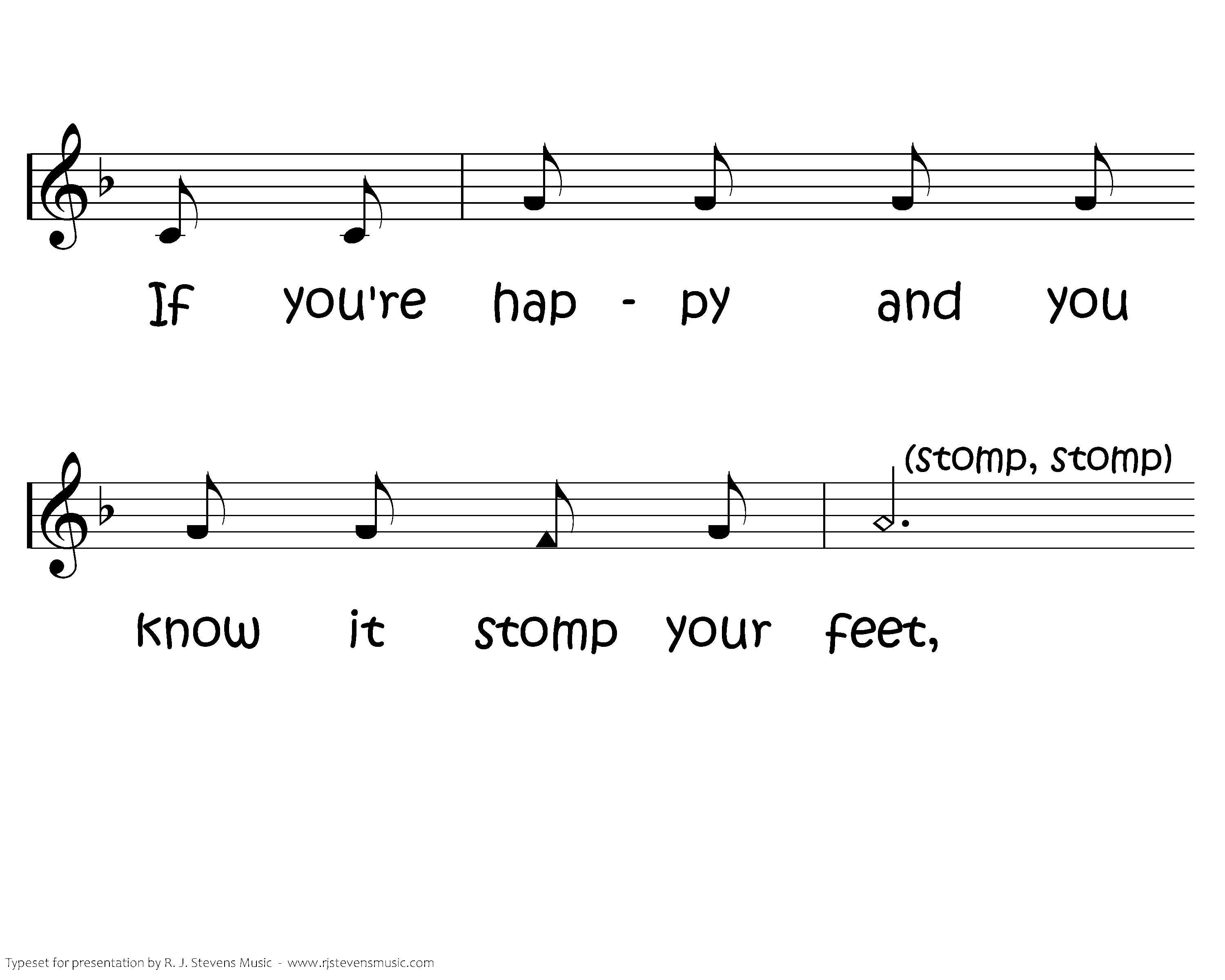 If you're happy and you know it stomp your feet, If you're happy and you know it stomp your feet, If you're happy and you know it then your life will surely show it, If you're happy and you know it stomp your feet.