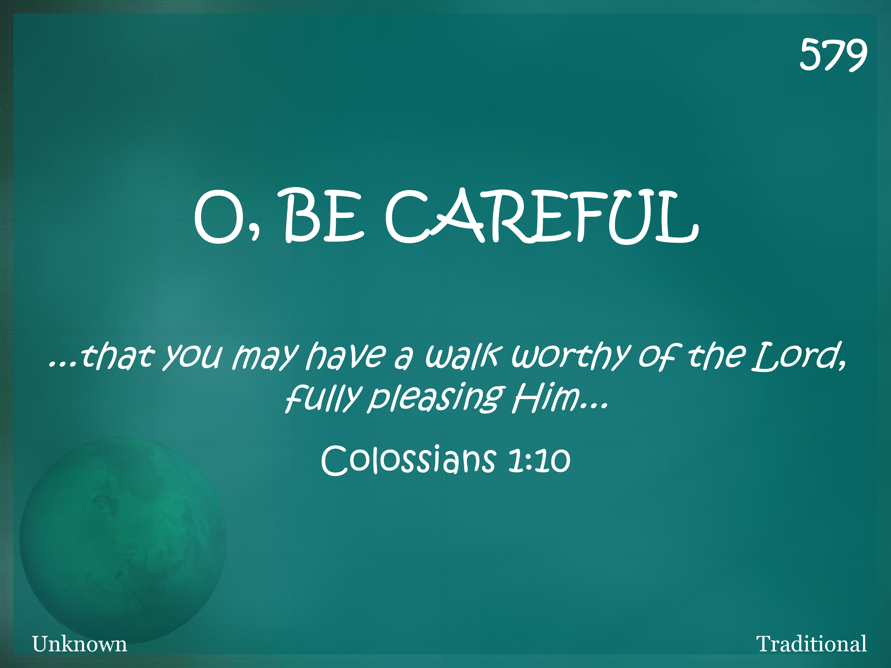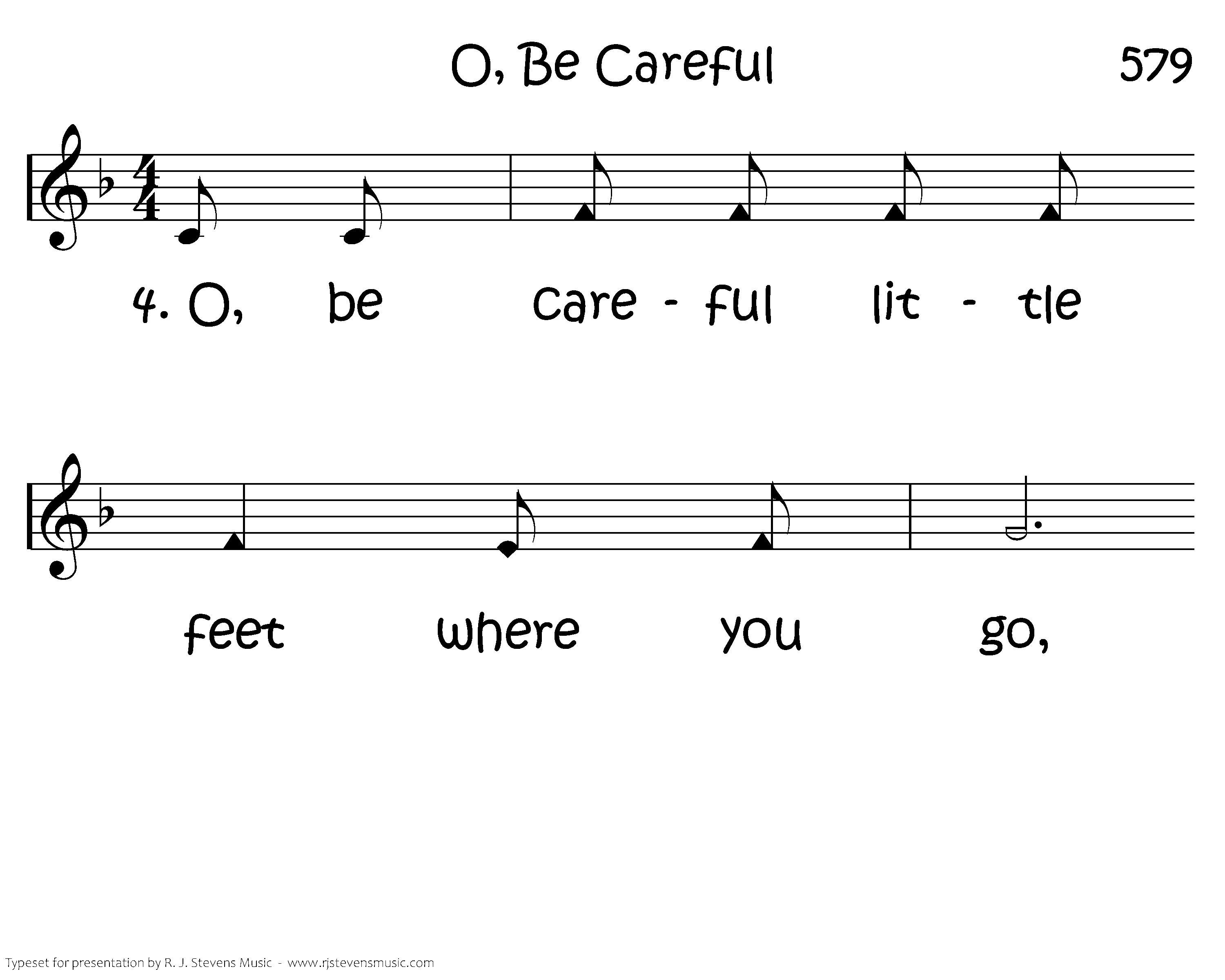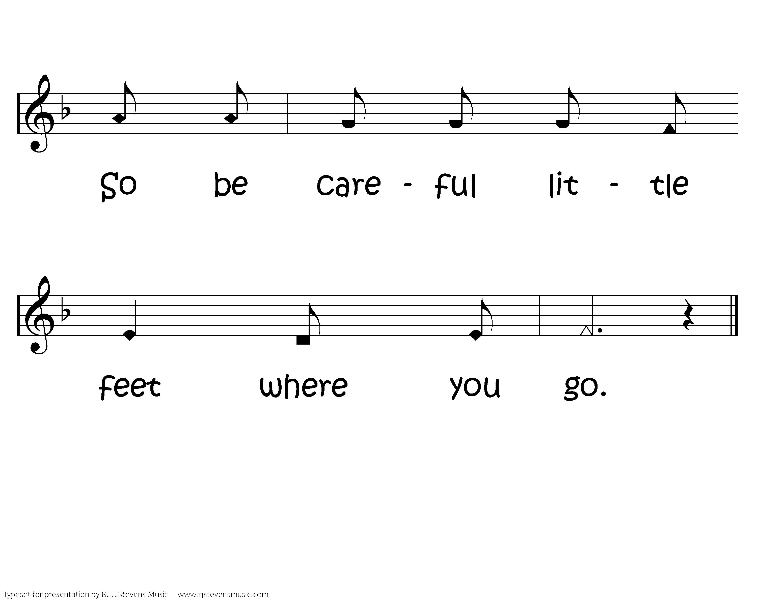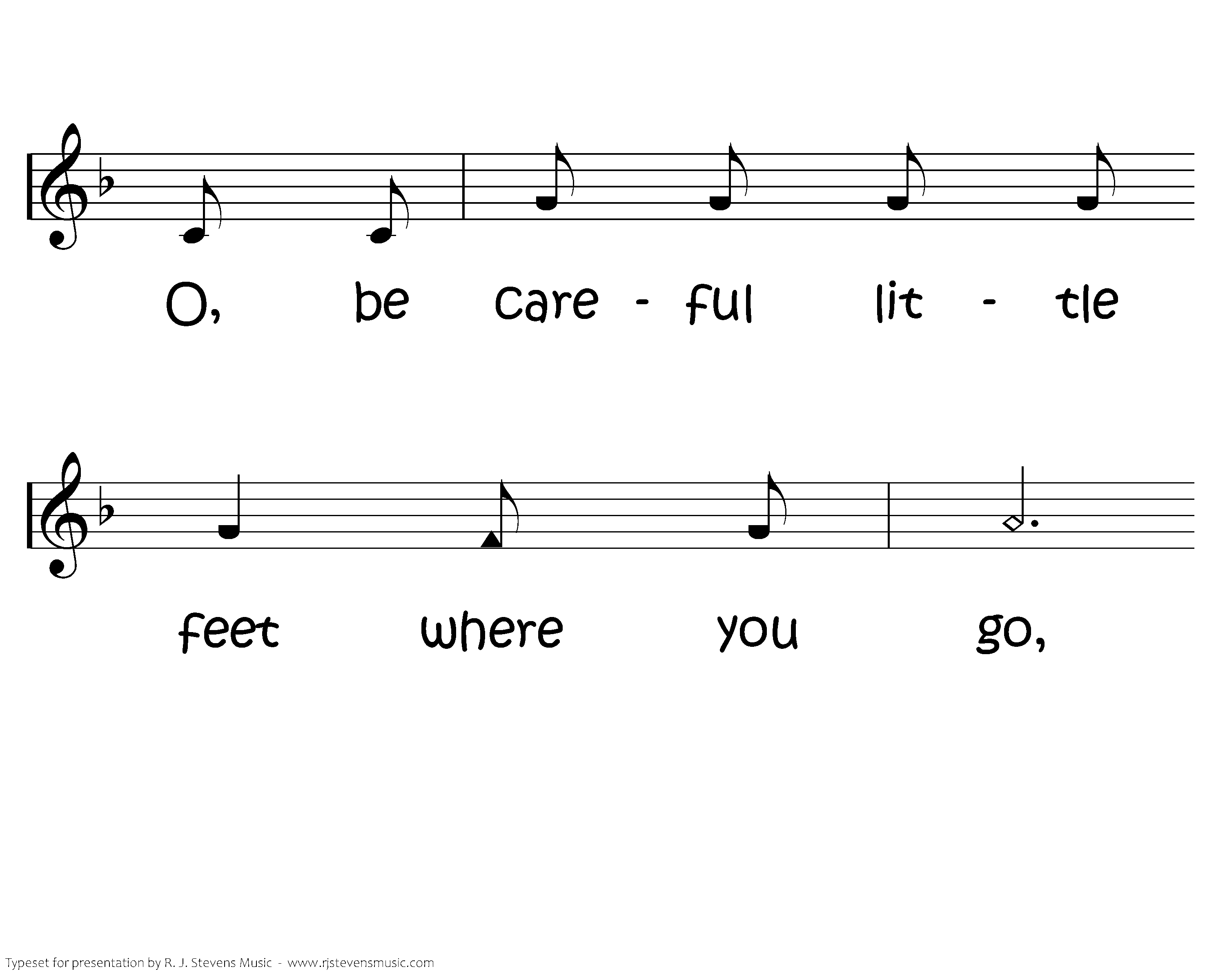 O, be careful little feet where you go, O, be careful little feet where you go, For the Father up above is looking down in love, So be careful little feet where you go.