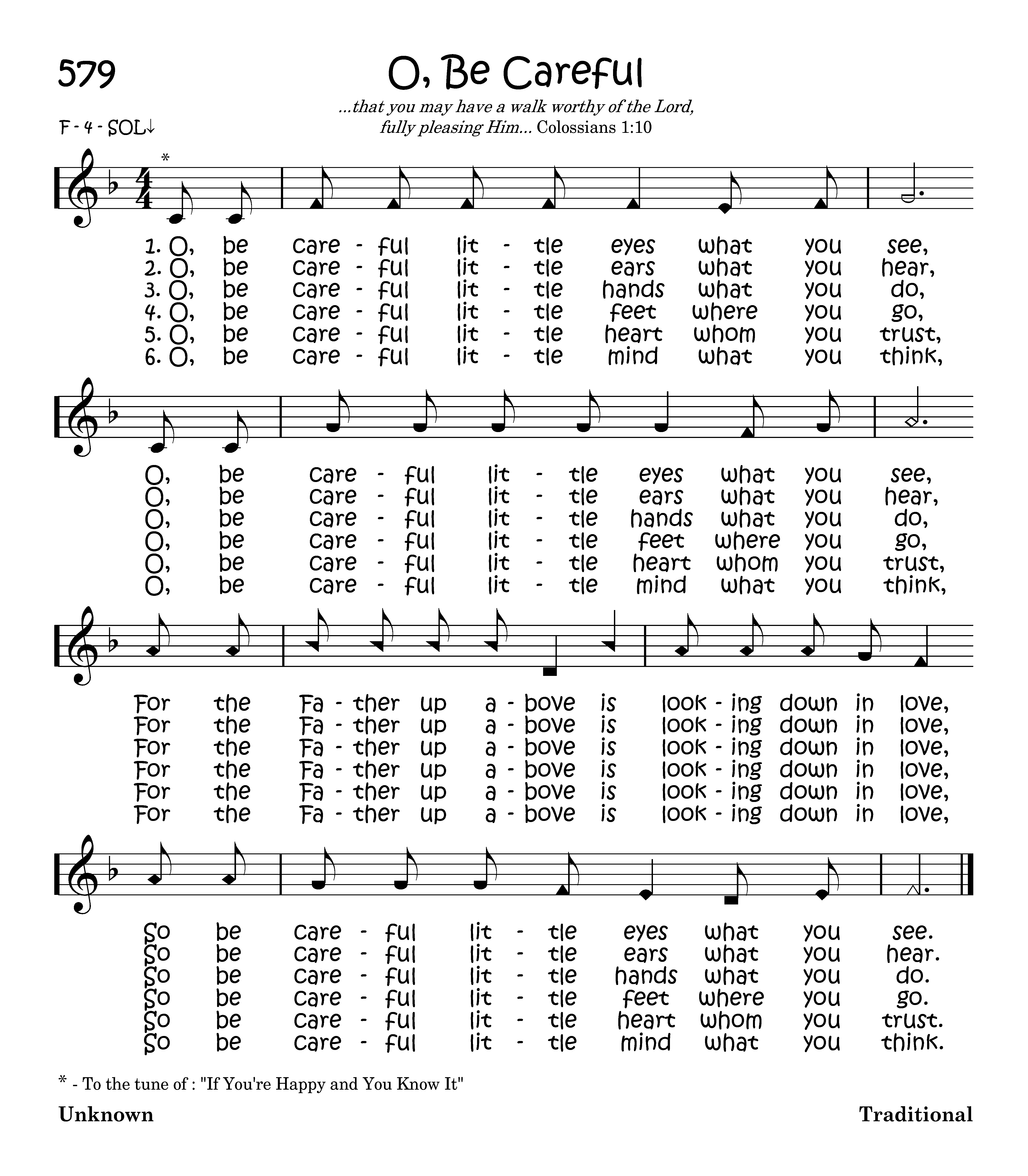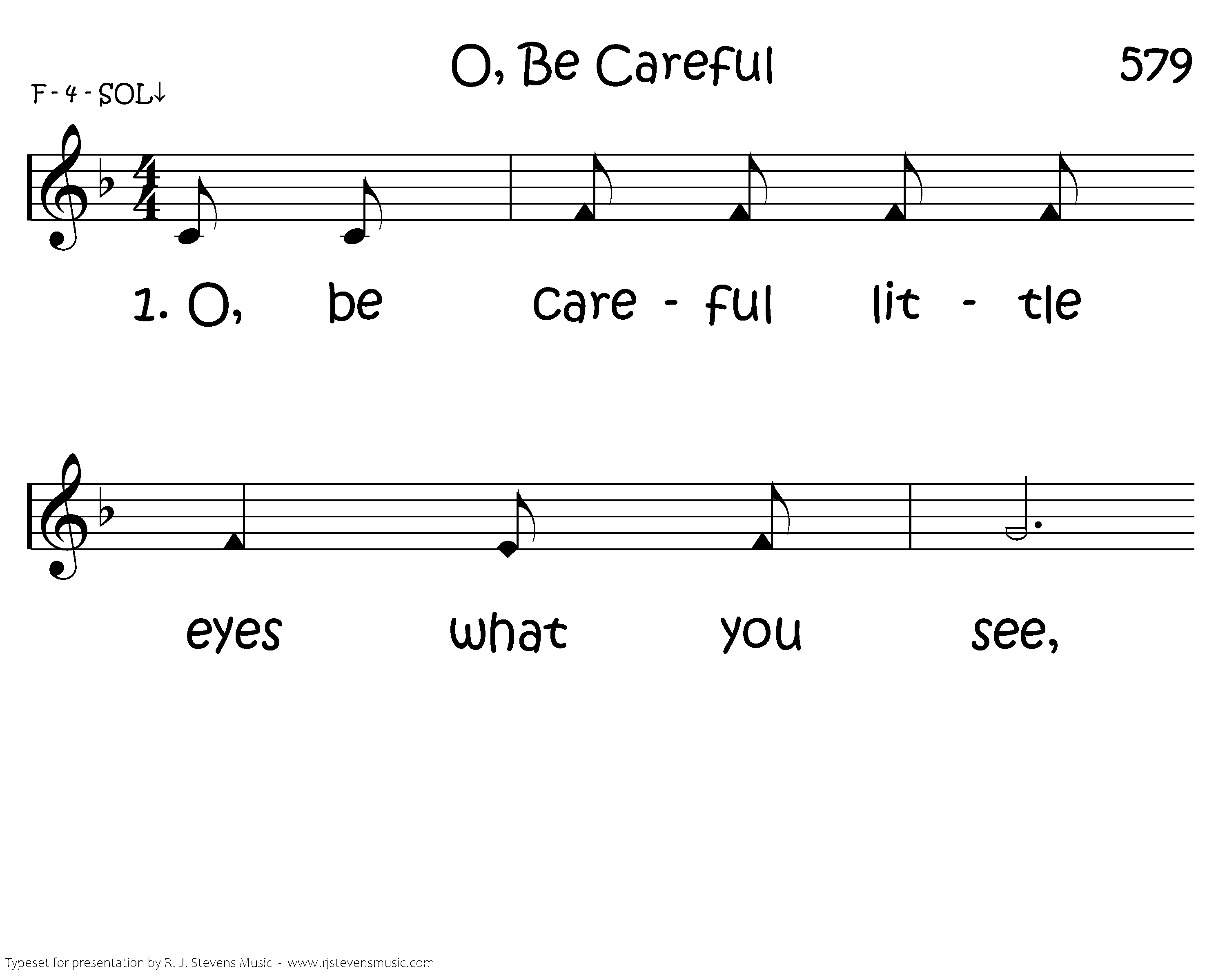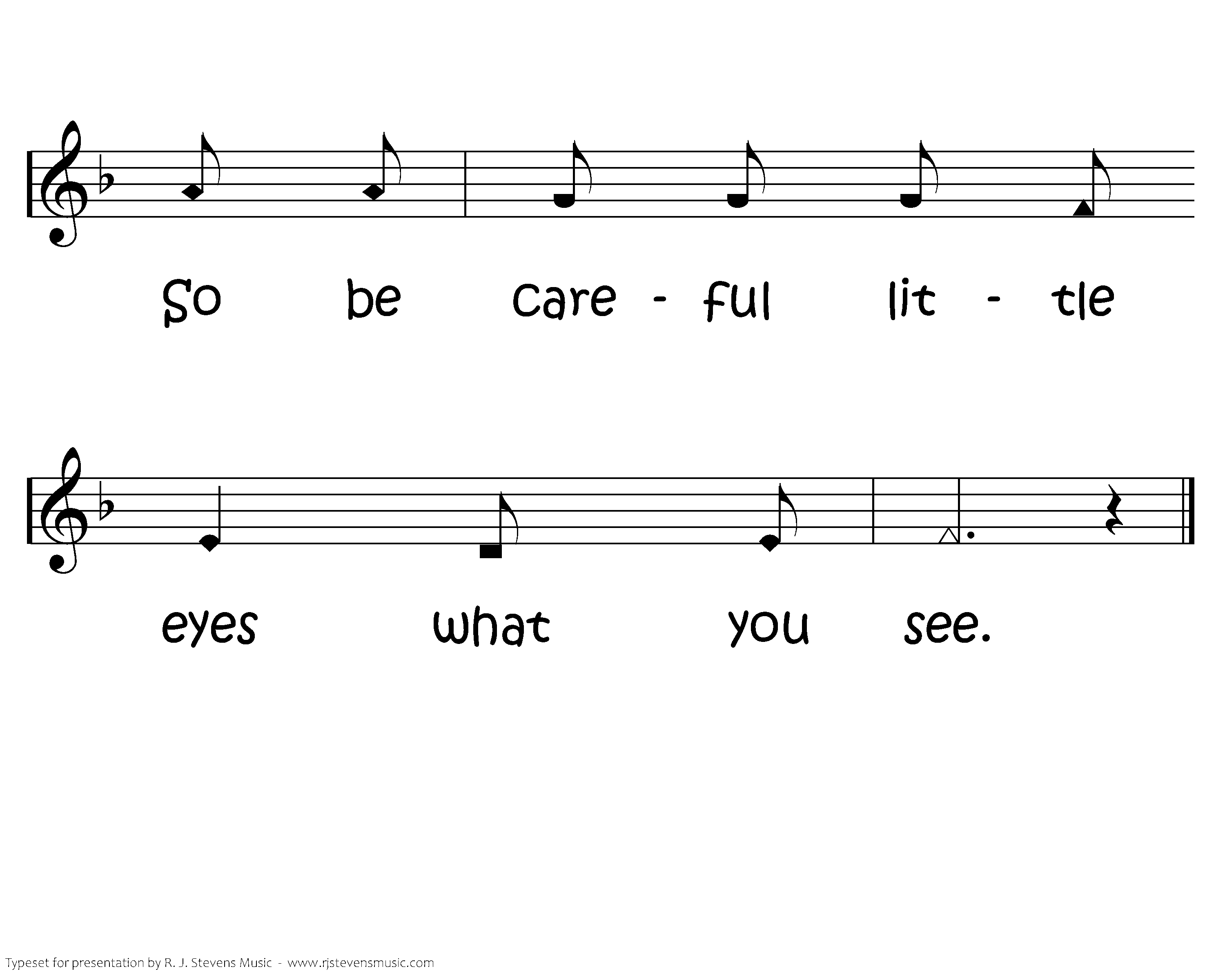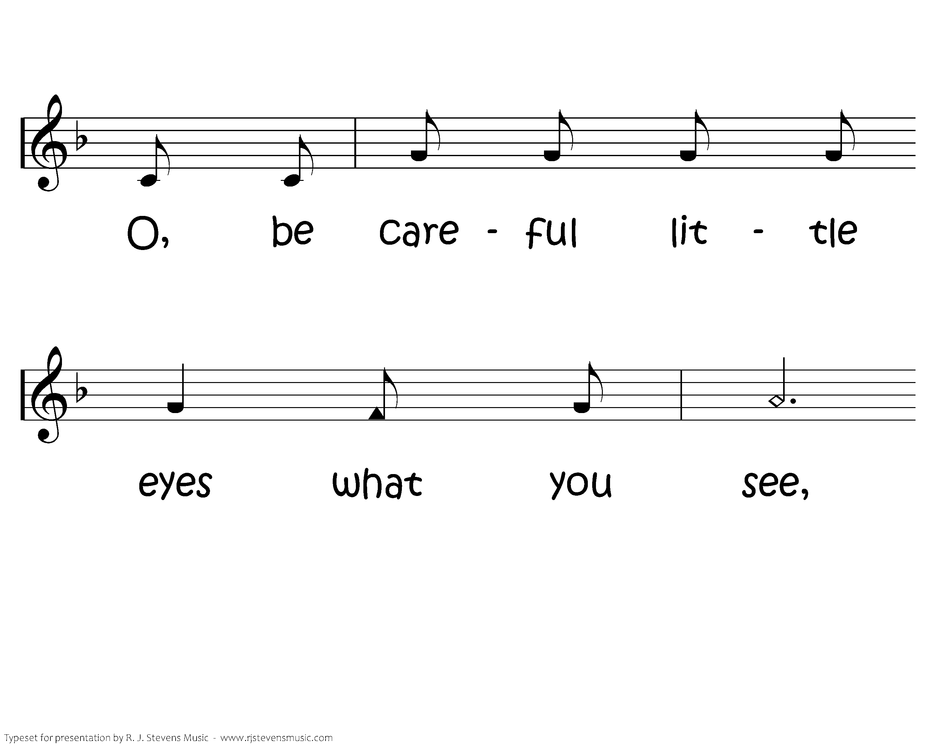 O, be careful little eyes what you see, O, be careful little eyes what you see, For the Father up above is looking down in love, So be careful little eyes what you see.
