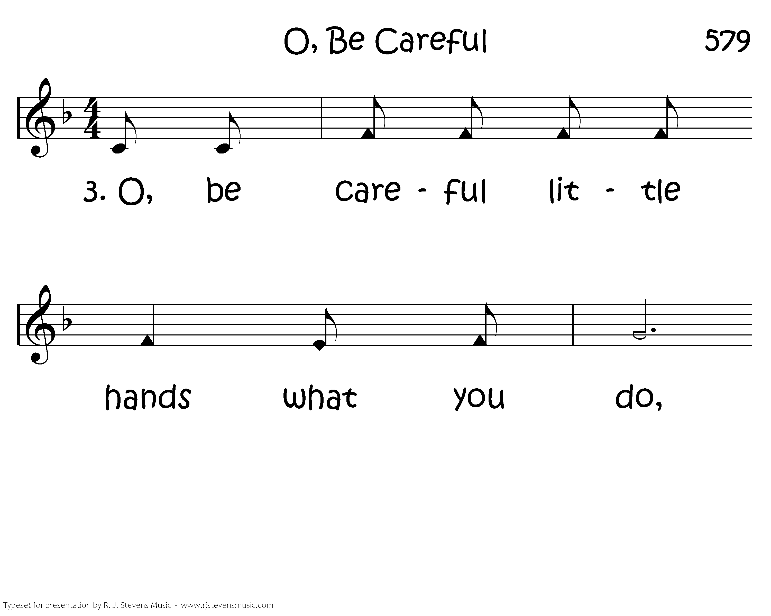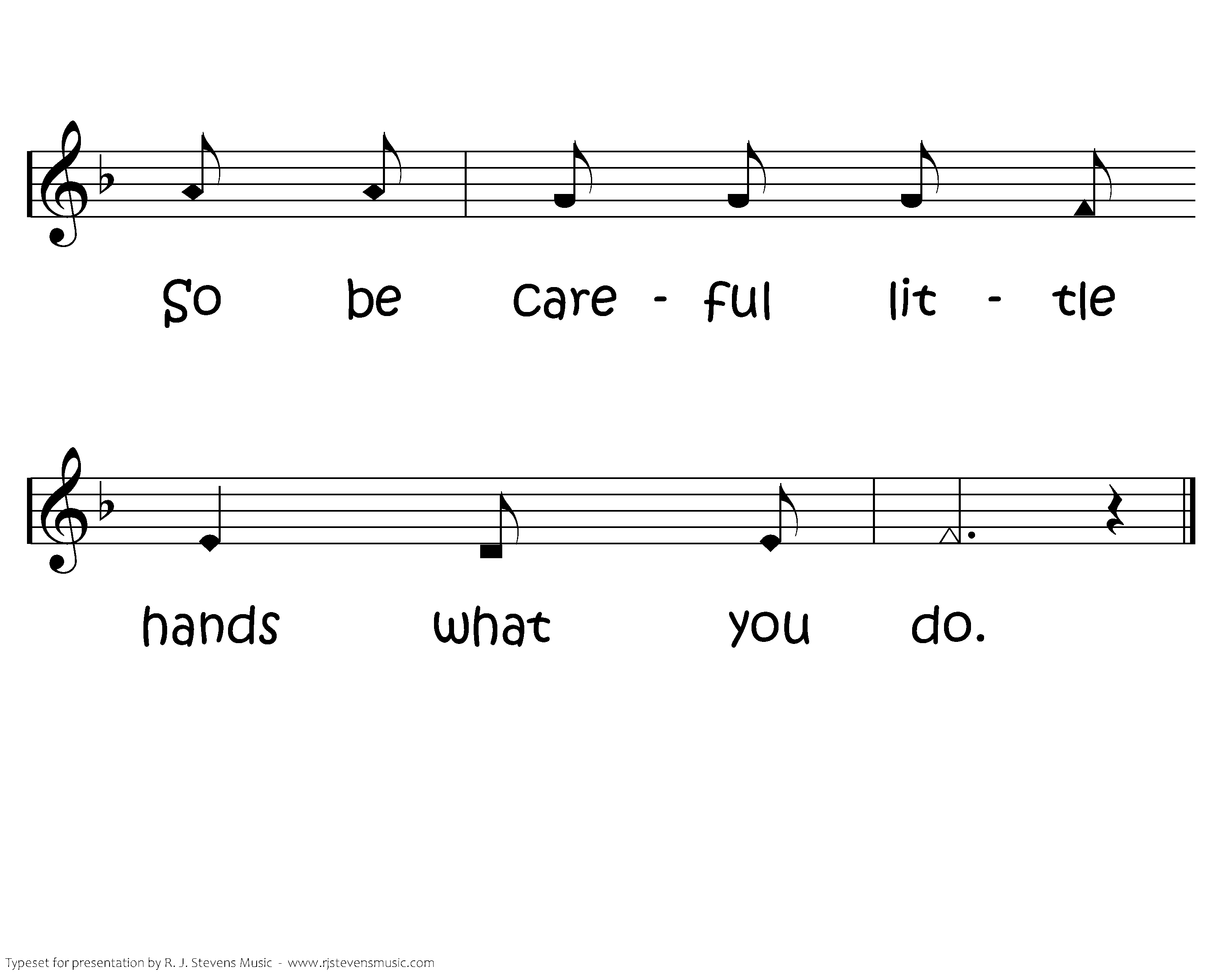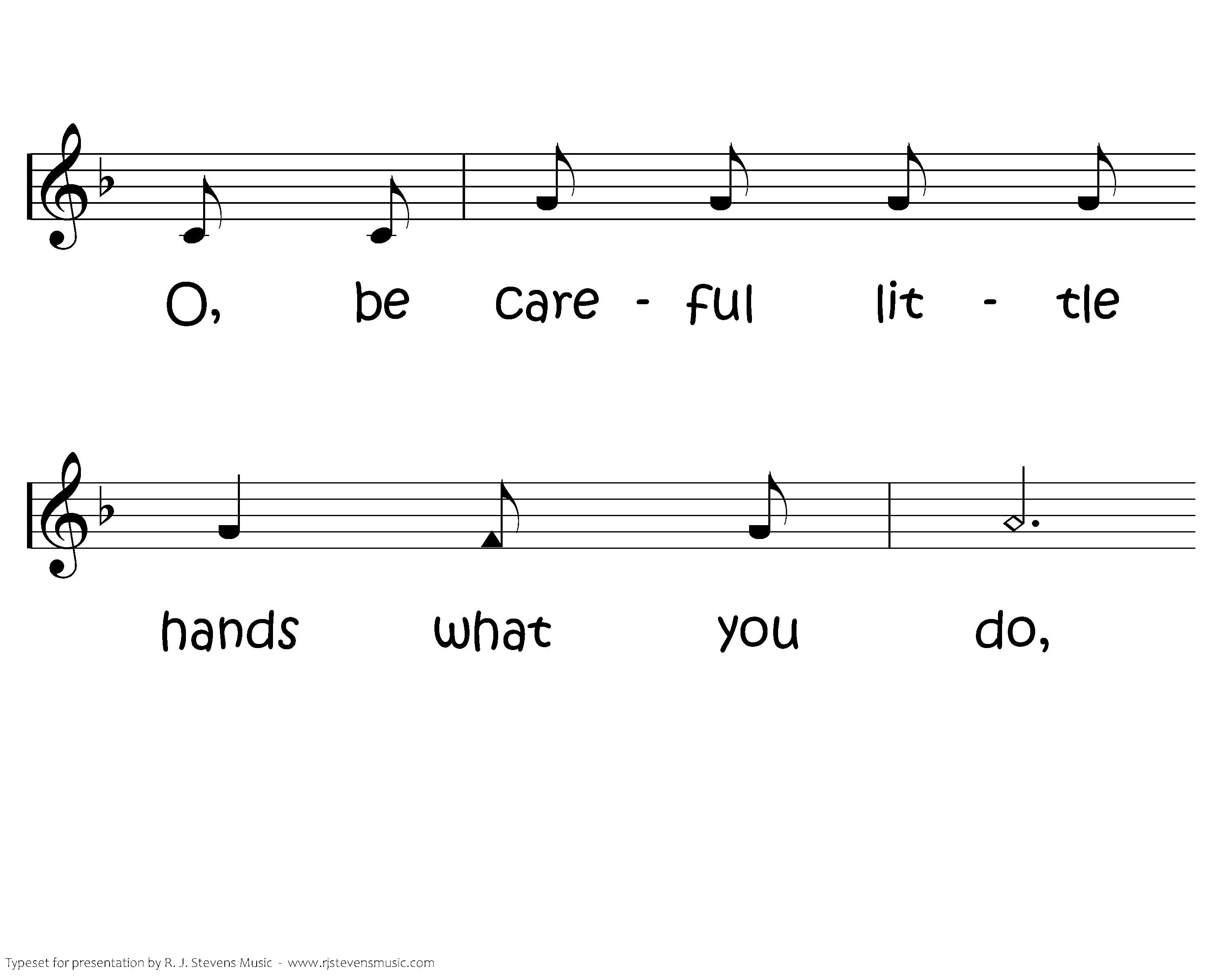 O, be careful little hands what you do, O, be careful little hands what you do, For the Father up above is looking down in love, So be careful little hands what you do.