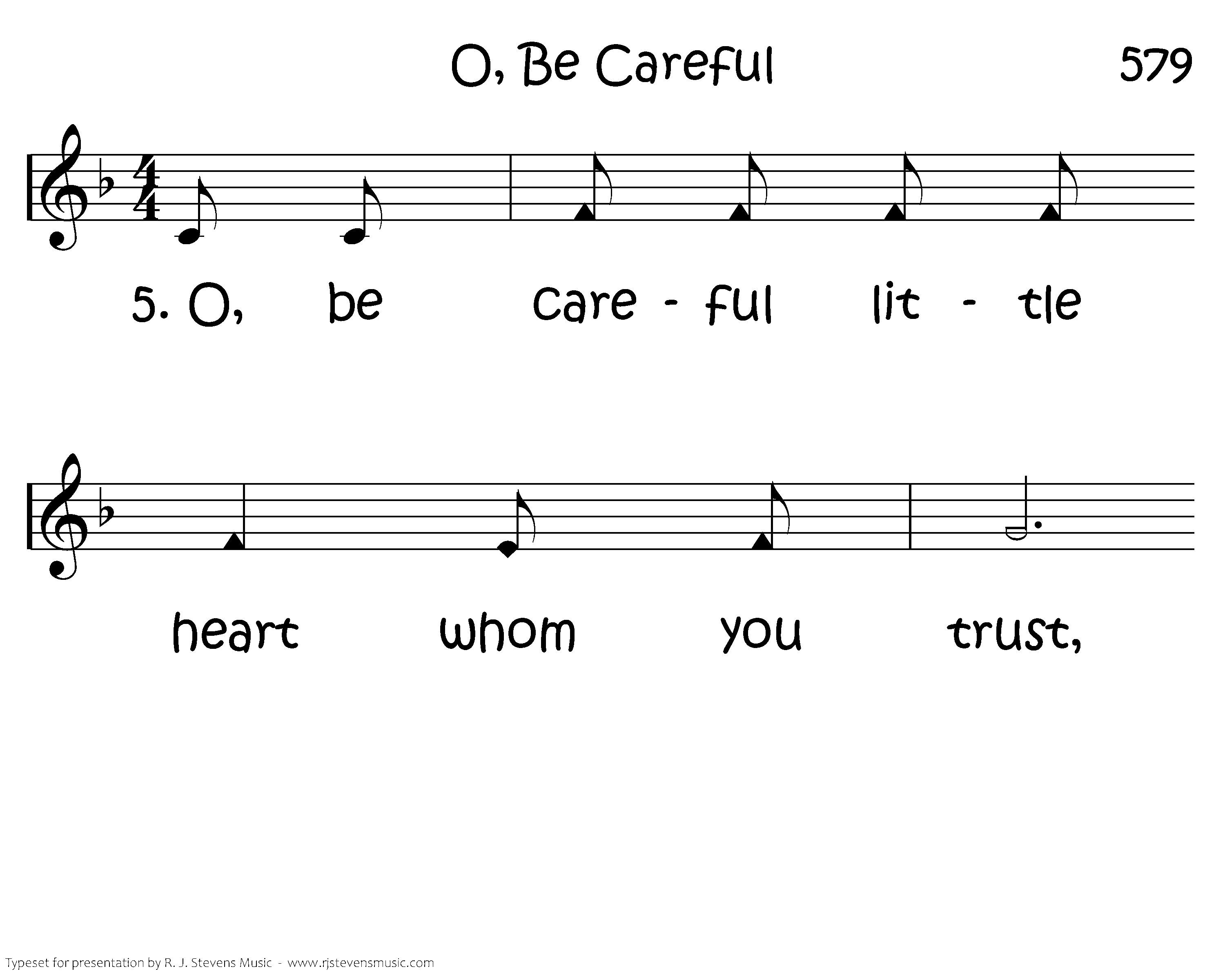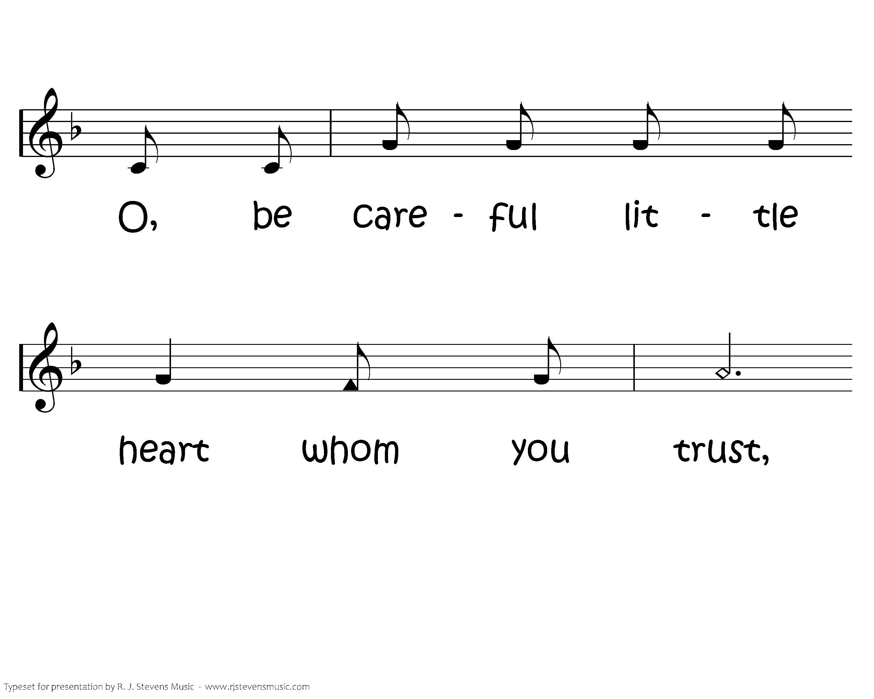 O, be careful little heart whom you trust, O, be careful little heart whom you trust, For the Father up above is looking down in love, So be careful little heart whom you trust.