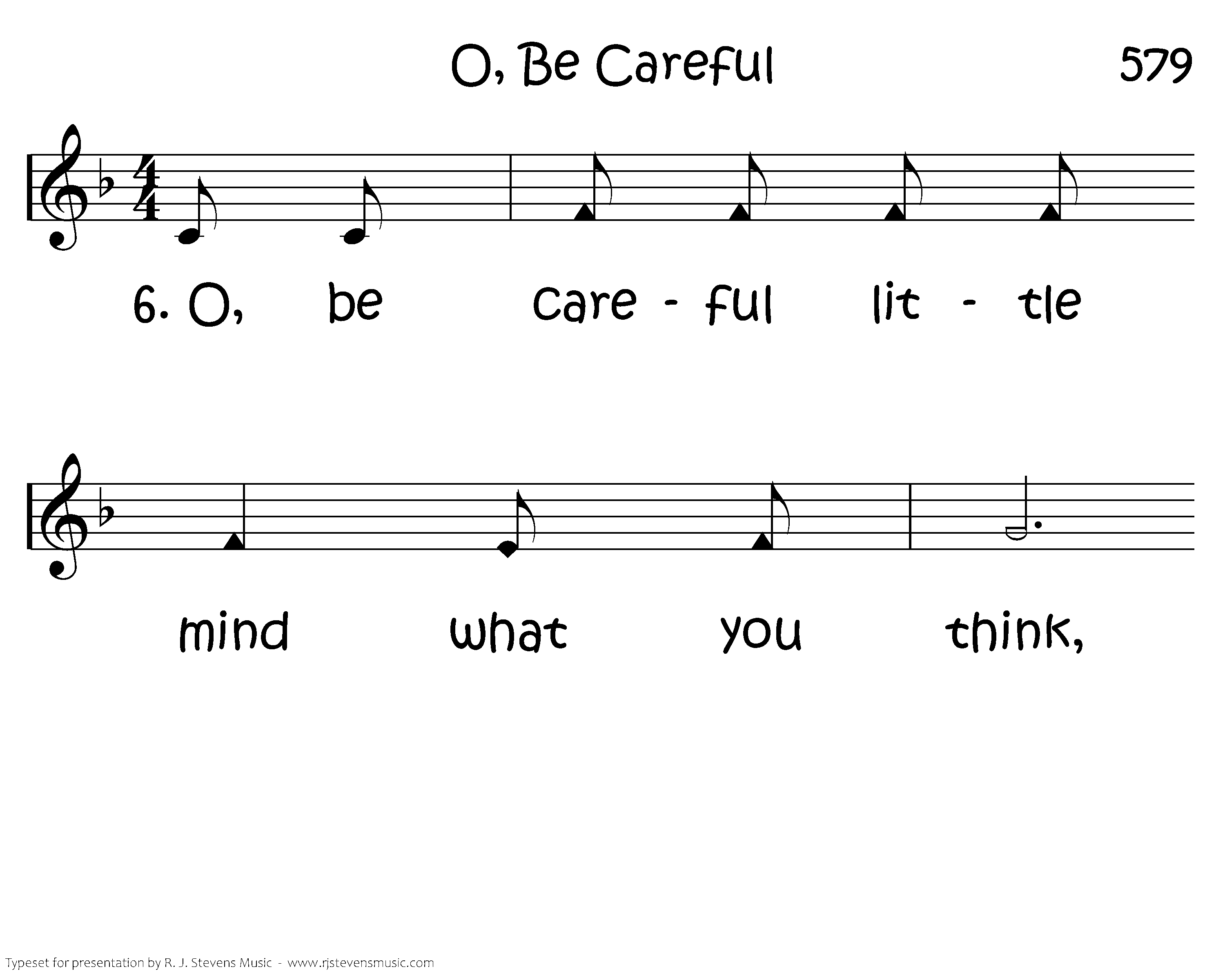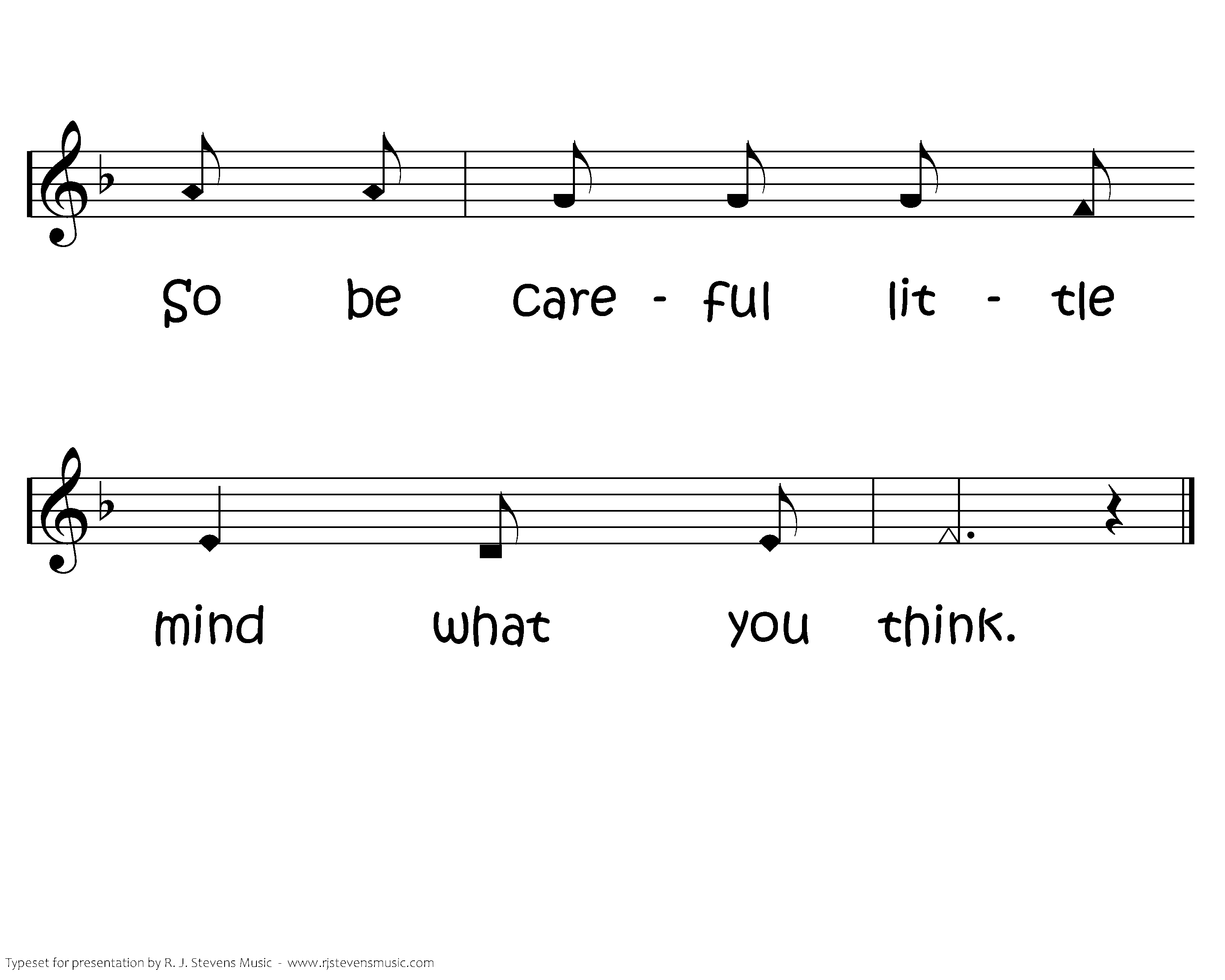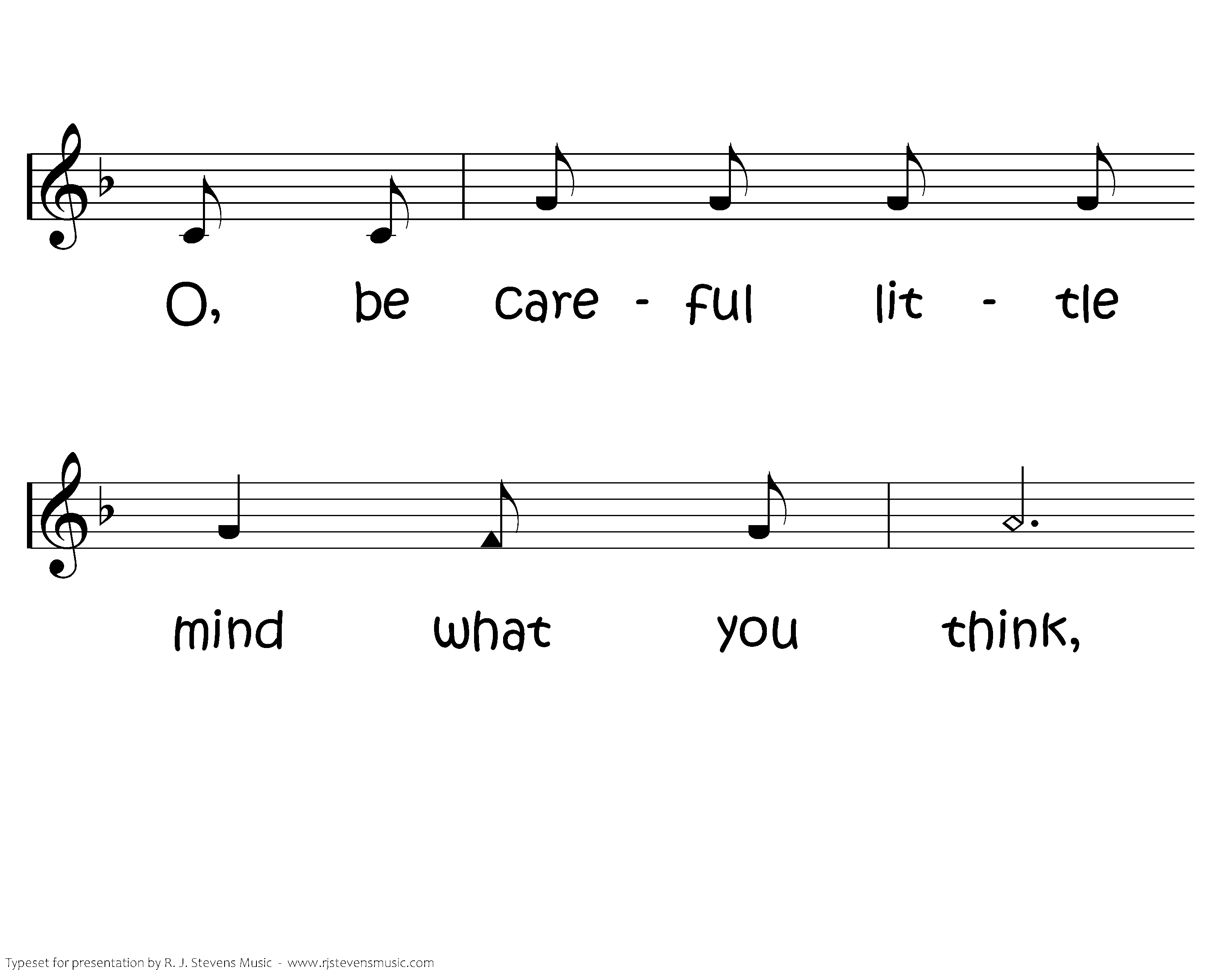 O, be careful little mind what you think, O, be careful little mind what you think, For the Father up above is looking down in love, So be careful little mind what you think.