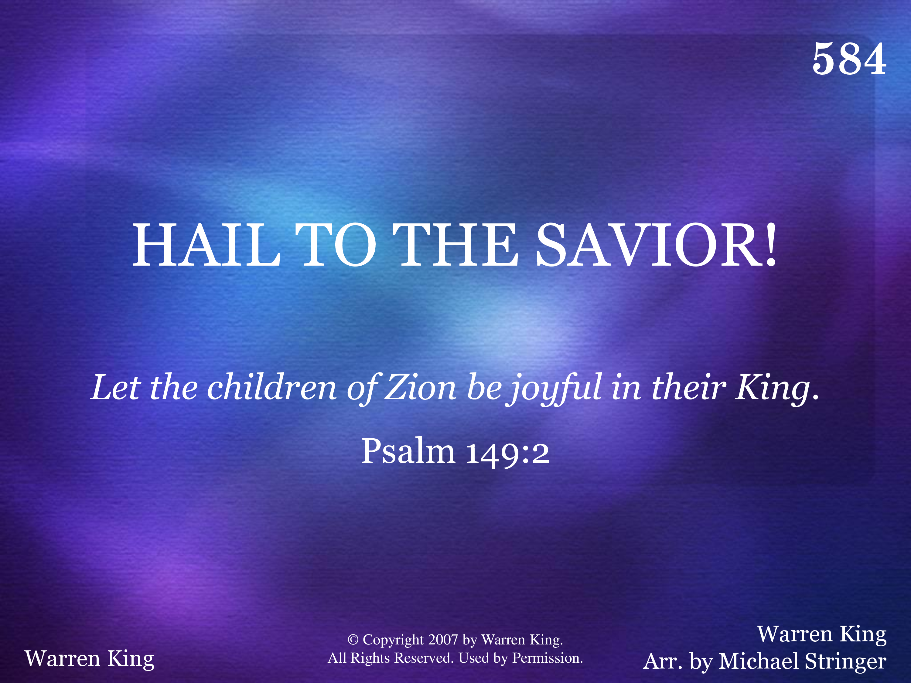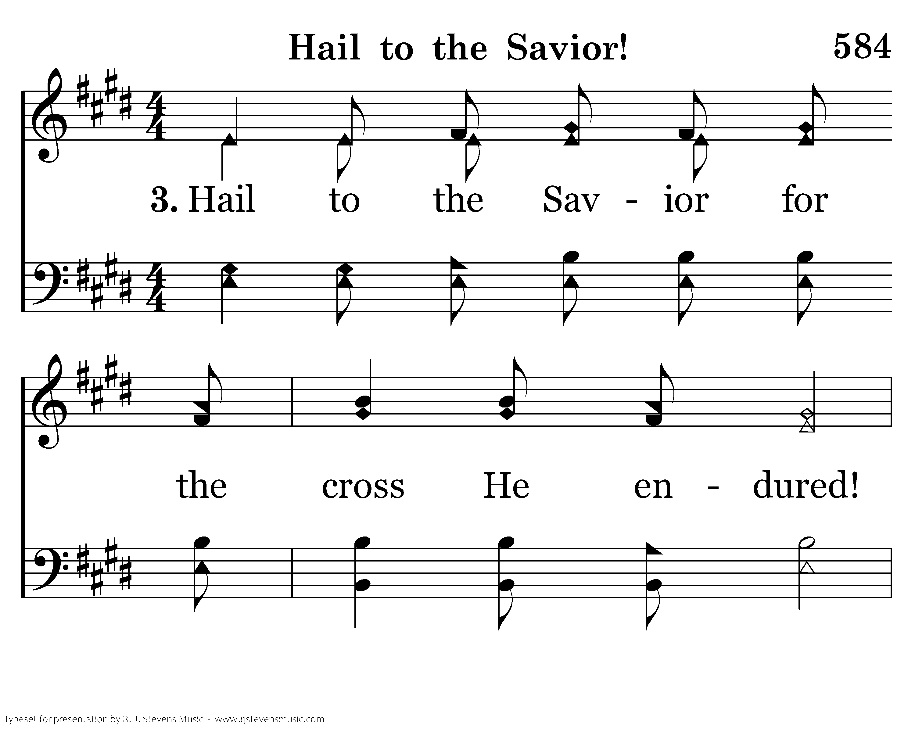 Hail to the Savior for the cross He endured! Praise for His promise and the hope He secured! Long for His coming! Live for that day! Look up to heaven! Lift your voices and say:
