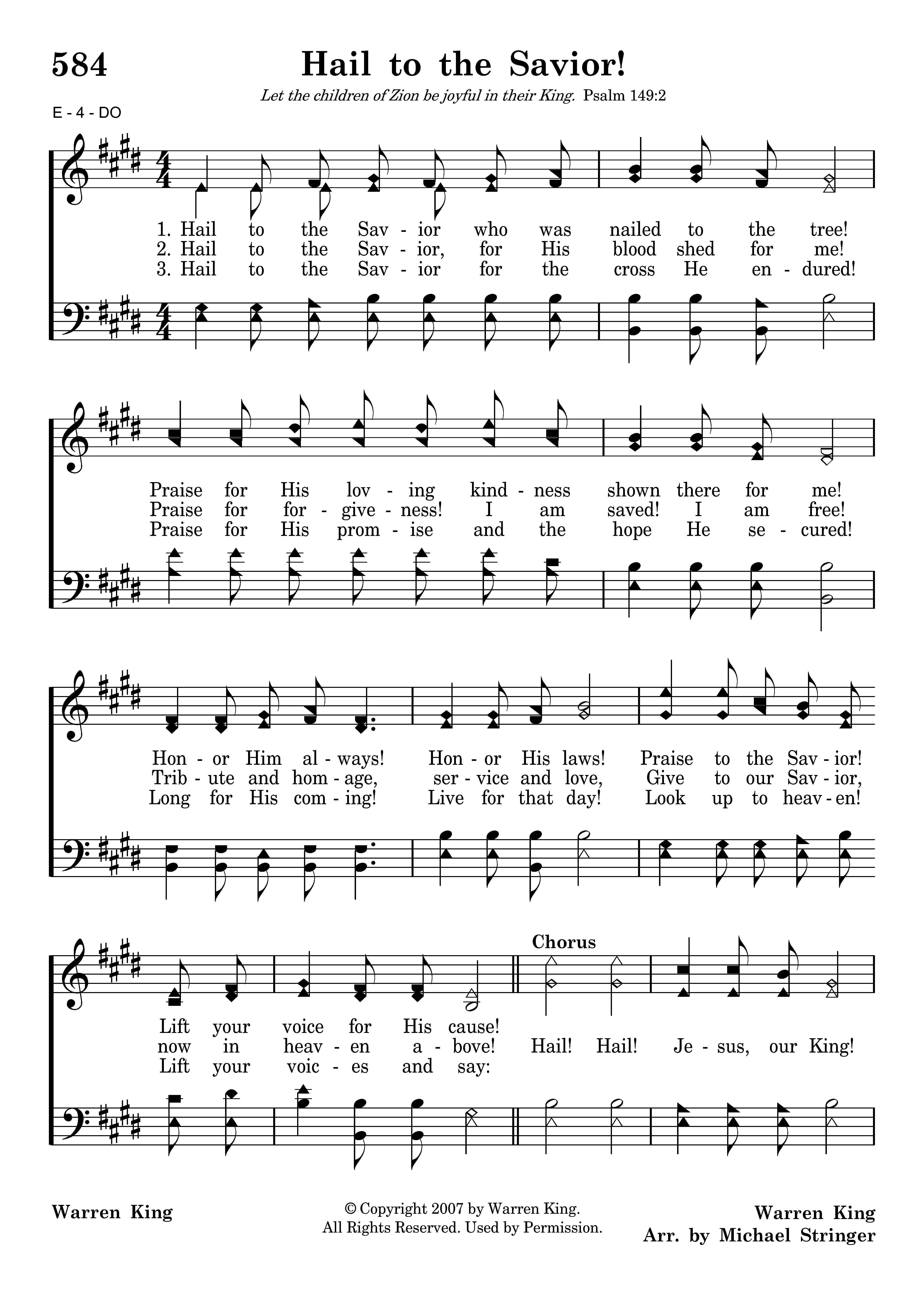 Hail to the Savior who was nailed to the tree! Praise for His loving kindness shown there for me! Honor Him always! Honor His laws! Praise to the Savior! Lift your voice for His cause!