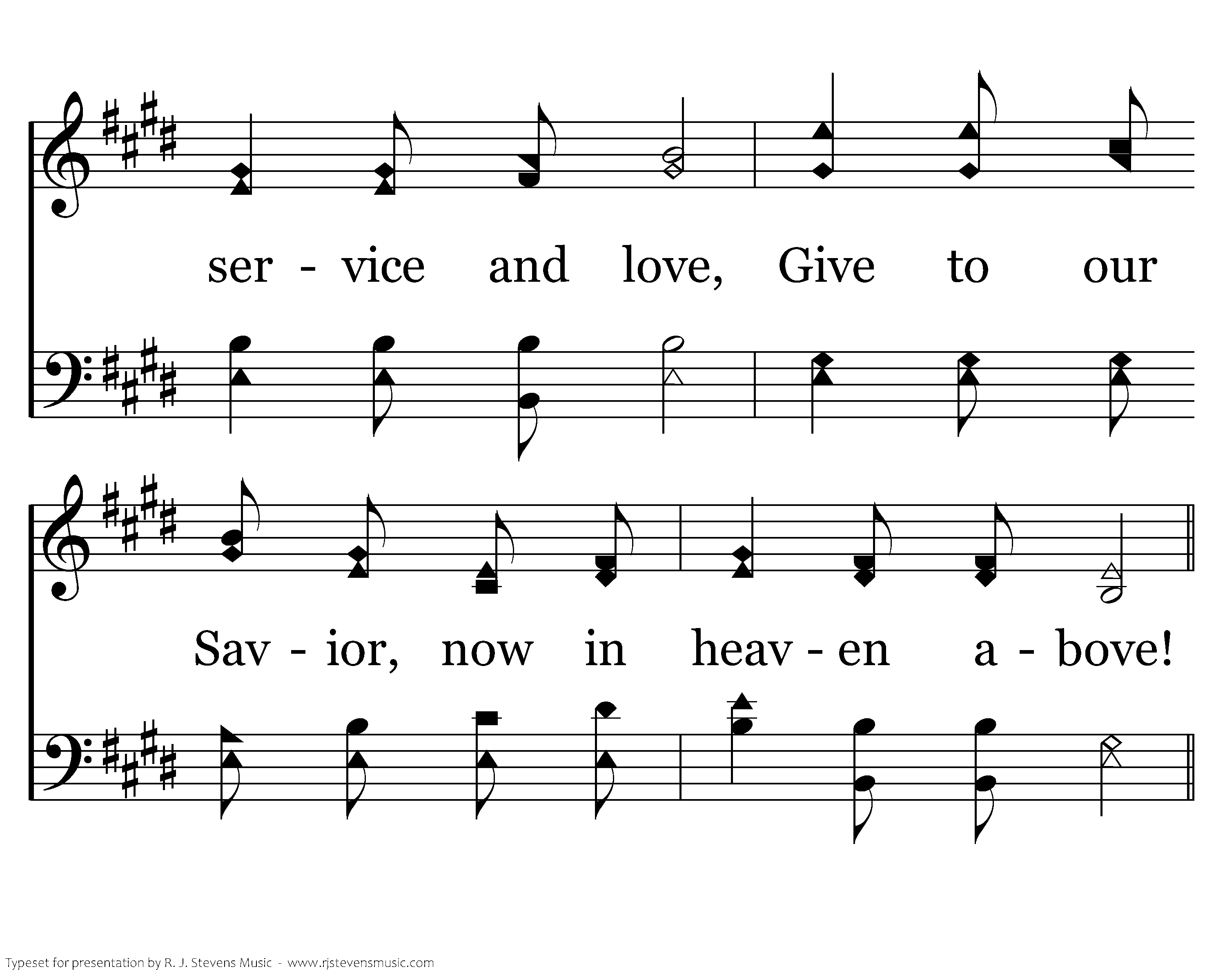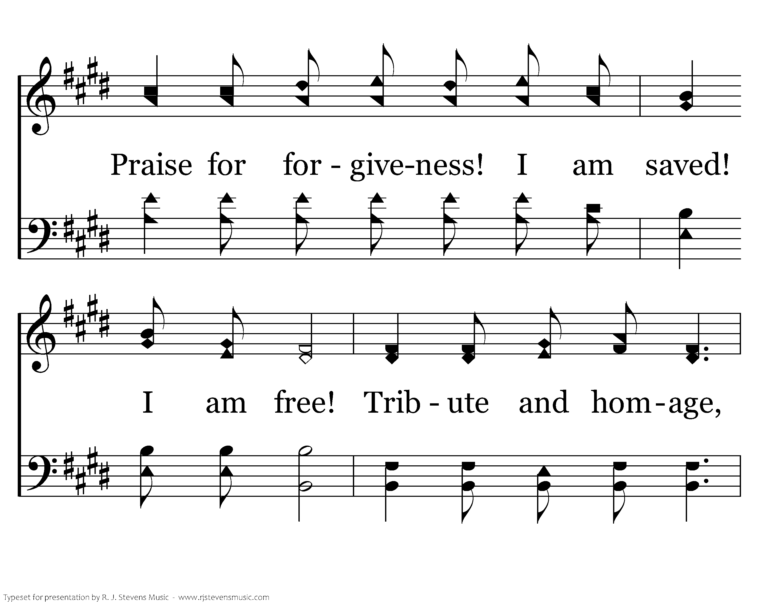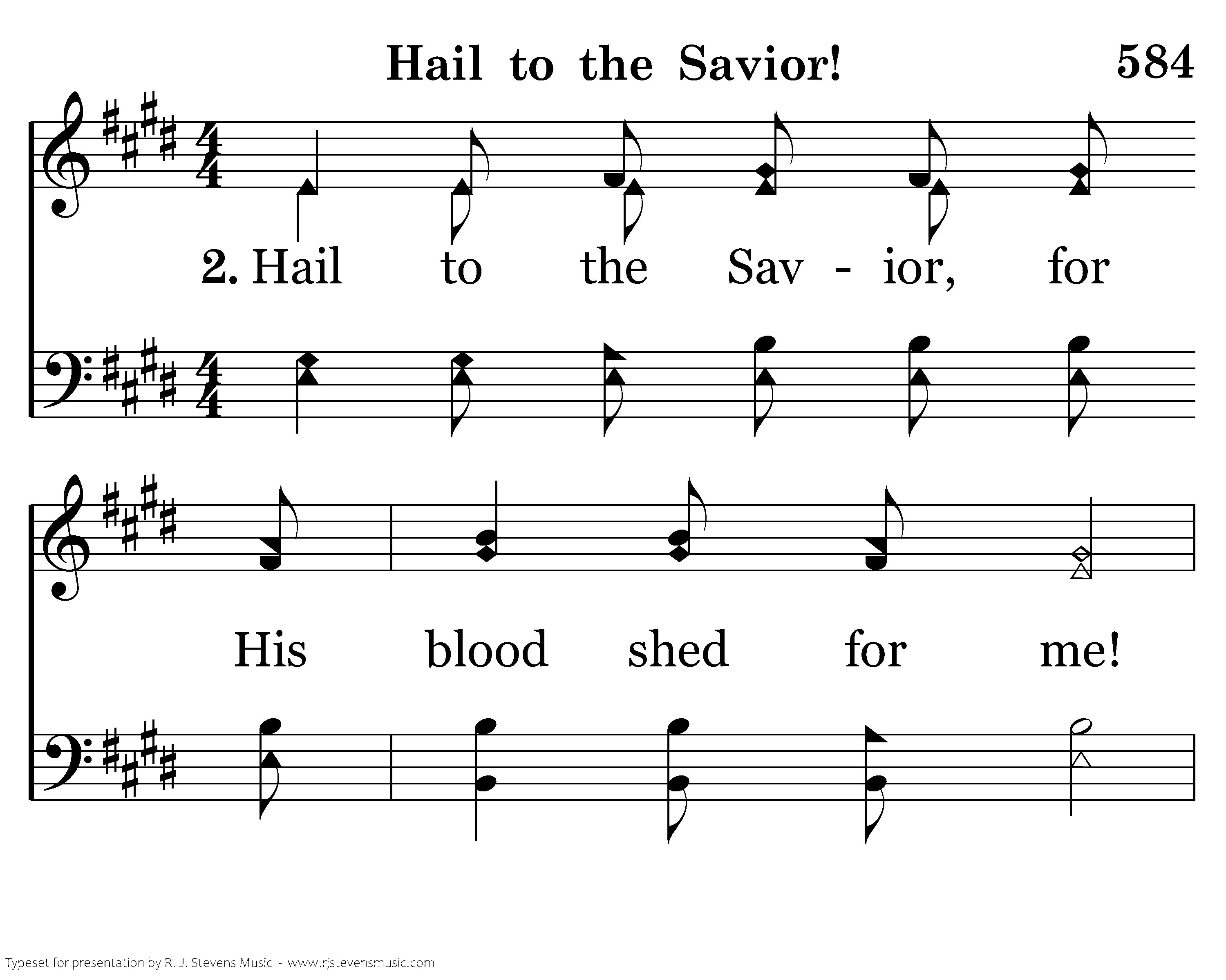 Hail to the Savior, for His blood shed for me! Praise for forgiveness! I am saved! I am free! Tribute and homage, service and love, Give to our Savior, now in heaven above!