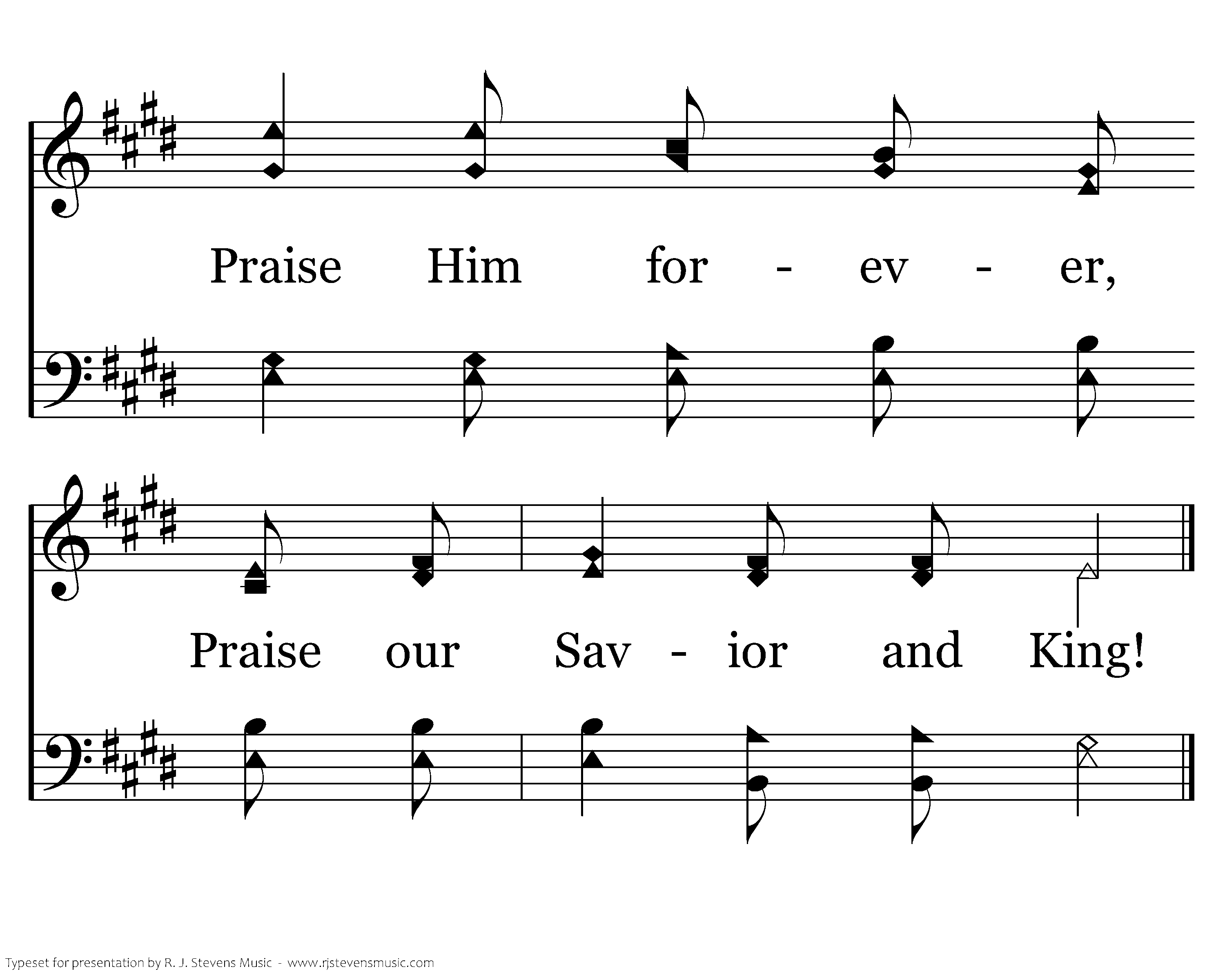 Hail ! Hail! Jesus, our king! Praise Him forever! Lift your voices and sing! Thru endless ages "Hallelujahs" will ring! Praise Him forever, Praise our Savior and King!