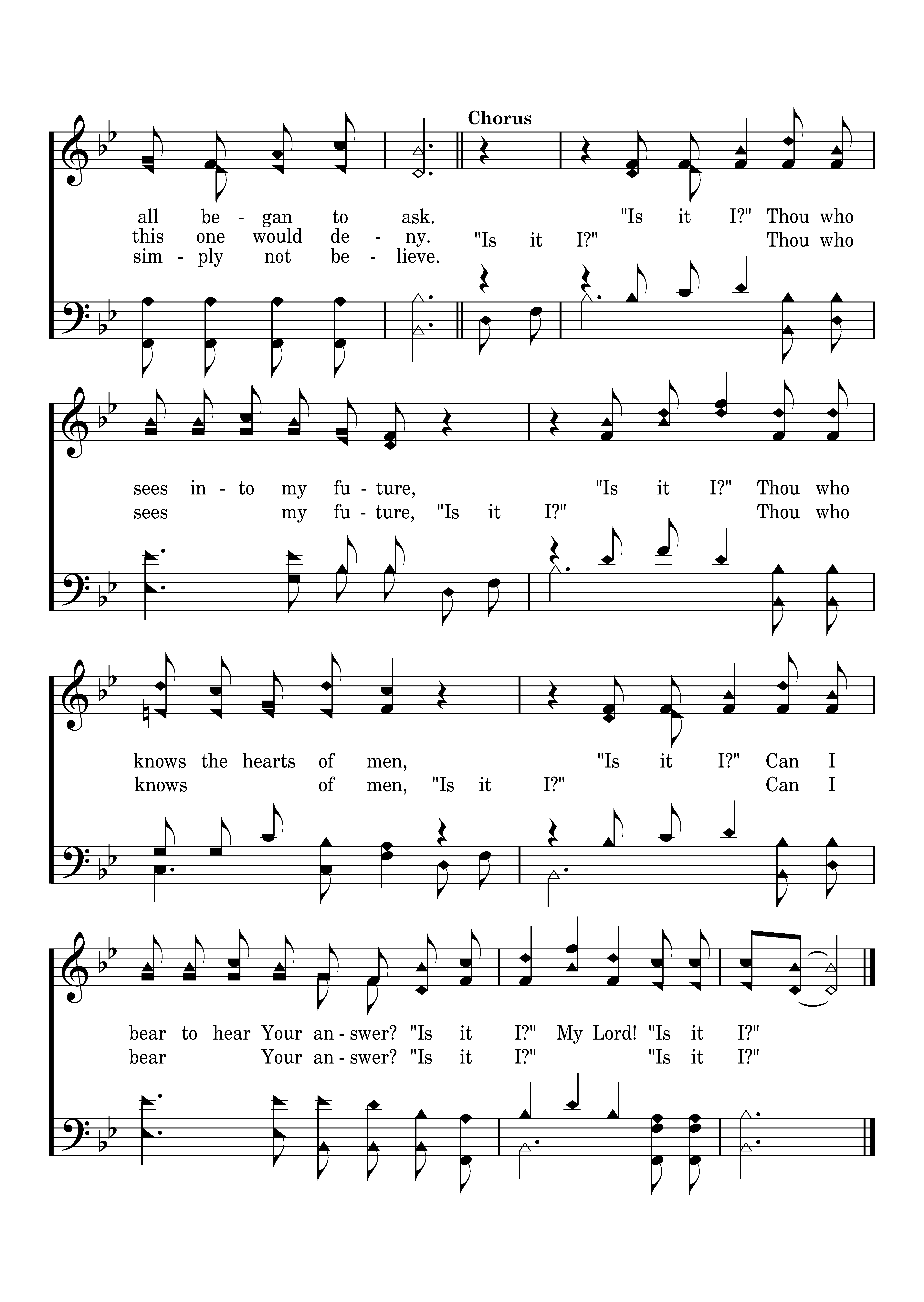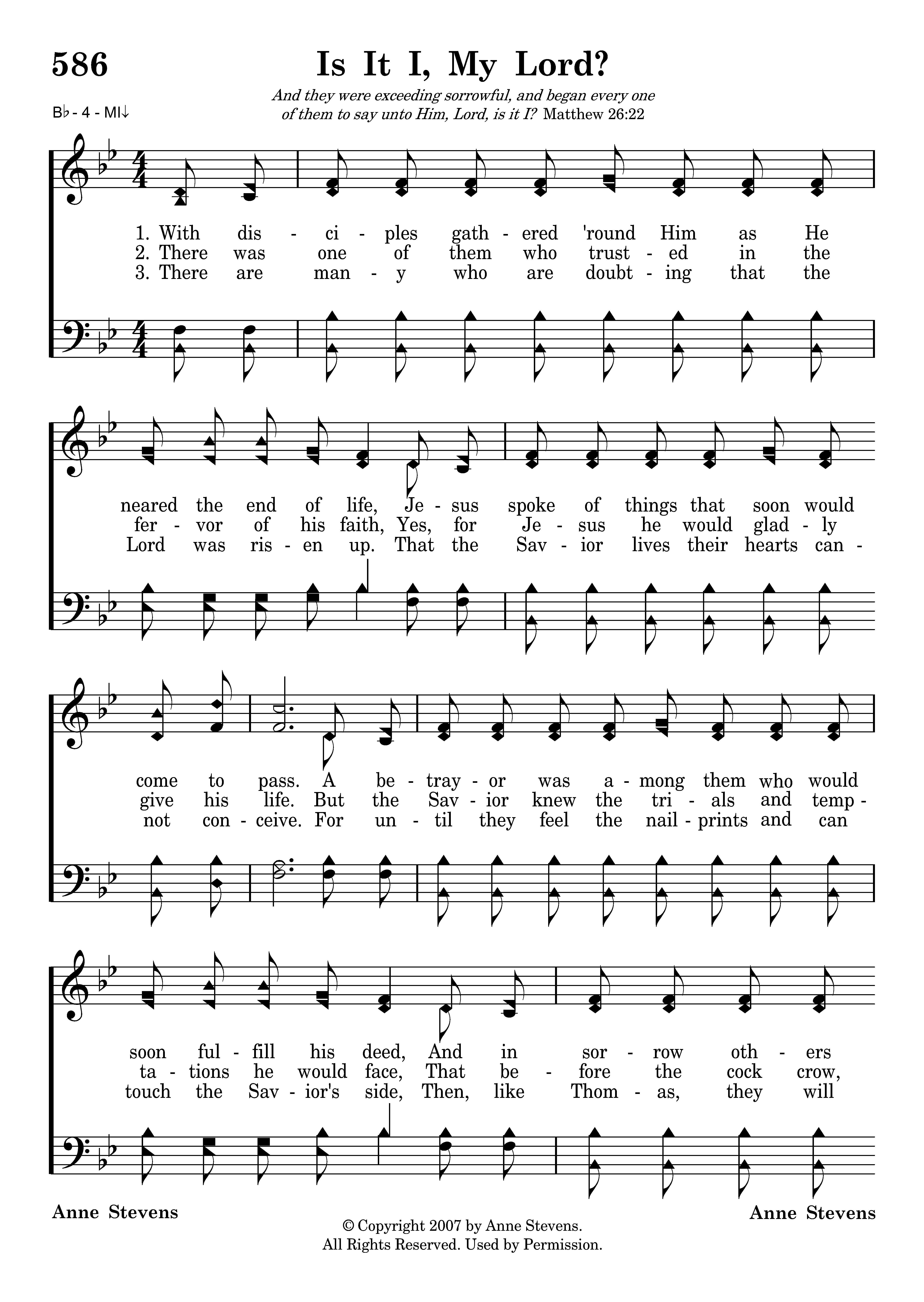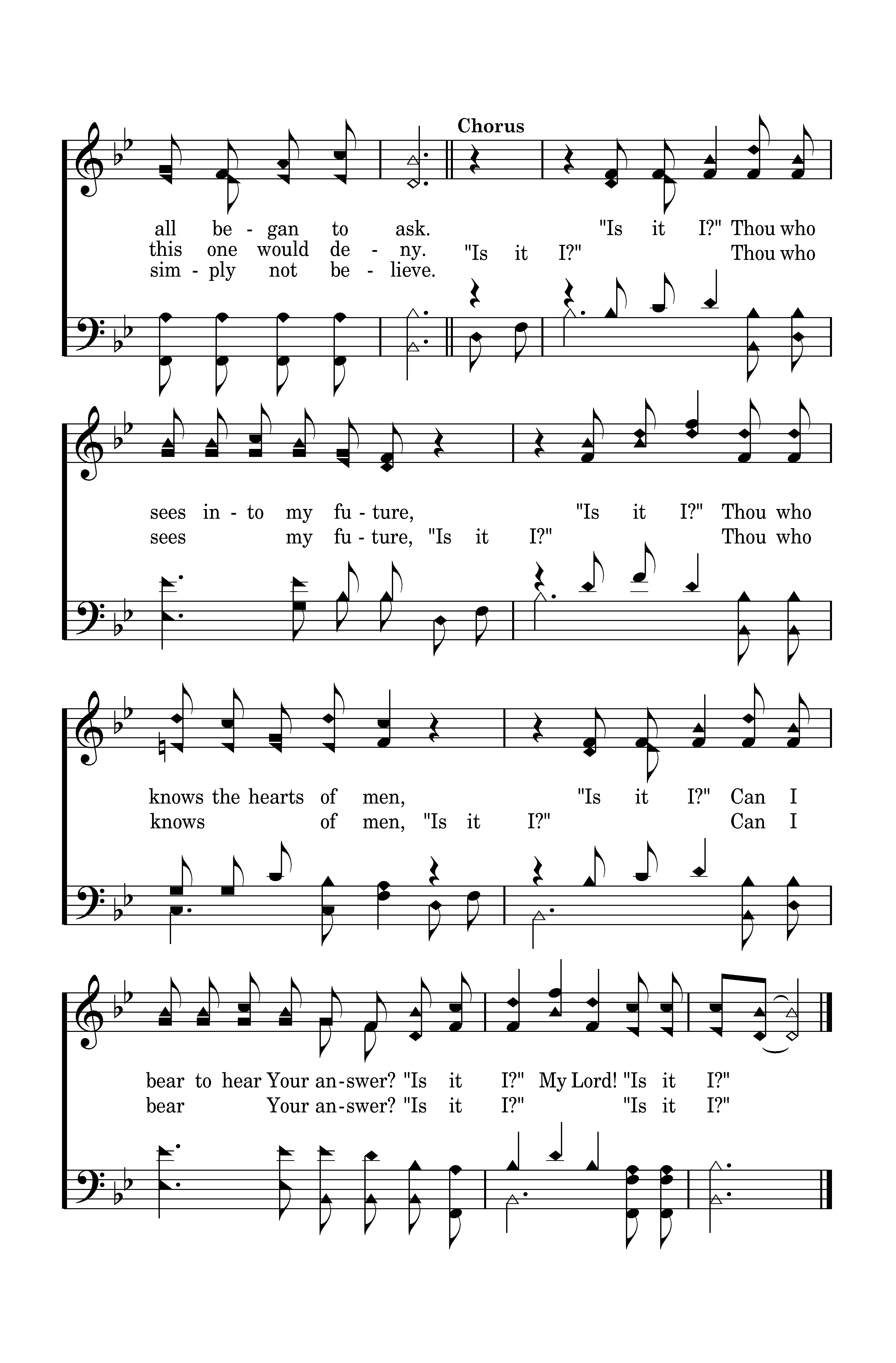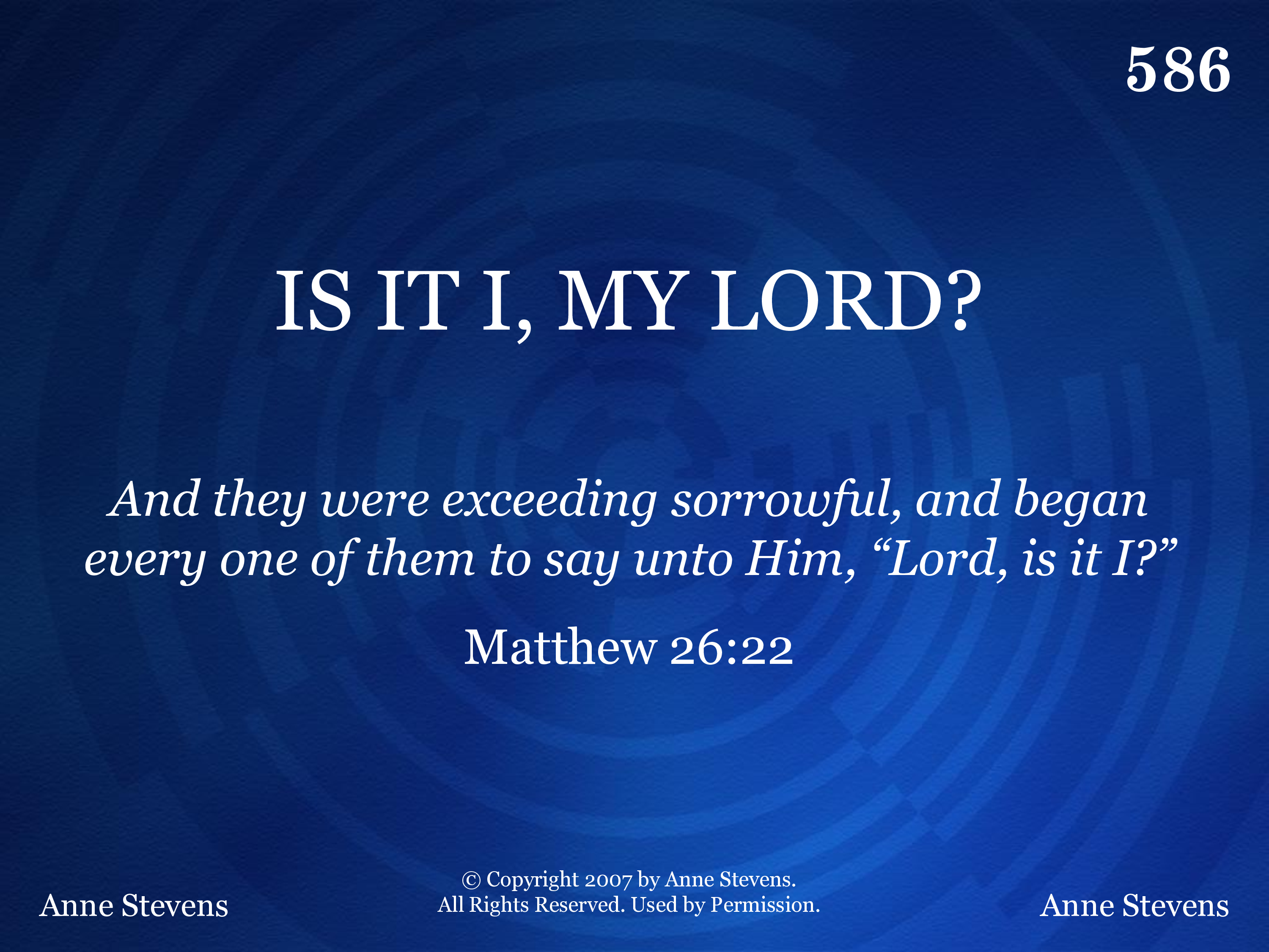 Is it I? Thou who sees into my future, "Is it I?" Thou who knows the hearts of men, "Is it I?" Can I bear to hear your answer? "Is it I?" My Lord! "Is it I?"