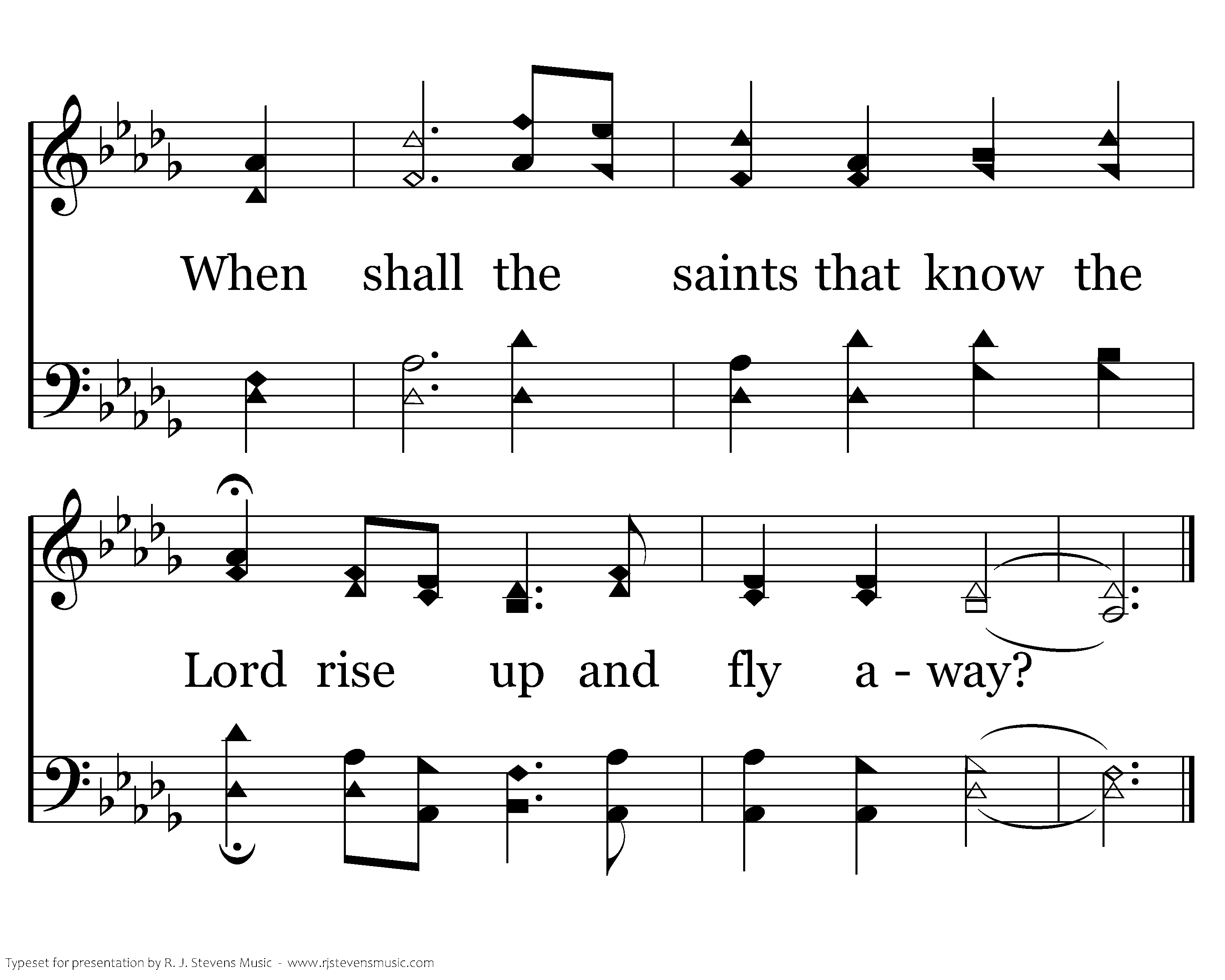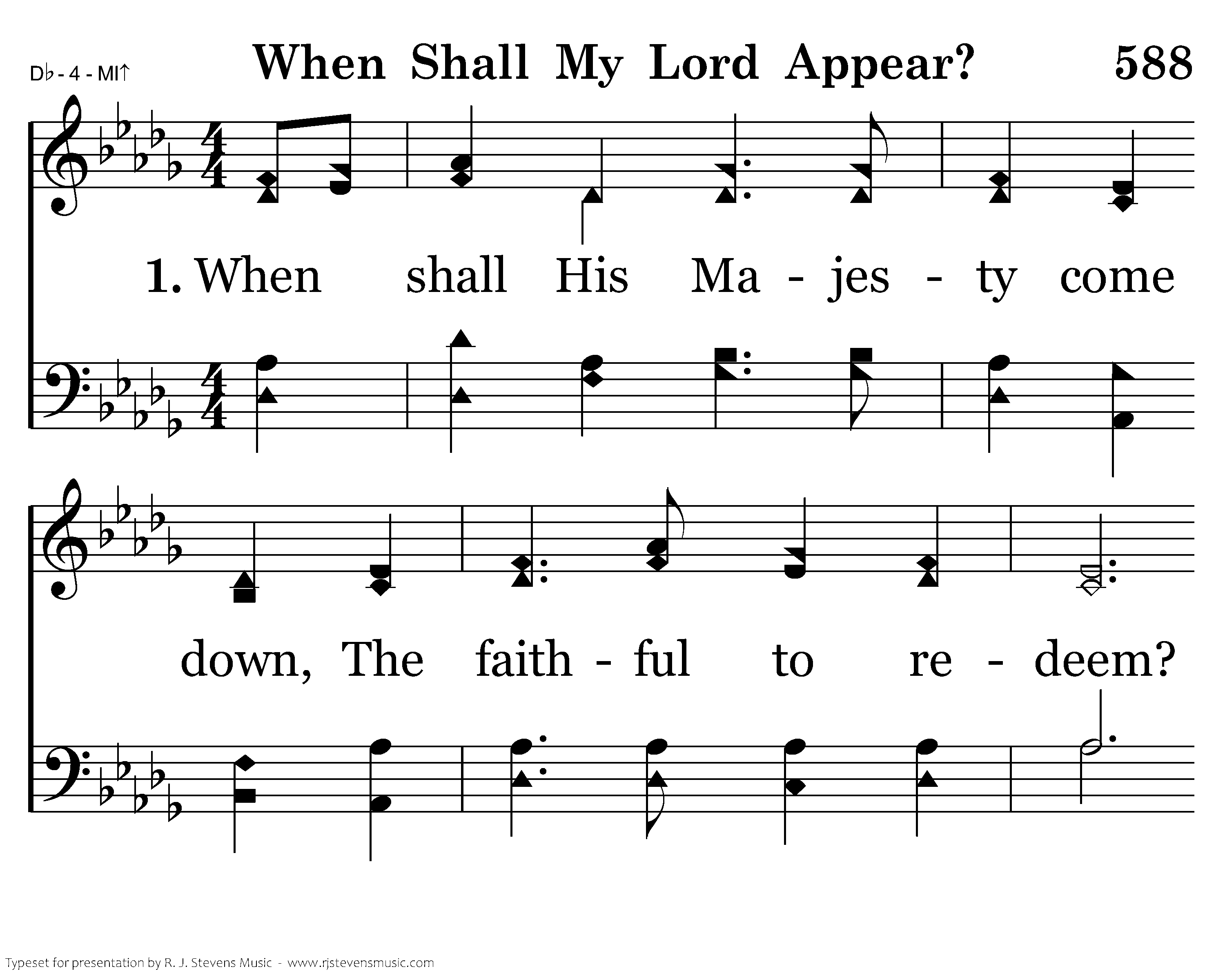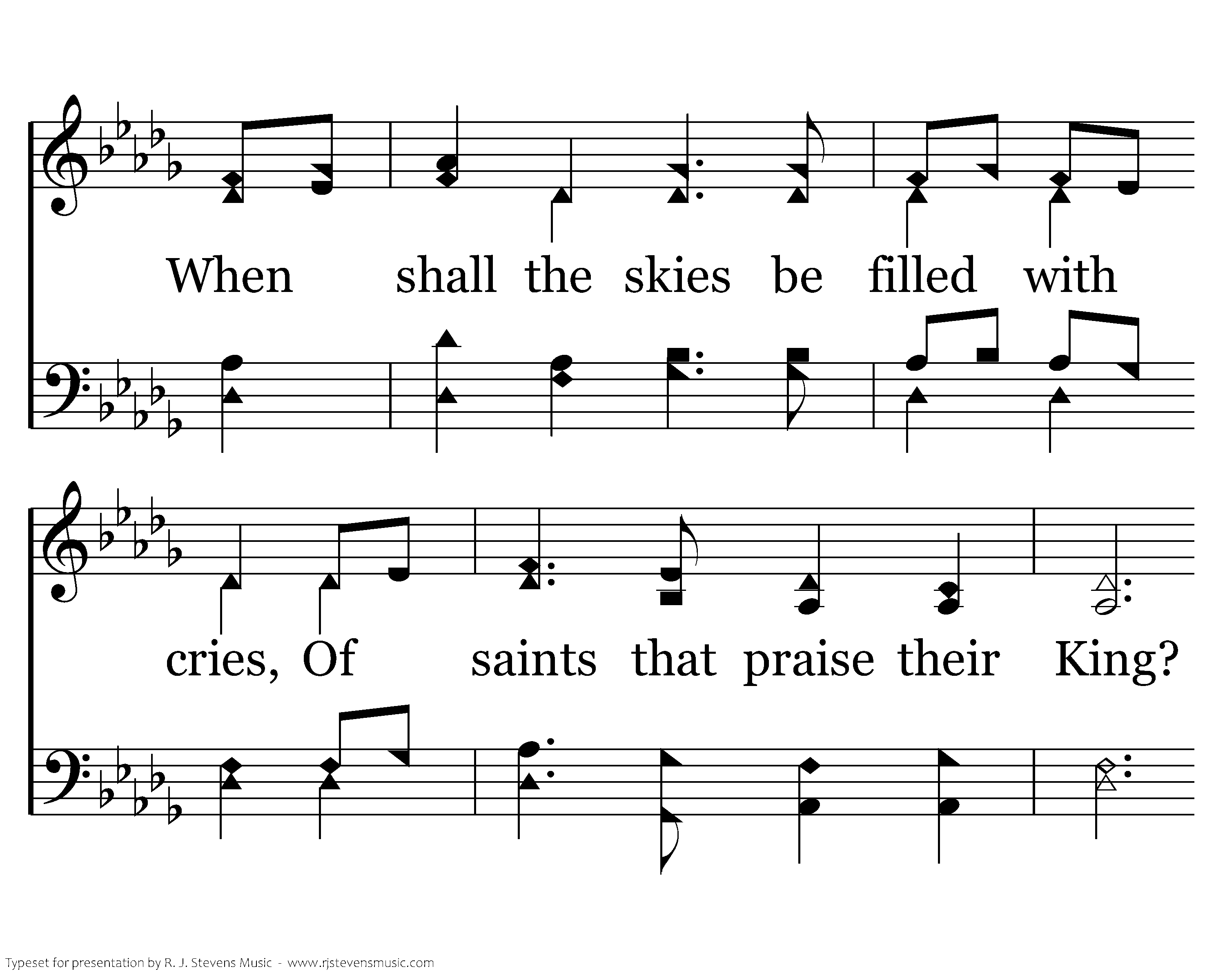 When shall His Majesty come down, The faithful to redeem? When shall the skies be filled with cries, Of saints that praise their King? When shall the dead in Christ arise, In wondrous grand array? When shall the saints that know the Lord rise up and fly away?