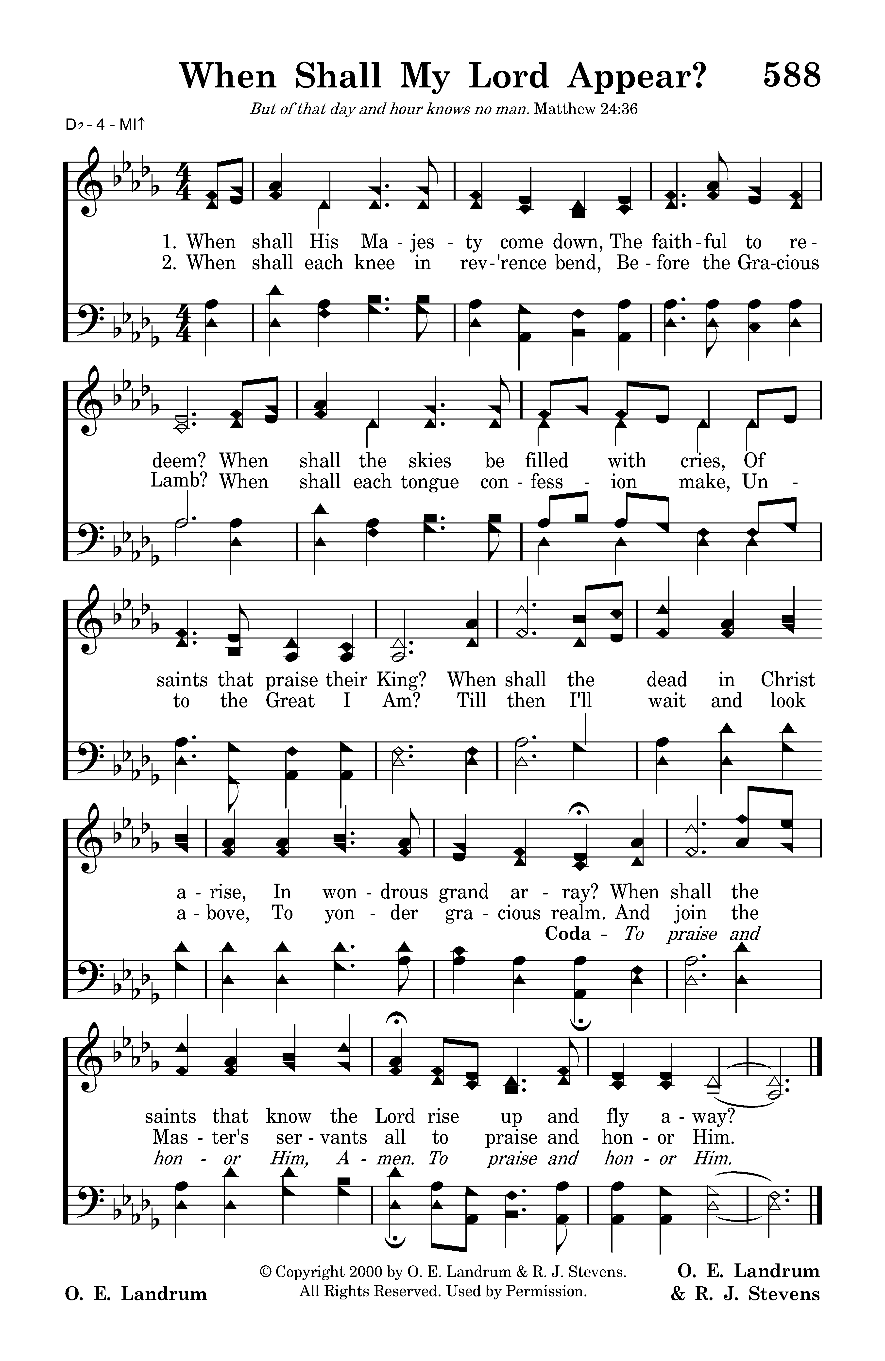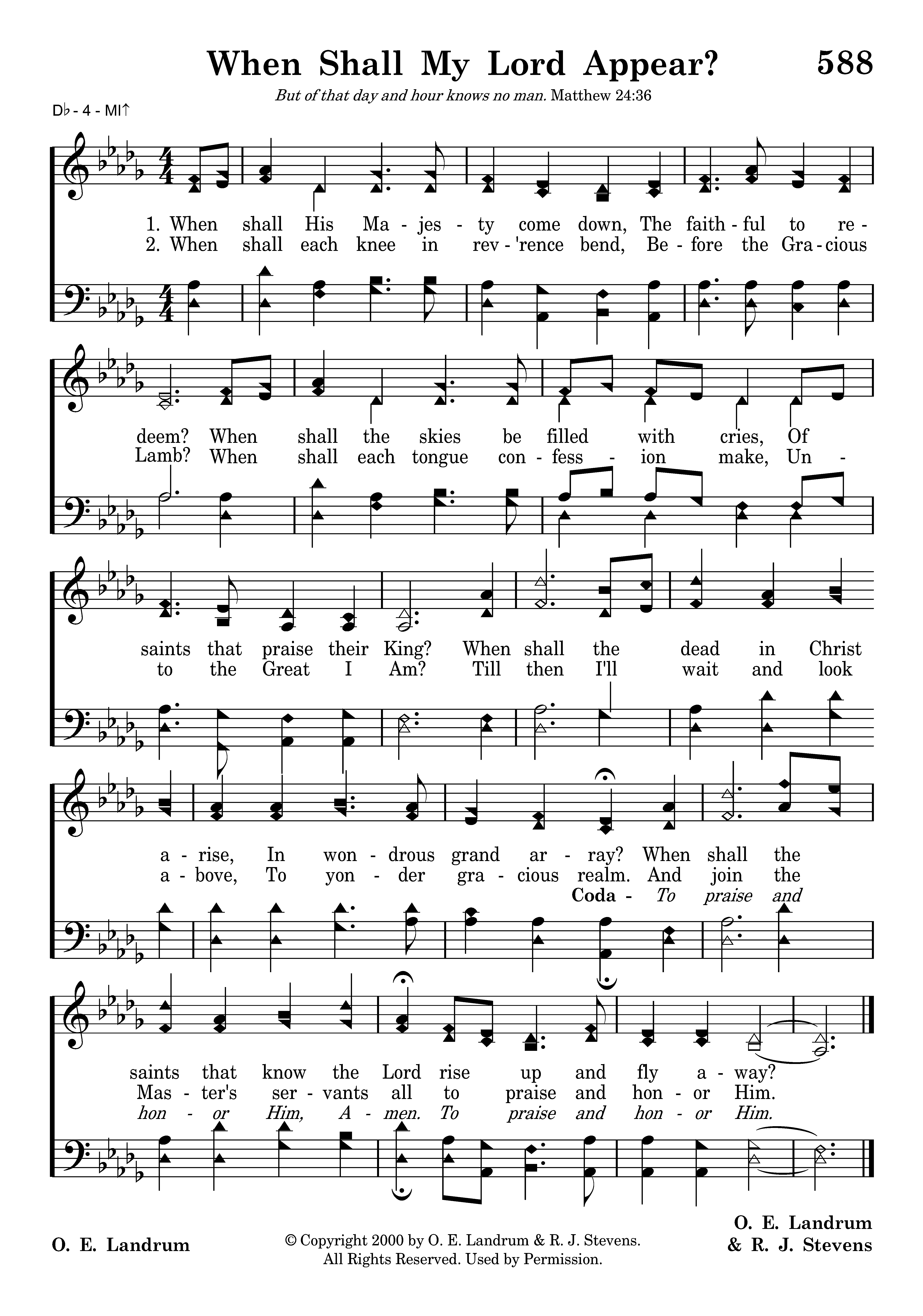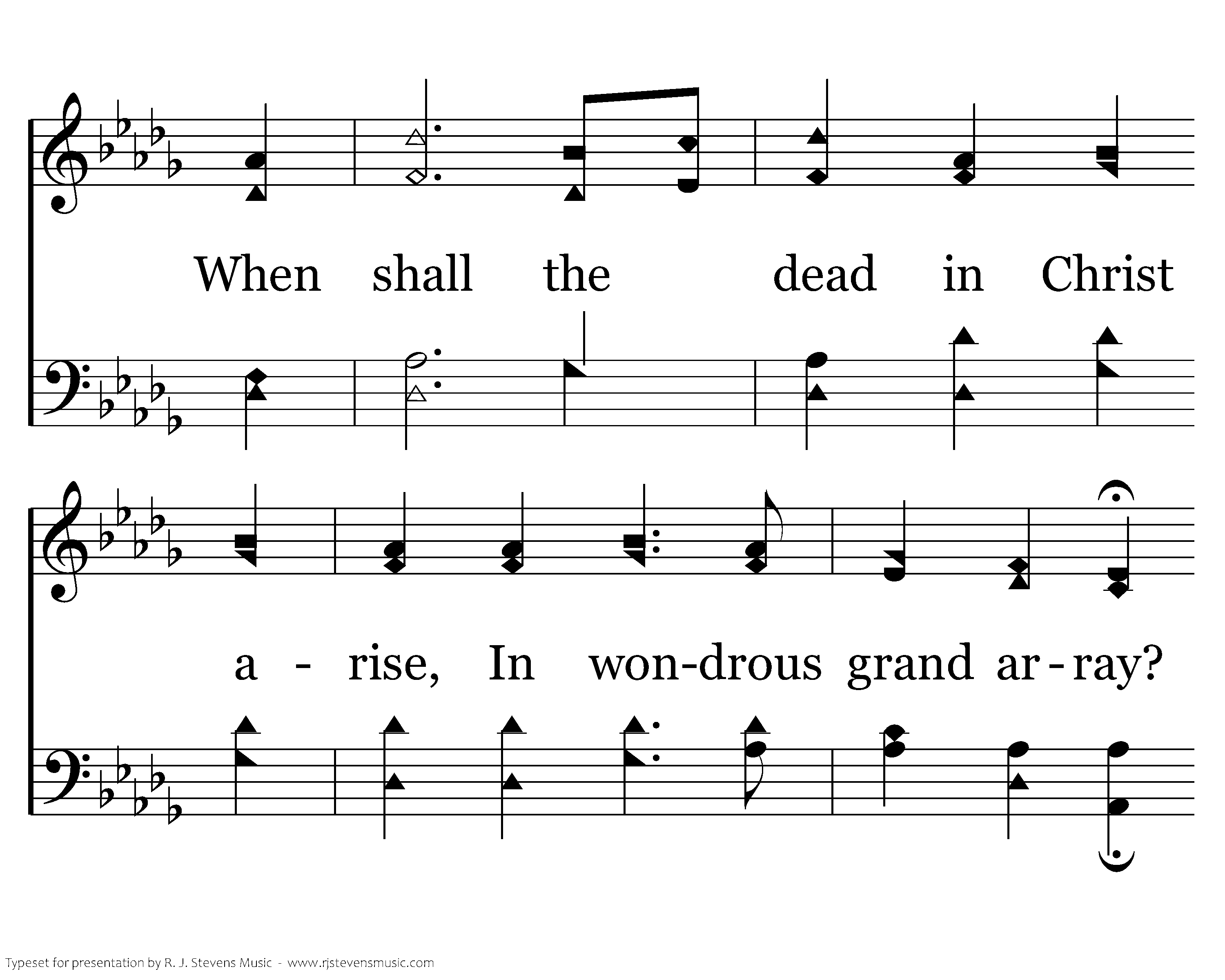 When shall His Majesty come down, The faithful to redeem? When shall the skies be filled with cries, Of saints that praise their King? When shall the dead in Christ arise, In wondrous grand array? When shall the saints that know the Lord rise up and fly away?