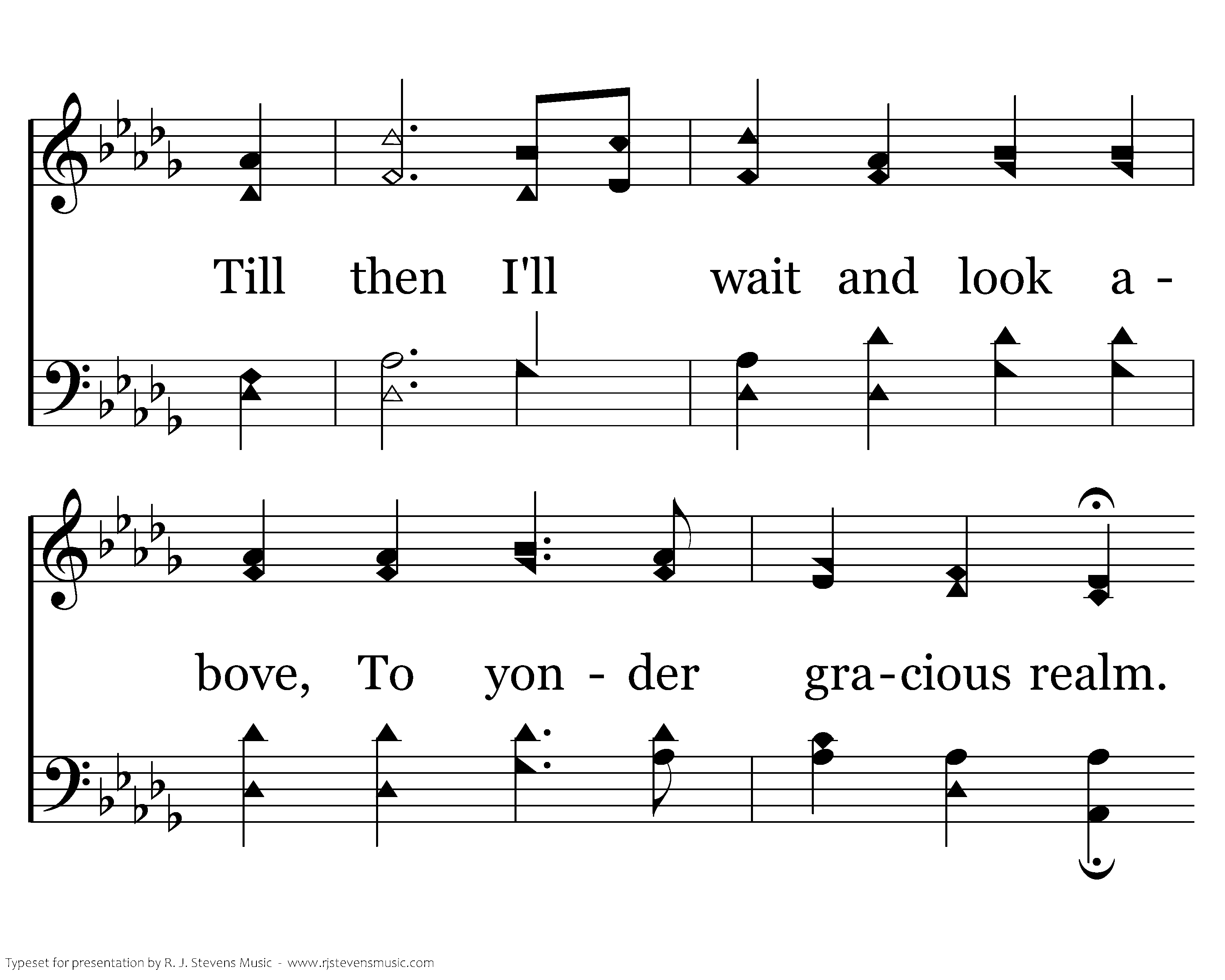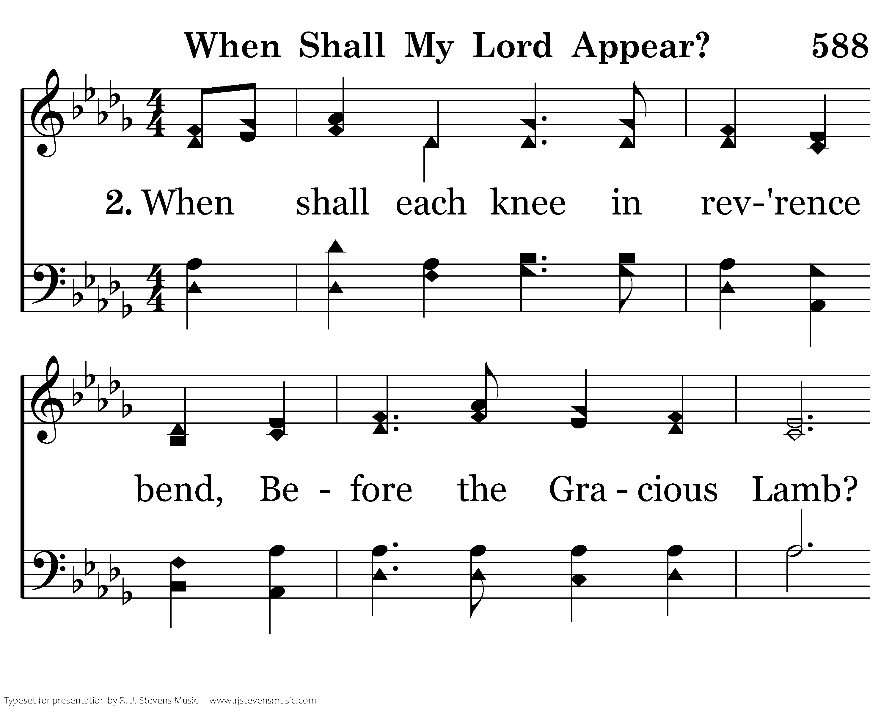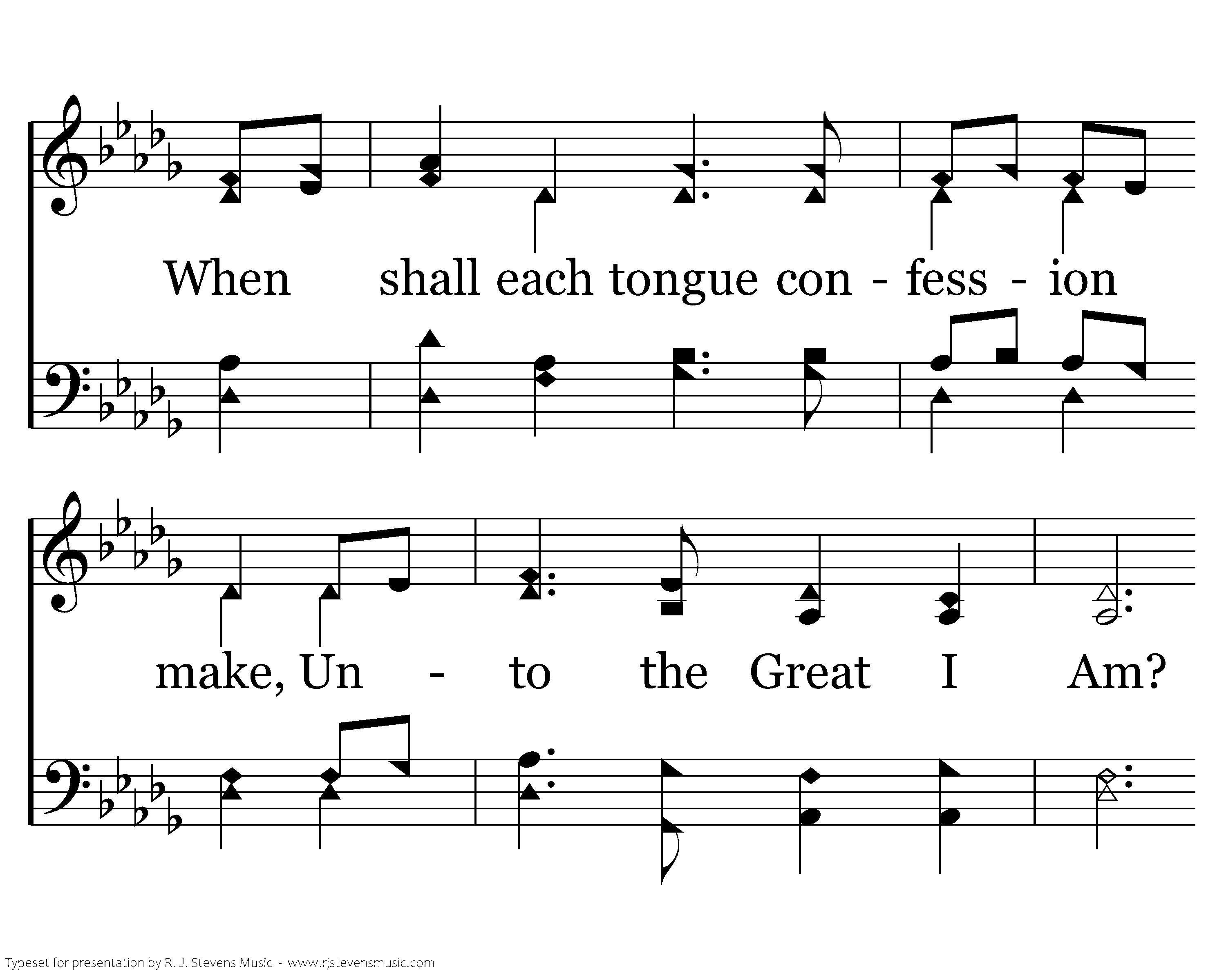 When shall each knee in rev'rence bend, Before the Gracious Lamb? When shall each tongue confession make, Unto the Great I Am? Till then I'll wait and look above, To yonder gracious realm. And join the Master's servants all to praise and honor Him.