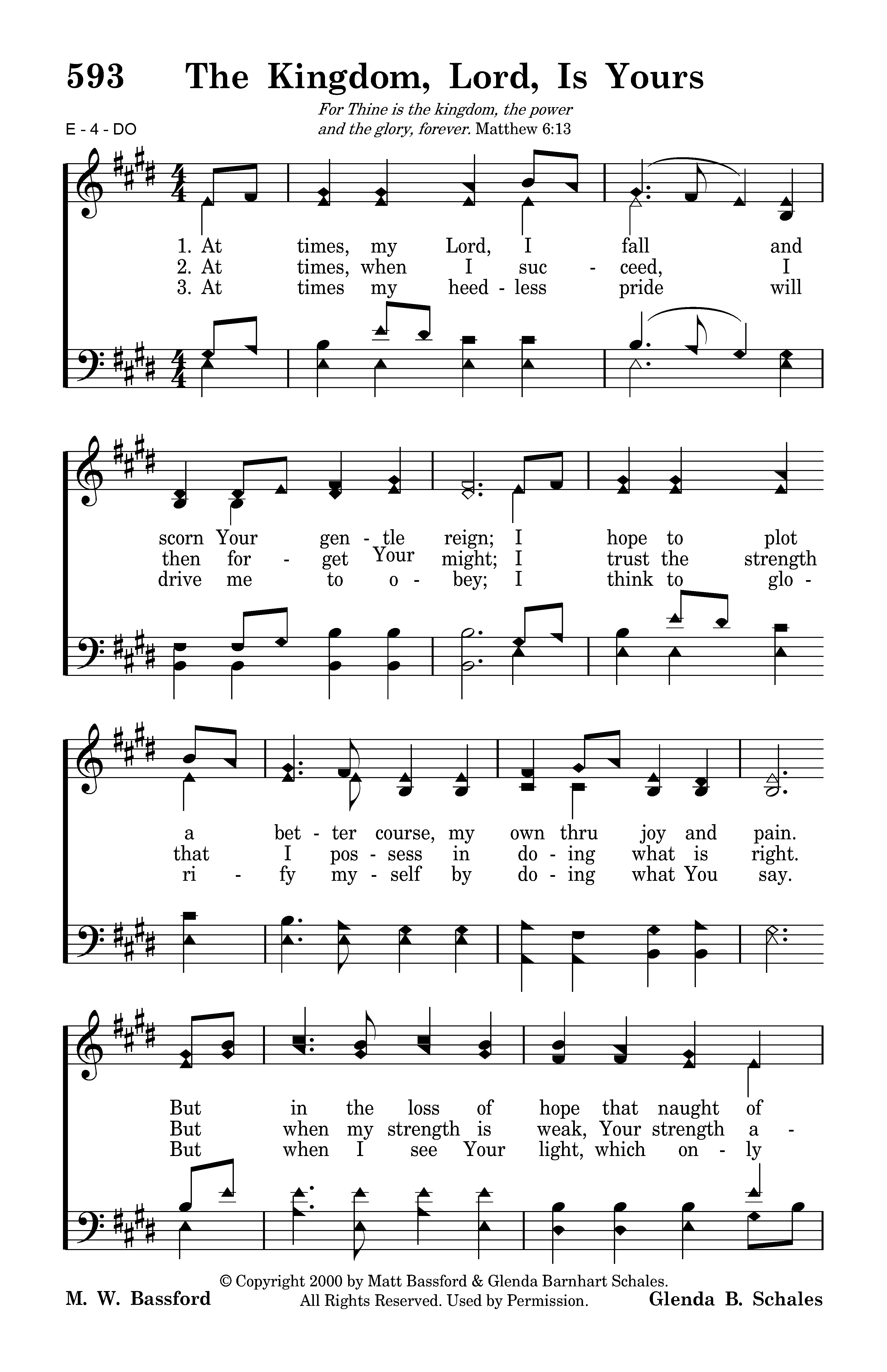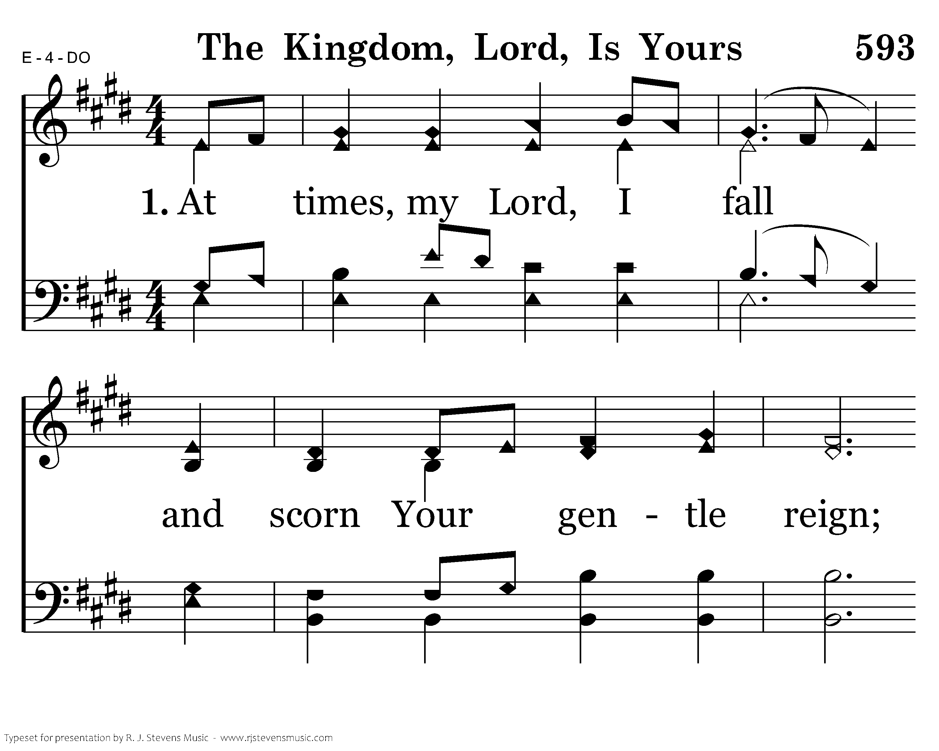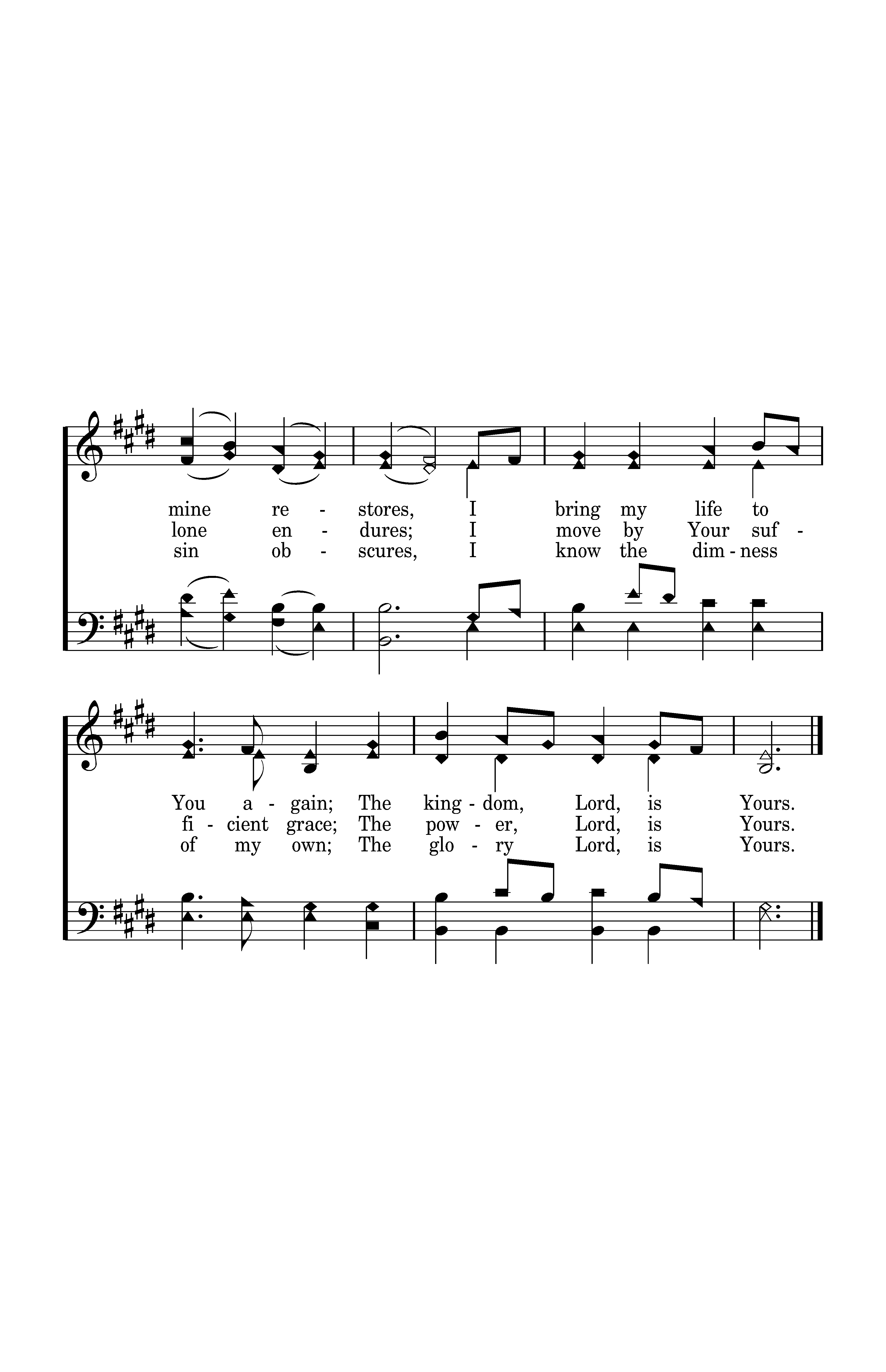 At times, my Lord, I fall and scorn Your gentle reign; I hope to plot a better course, my own through joy and pain. But in the loss of hope that naught of mine restores, I bring my life to You again; The kingdom, Lord, is Yours.