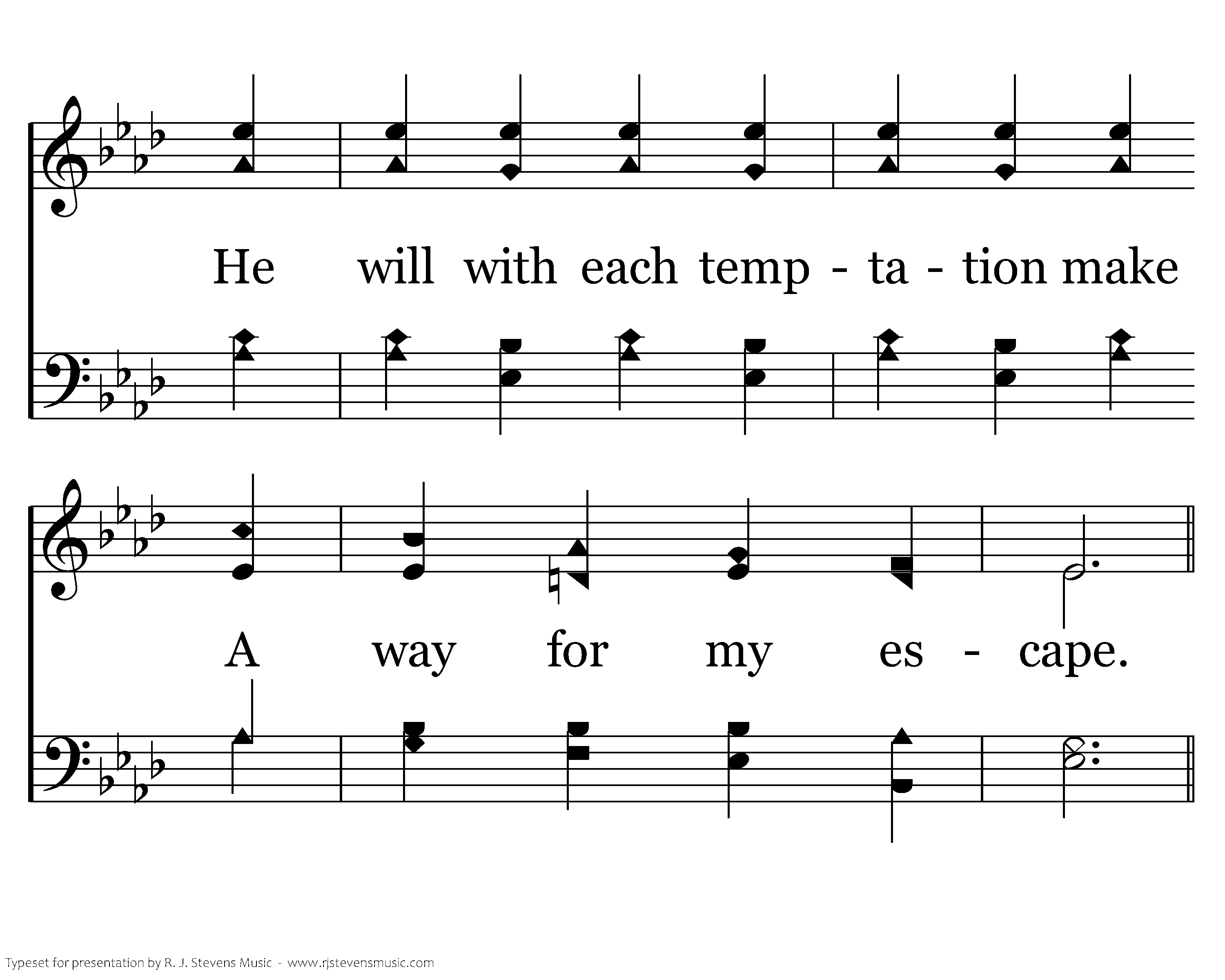 No trial can my spirit break, For God will not forsake; He will with each temptation make A way for my escape.
