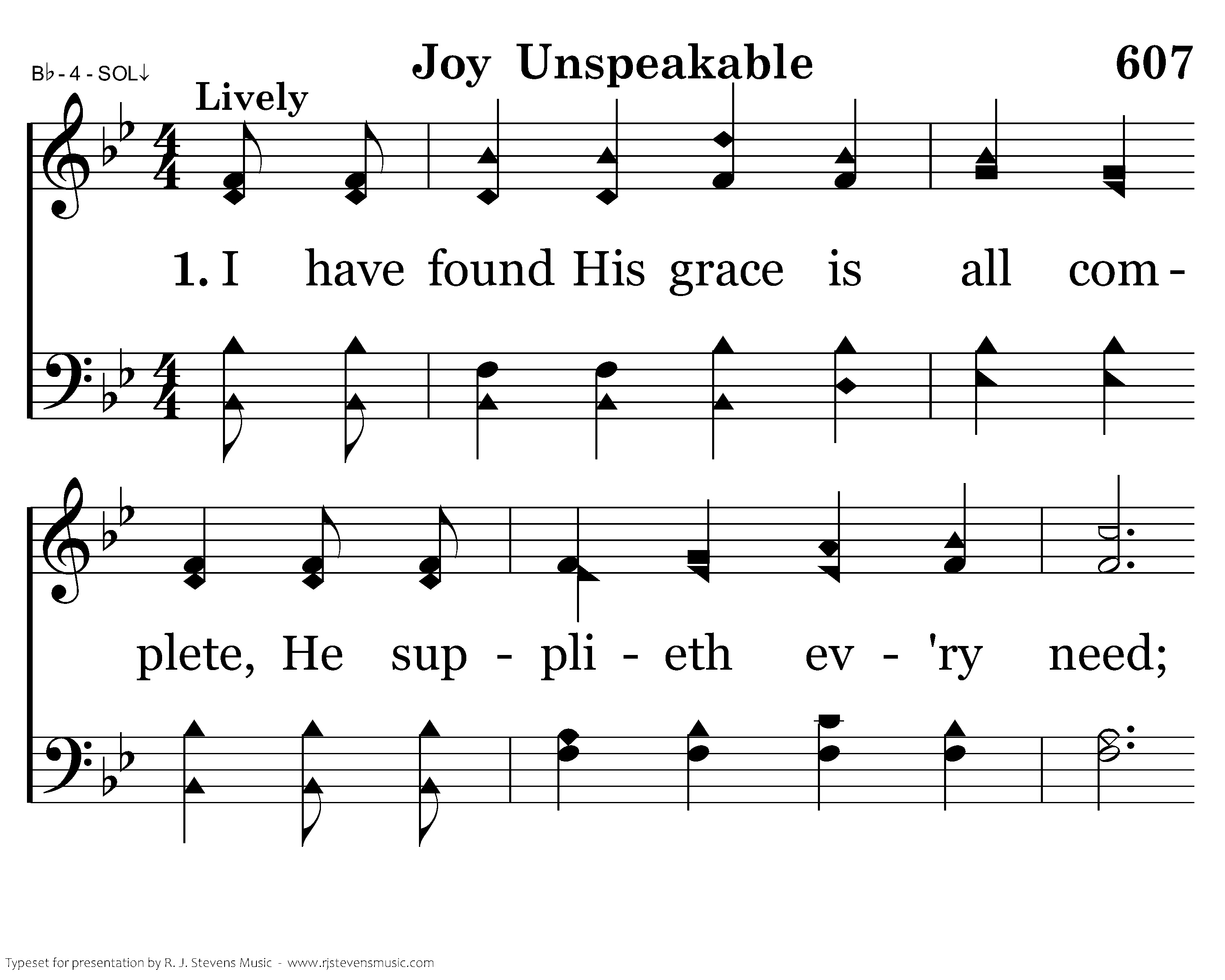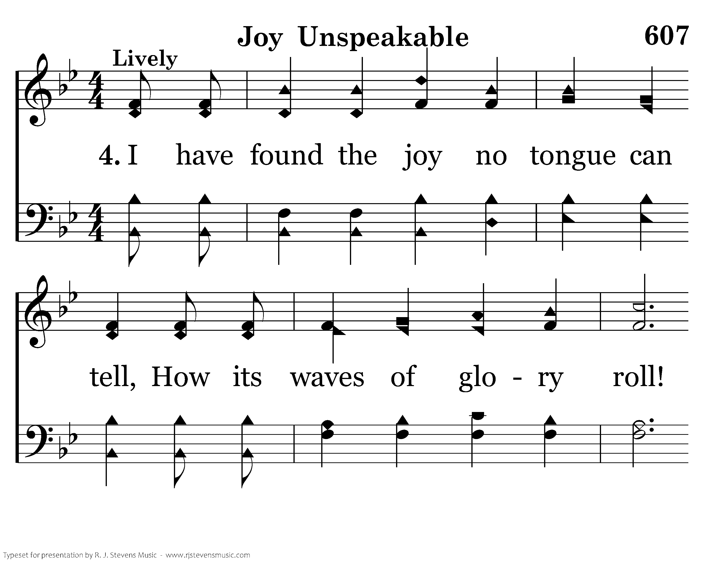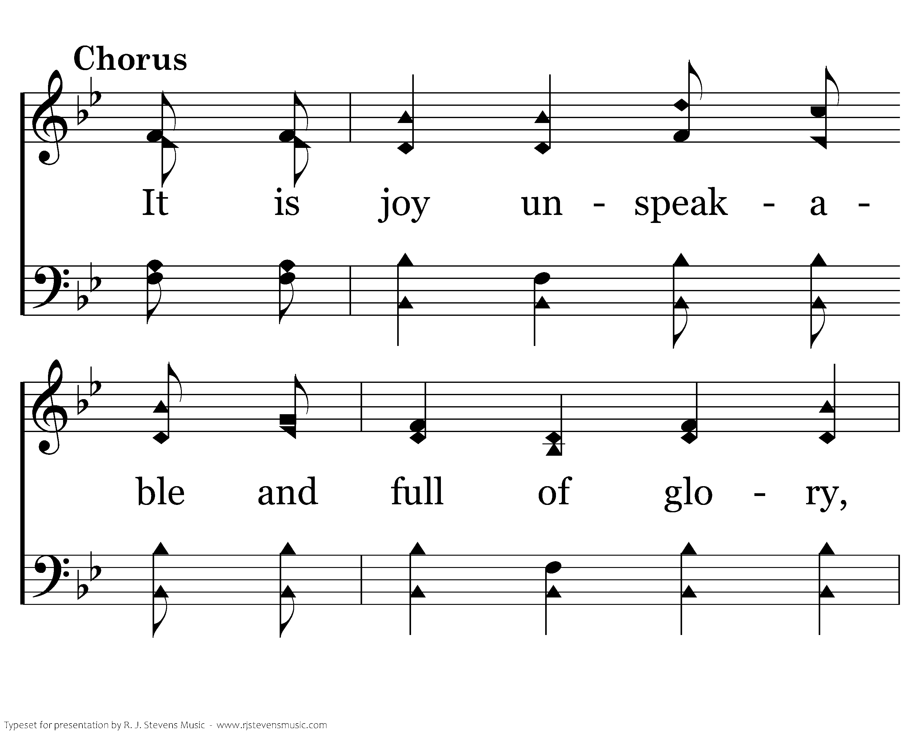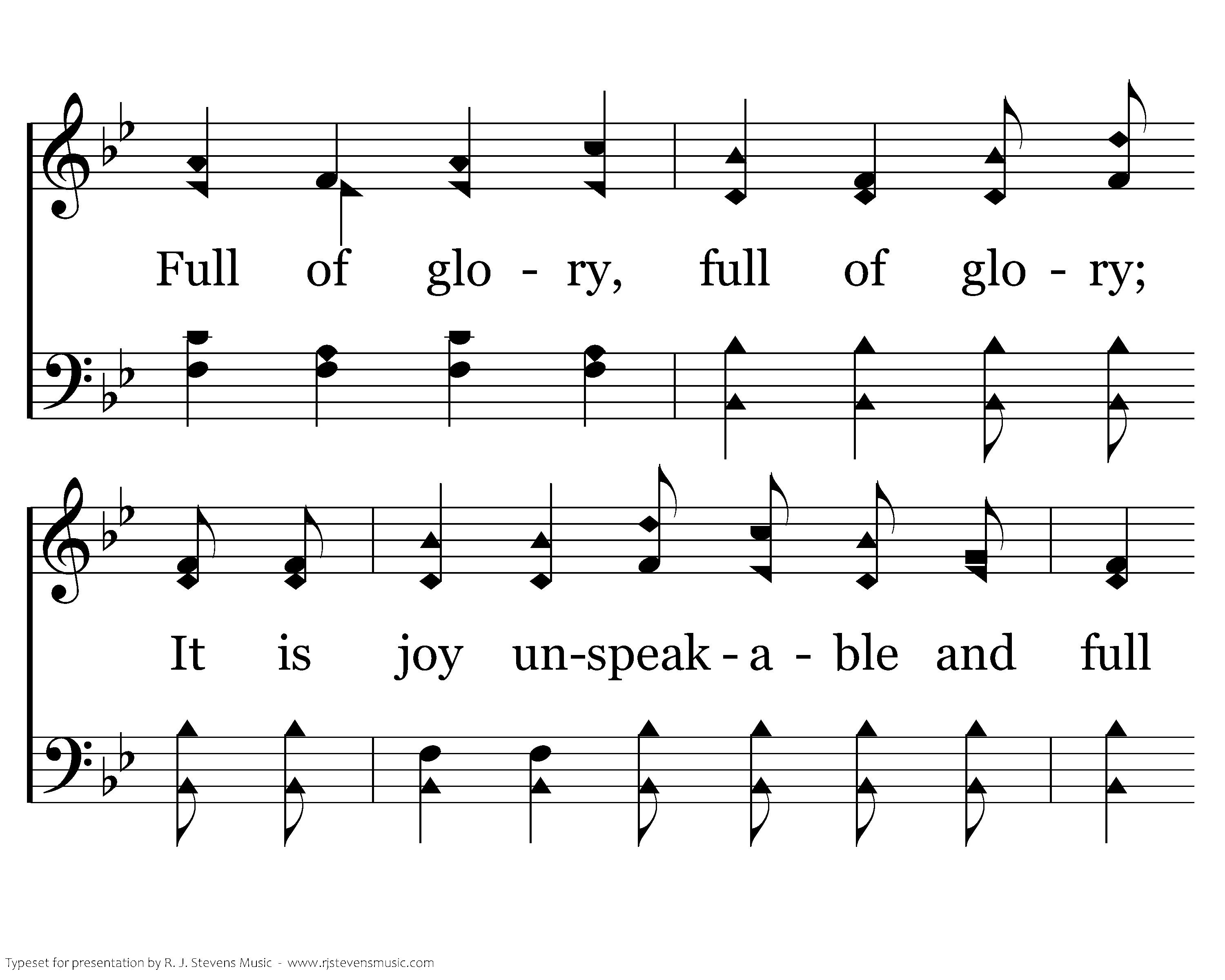 It is joy unspeakable and full of glory, Full of glory, full of glory; It is joy unspeakable and full of glory, O, the half has never yet been told.