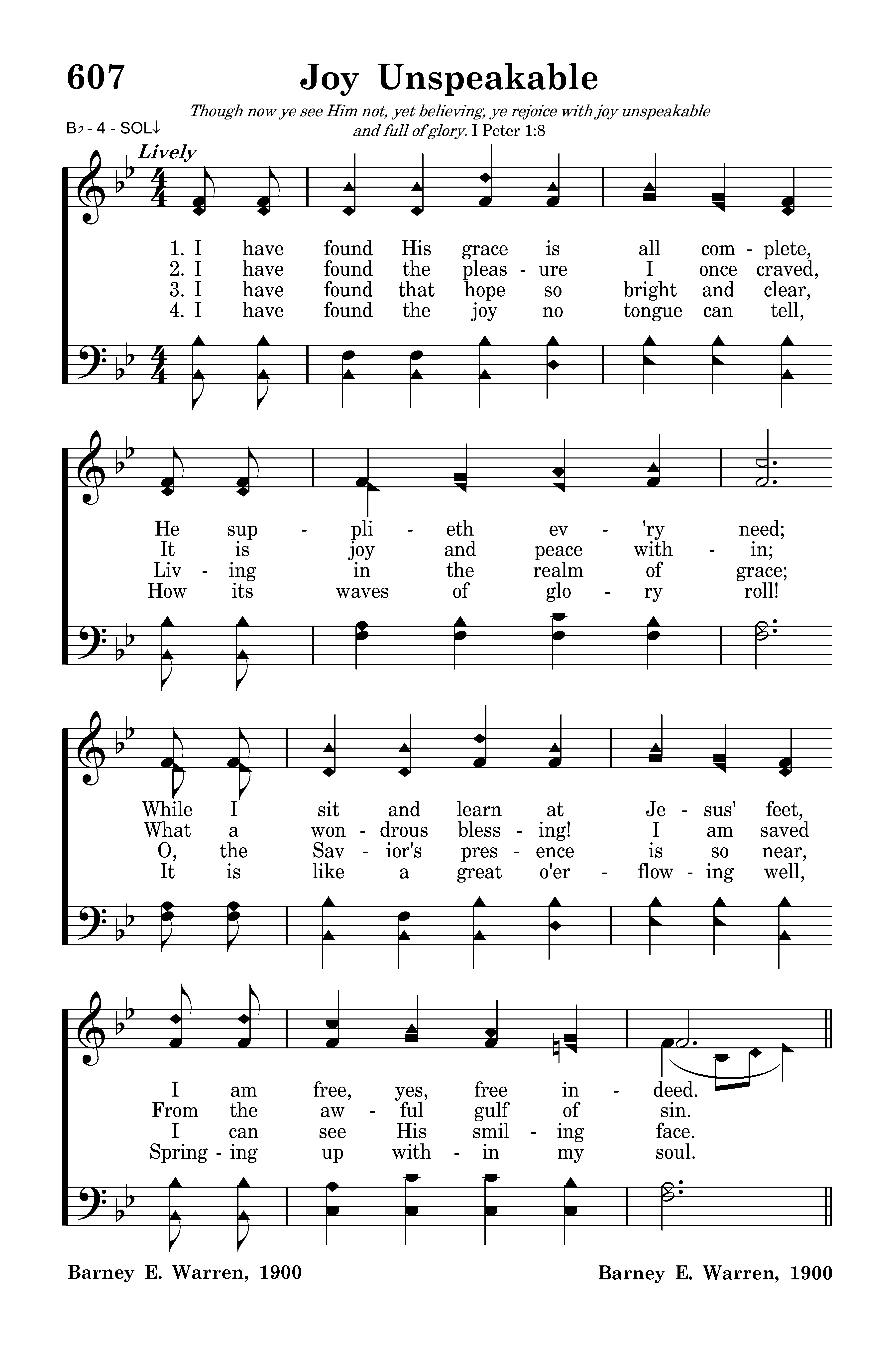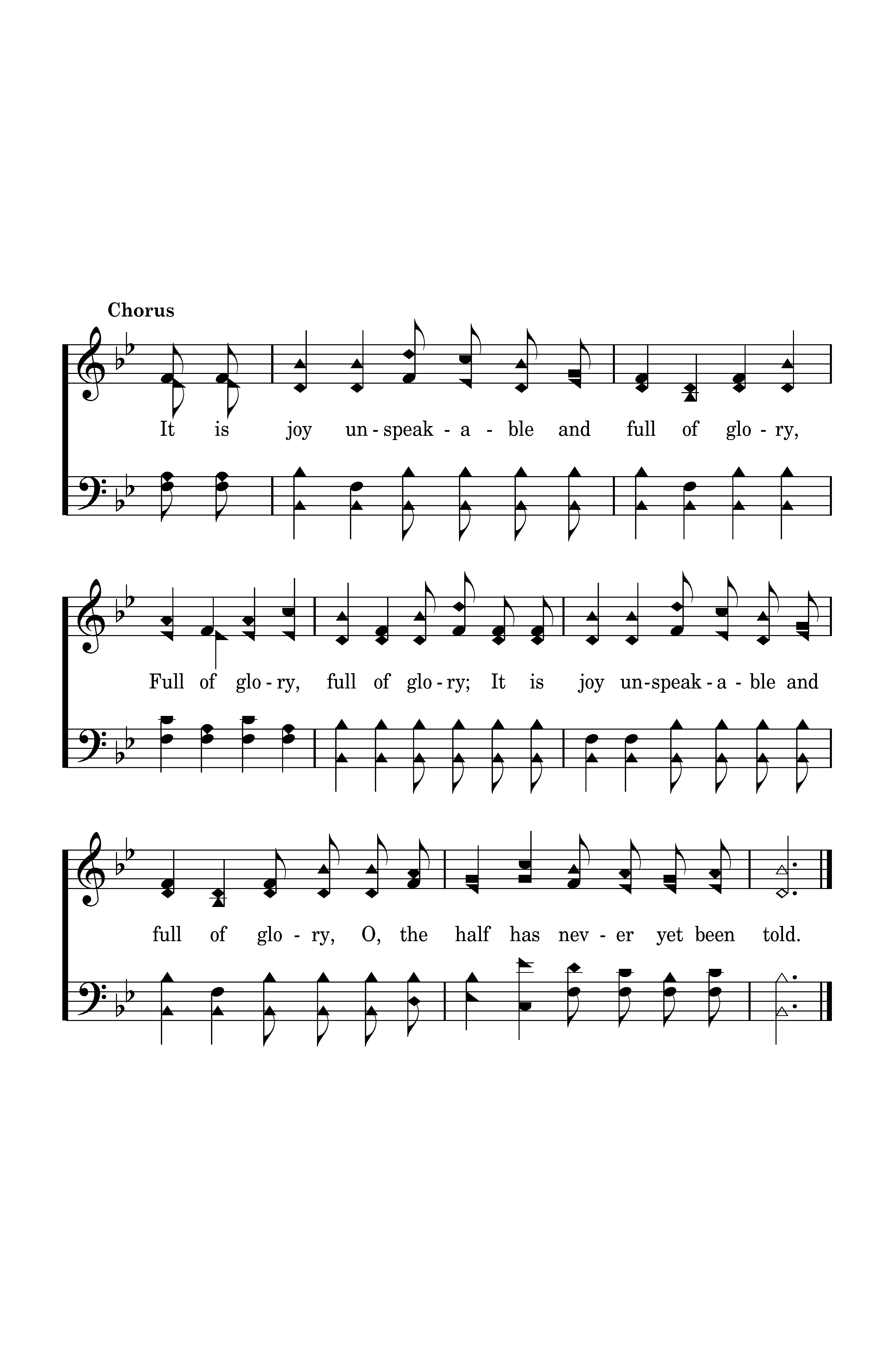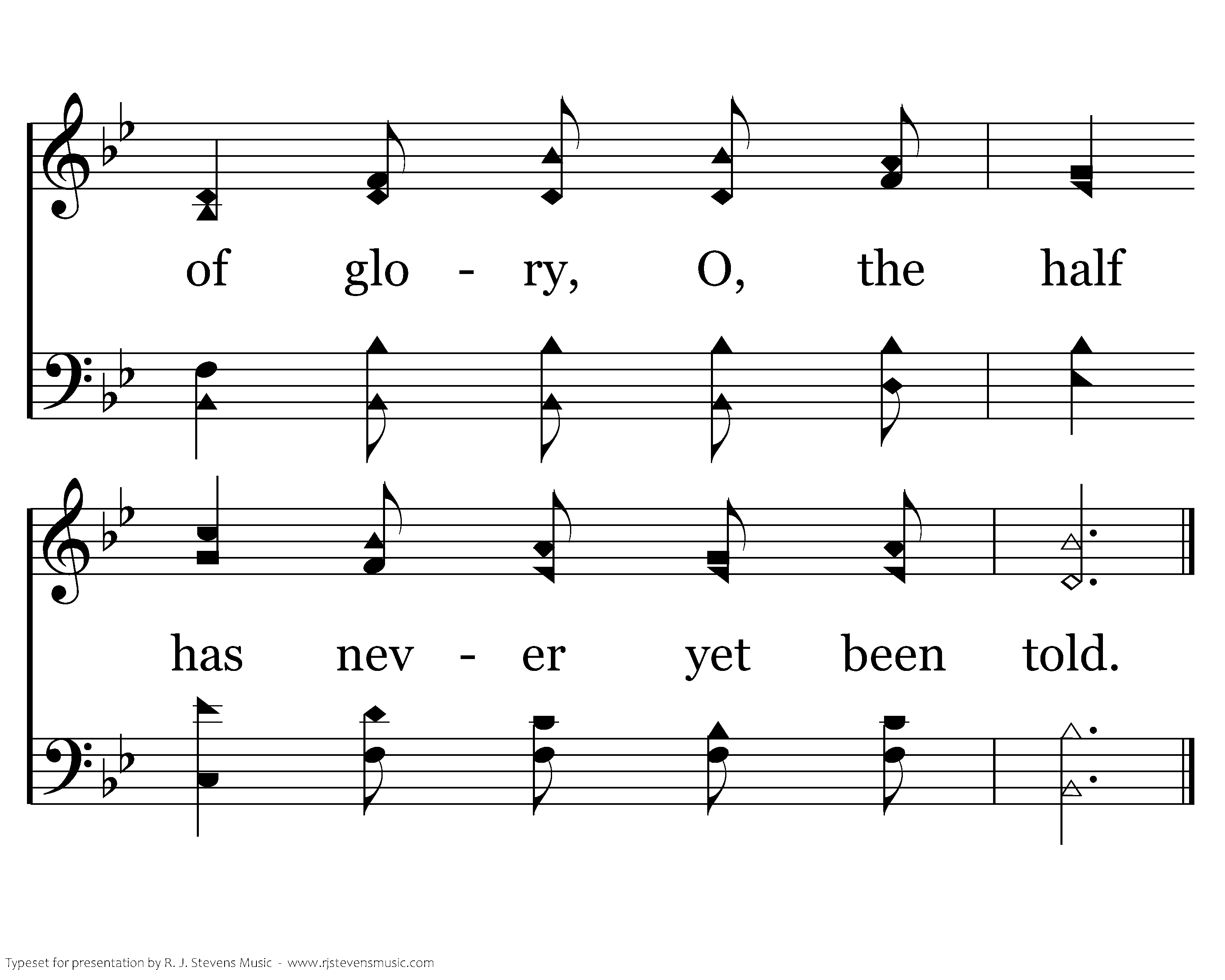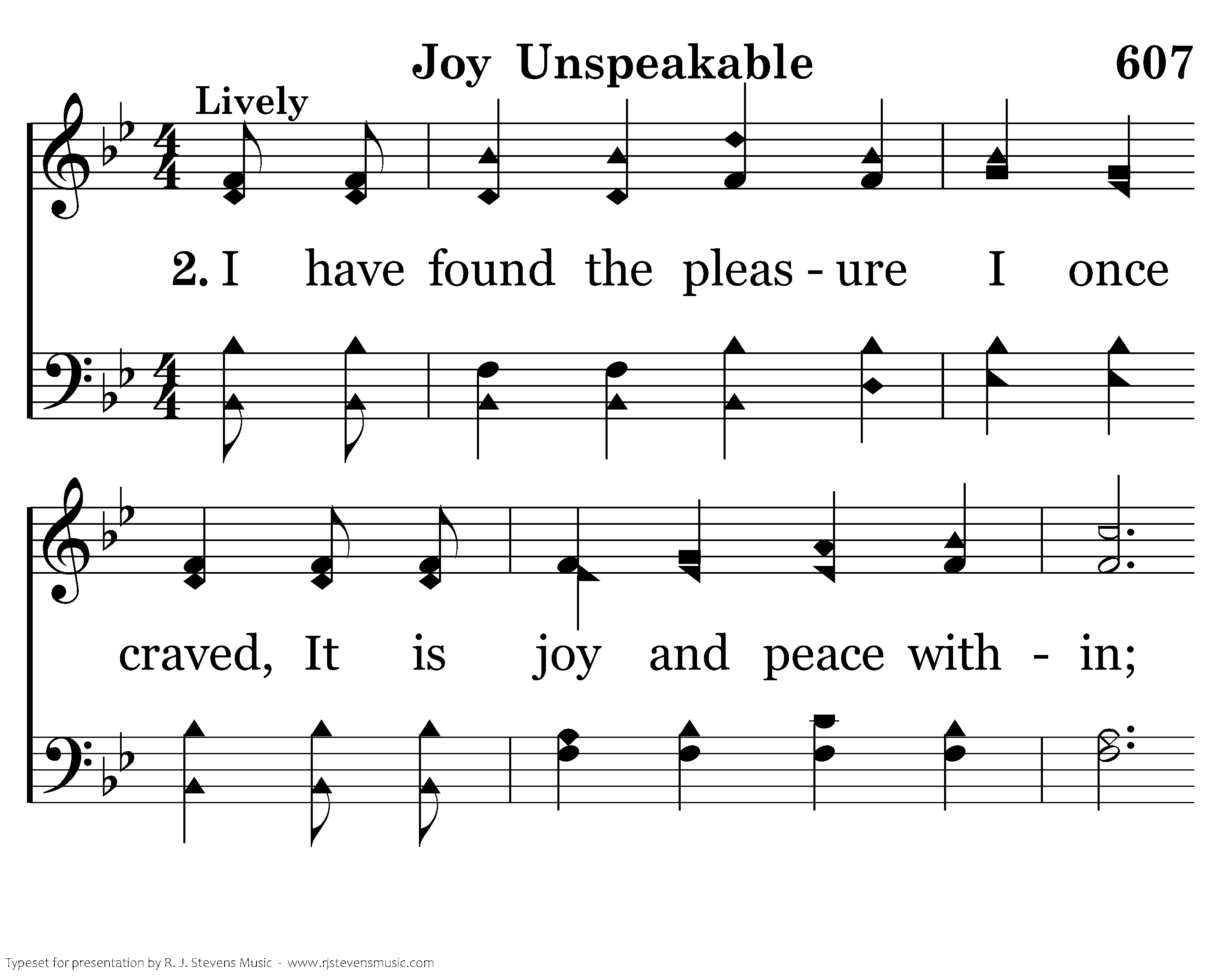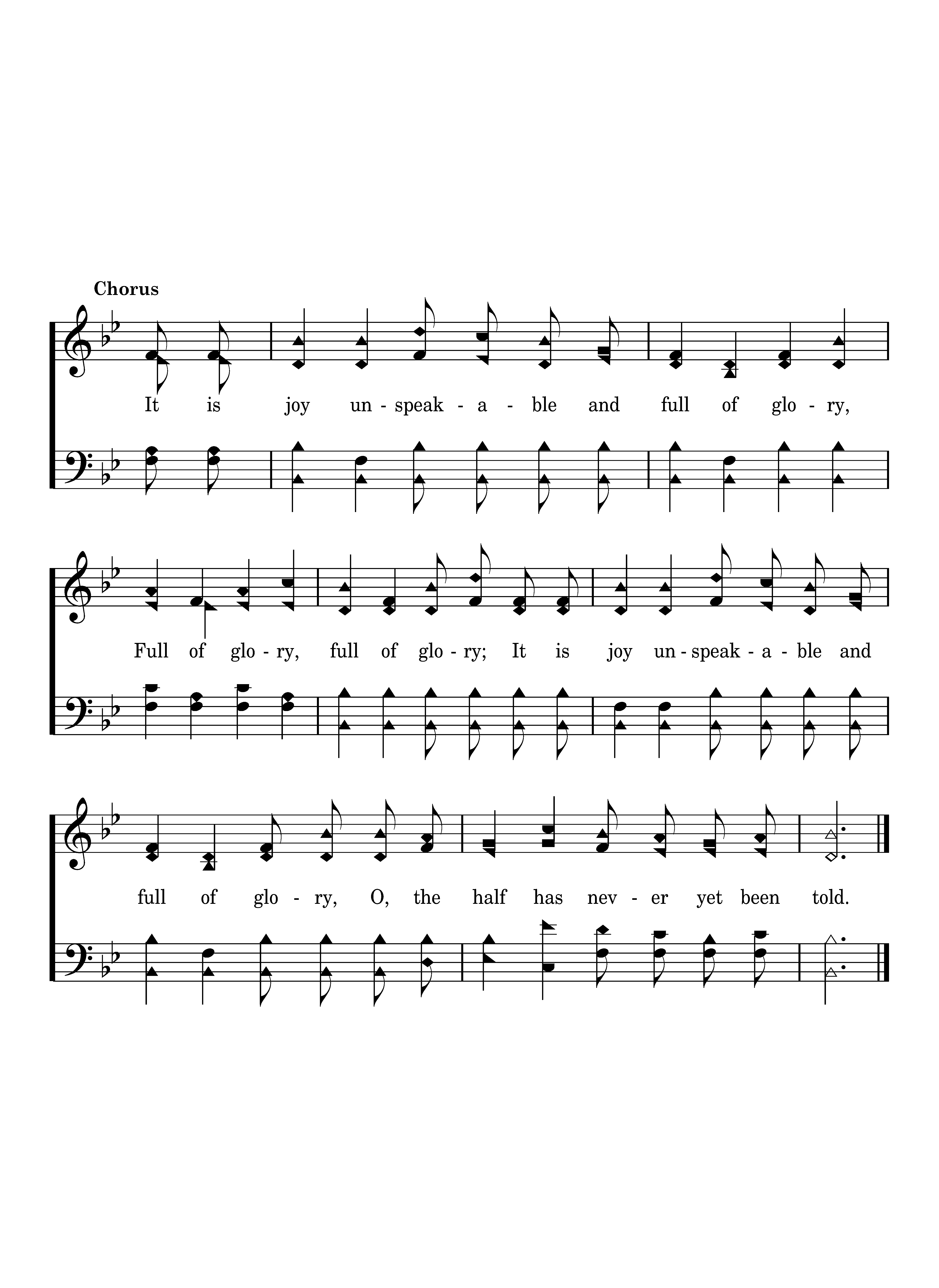 It is joy unspeakable and full of glory, Full of glory, full of glory; It is joy unspeakable and full of glory, O, the half has never yet been told.