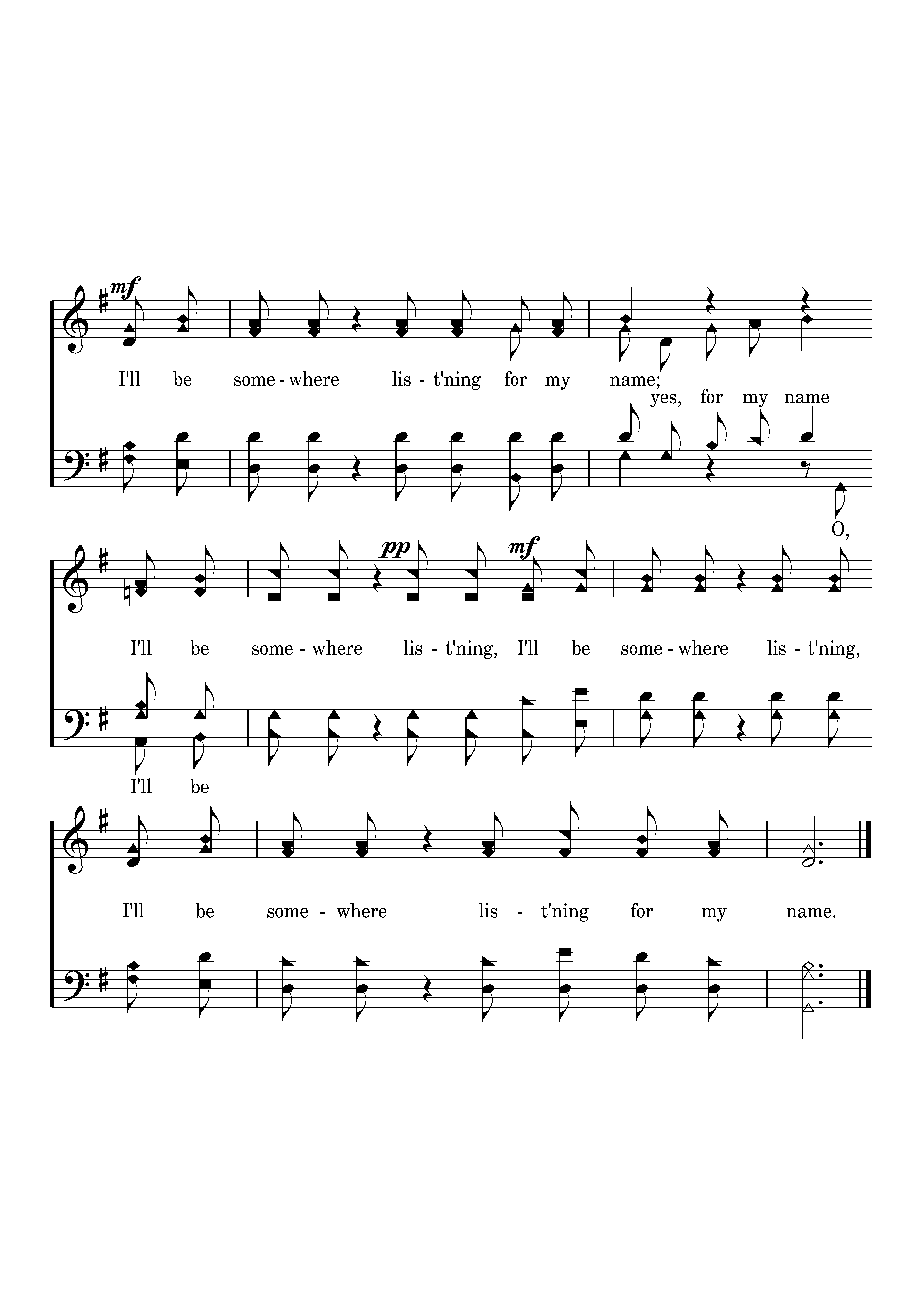 I'll be somewhere list'ning, I'll be somewhere list'ning, I'll be somewhere list'ning for my name, yeas, for my name; I'll be somewhere list'ning, I'll be somewhere list'ning I'll be somewhere list'ning for my name.