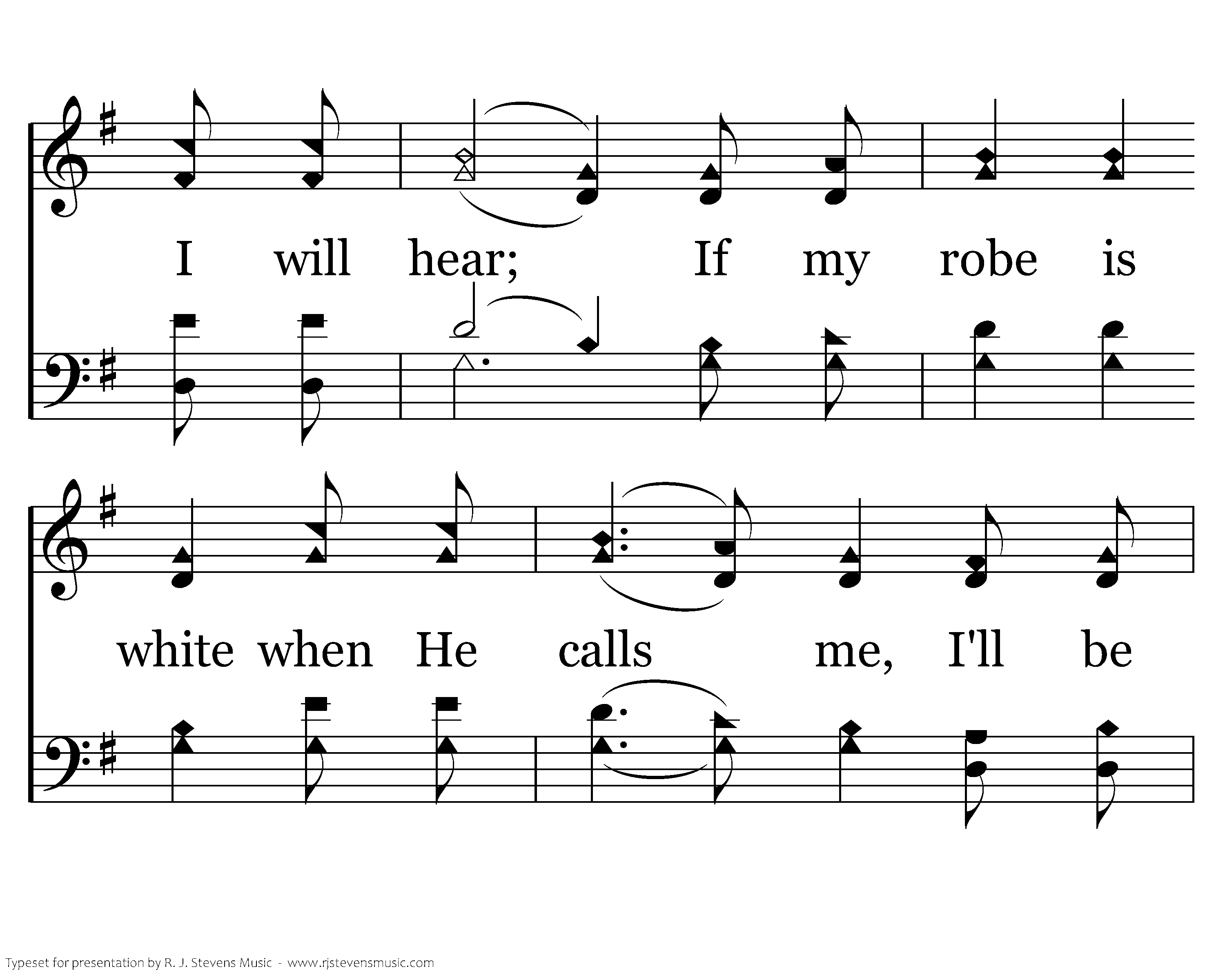 If my robe is white when He calls me, If my robe is white I will hear; If my robe is white when He calls me, I'll be somewhere list'ning for my name.