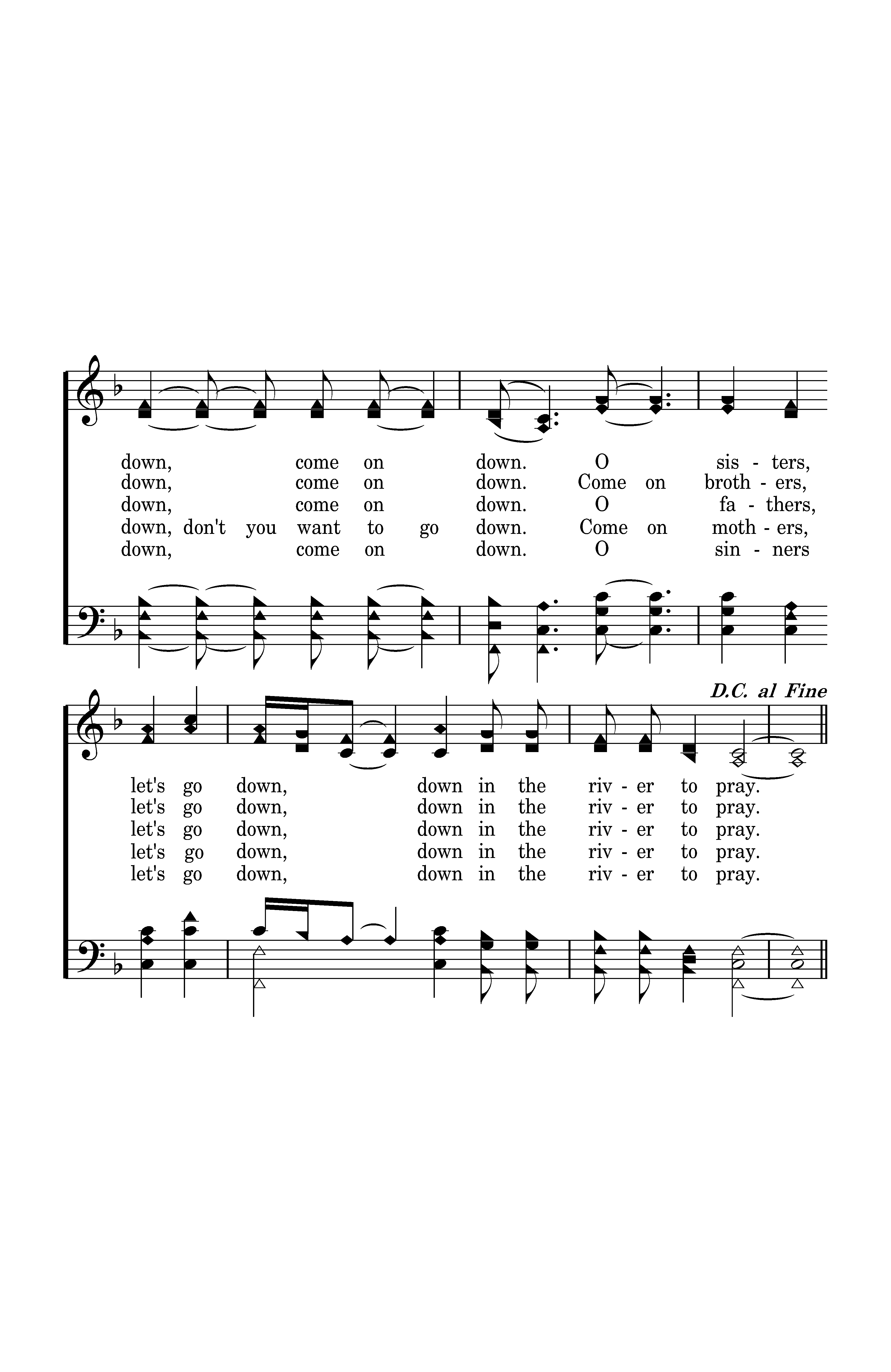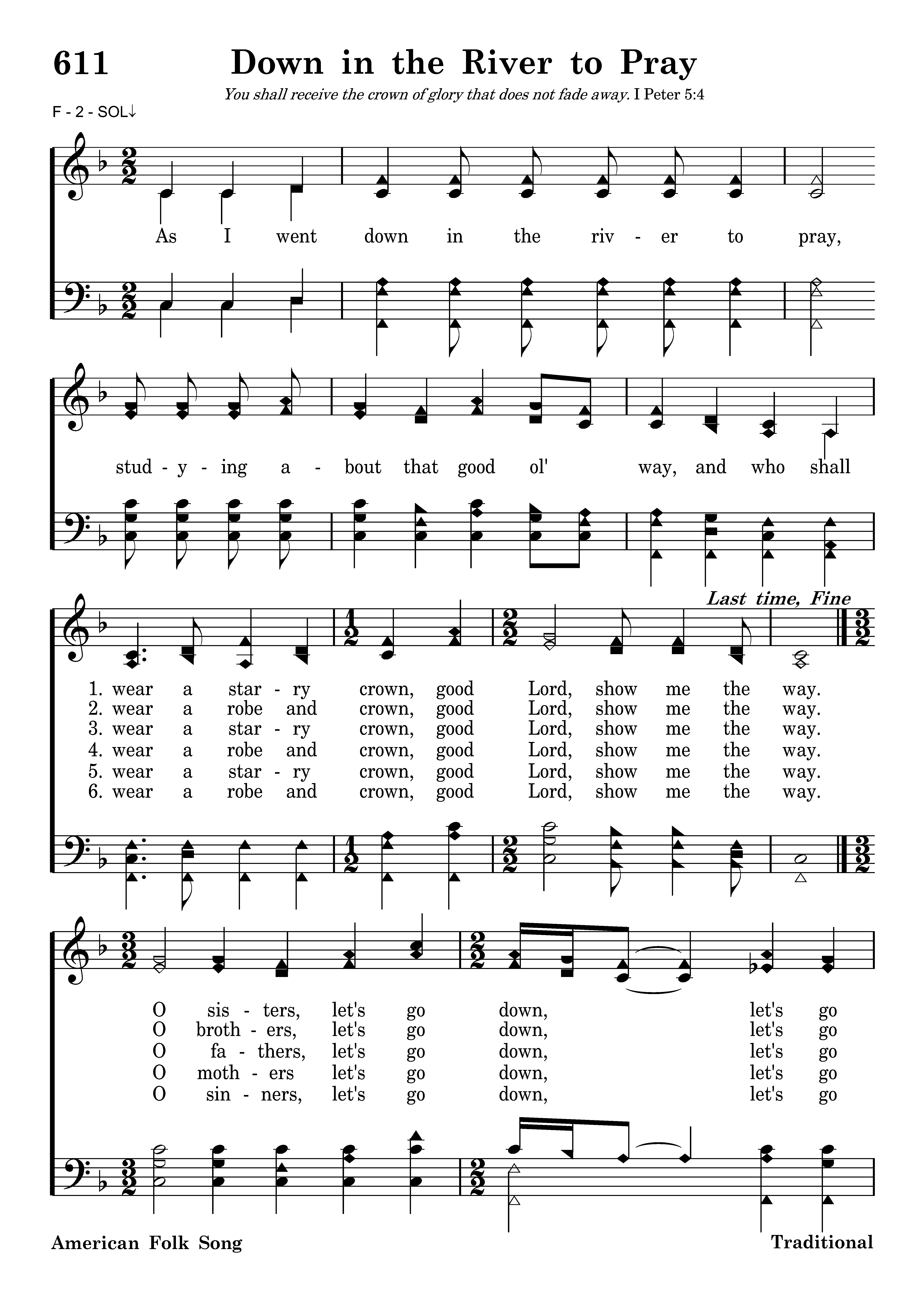 wear a starry crown, good Lord, show me the way. O fathers, let's go down, let's go down, come on down. O fathers, let's go down, down to the river to pray.