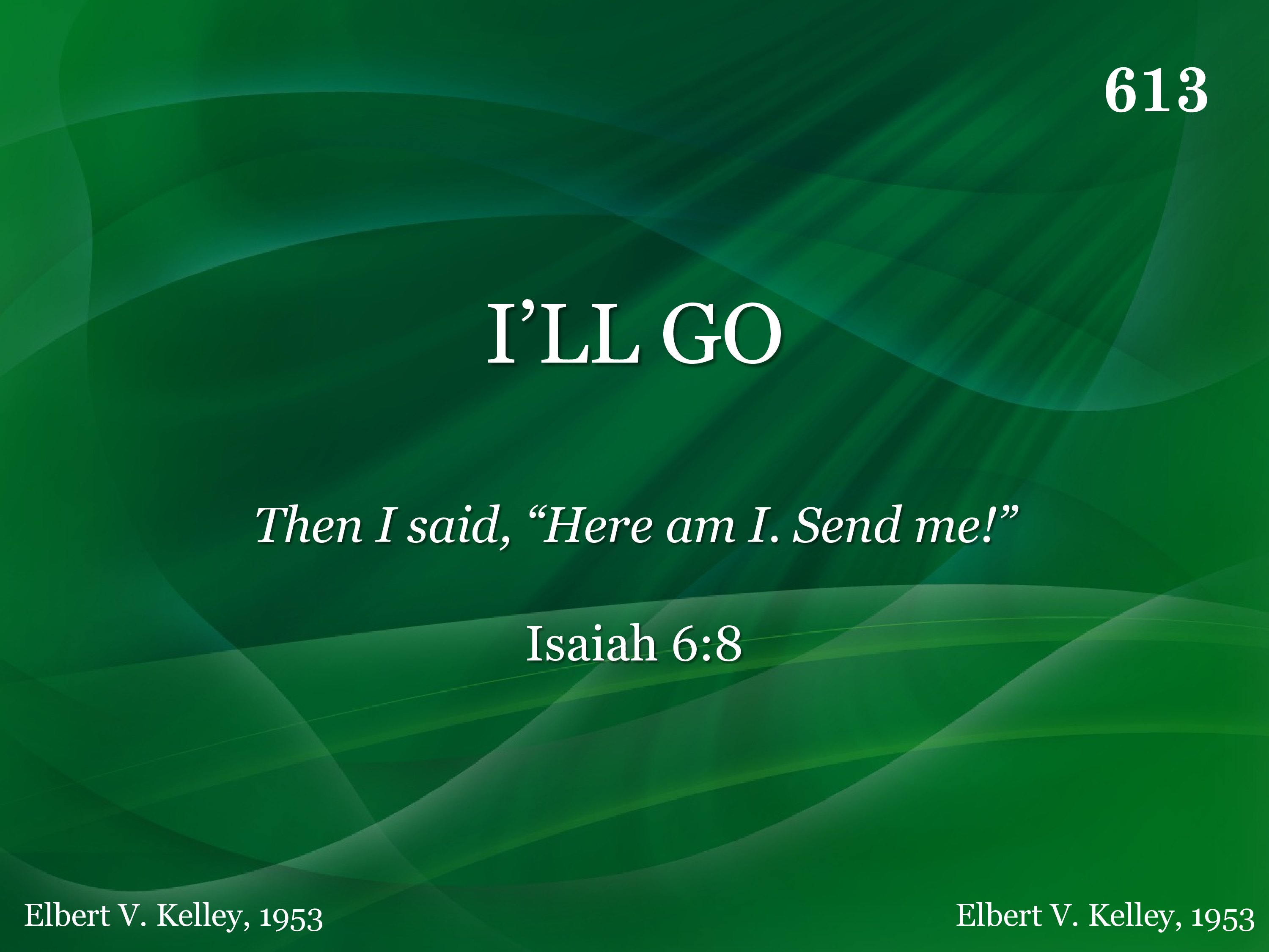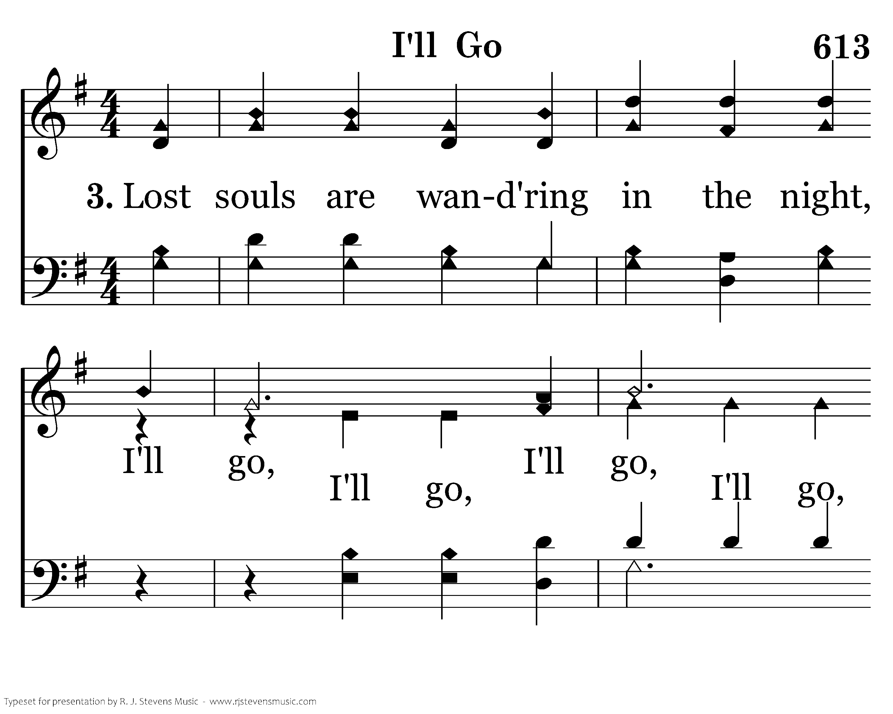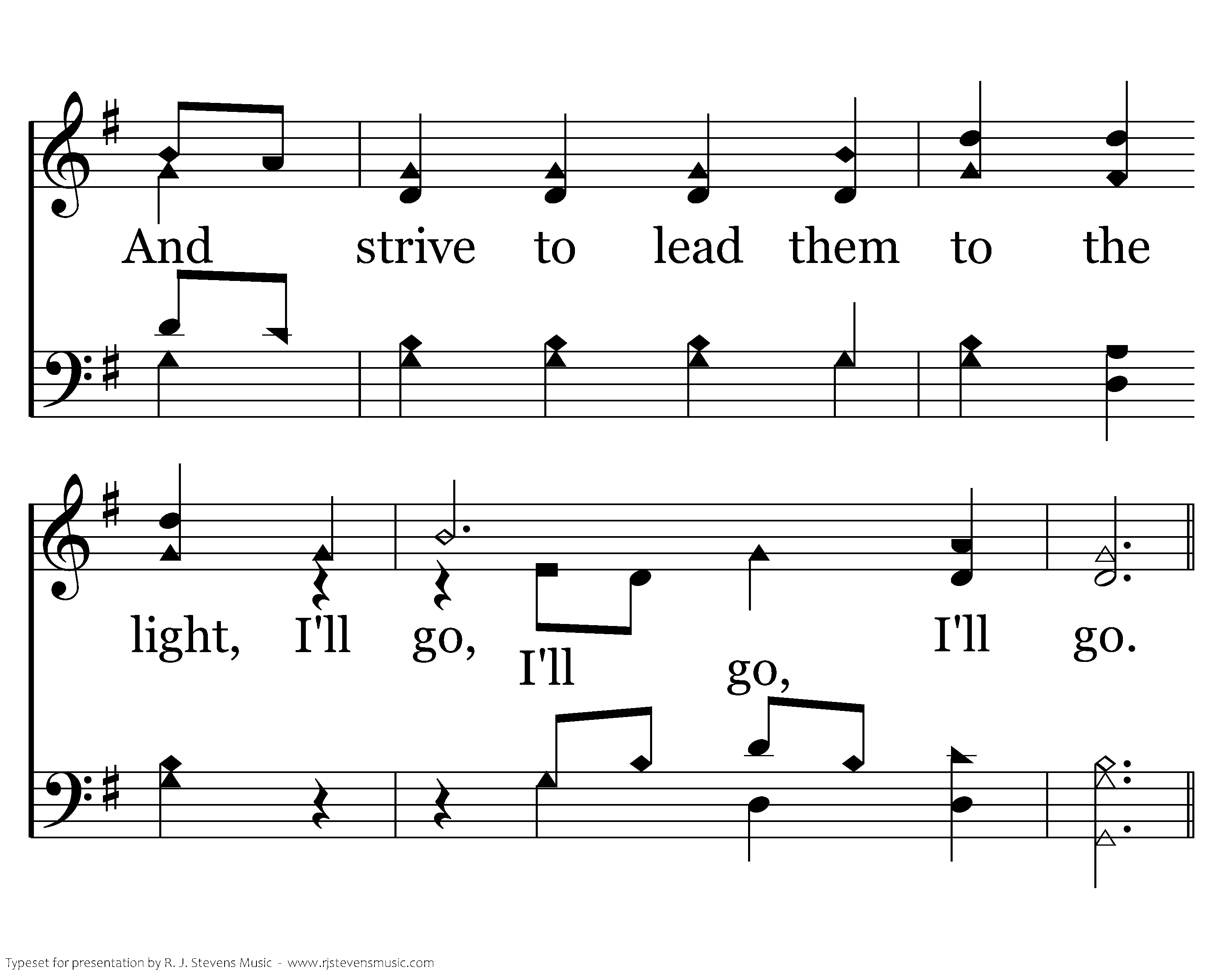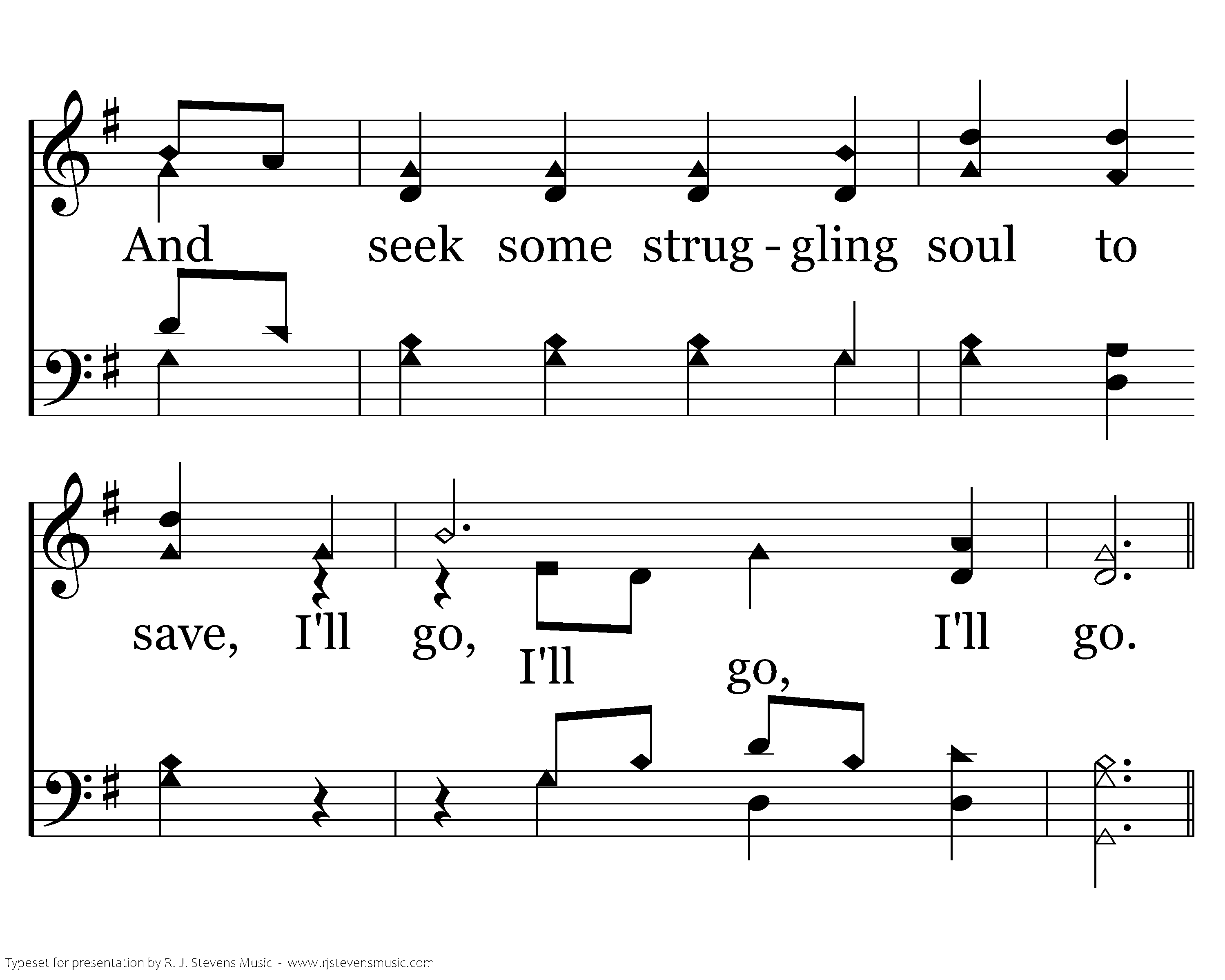 Lost souls are wand'ring in the night, I'll go, I'll go, And strive to lead them to the light, I'll go, I'll go.